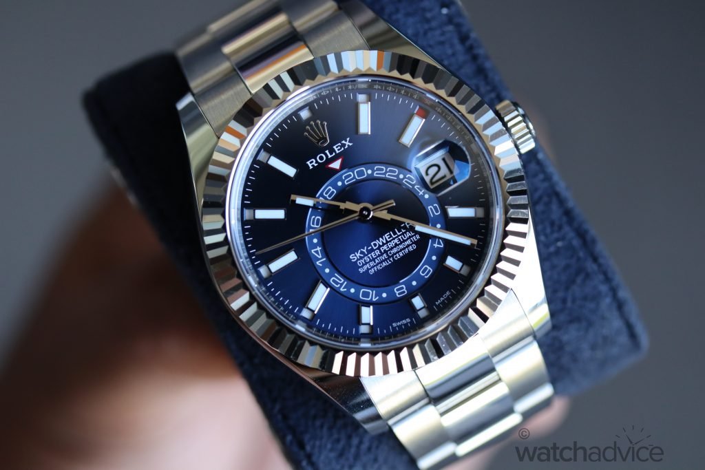The Sky-Dweller comes in a variety of metals and colour choices. It is available in stainless steel, white gold, yellow gold, and everose gold. The dials are also offered in blue, black, gold and dark rhodium tone. All bracelets and cases are made from the Rolex’s signature Oystersteel. In terms of wearability, the Sky-Dweller can be suited for almost any occasion (besides deep-diving, which Rolex has other models for). With a case diameter of 42mm and thickness of approximately 14mm, the watch is not too bulky for everyday use. The watch is designed for travellers, making it suitable for casual and business wear