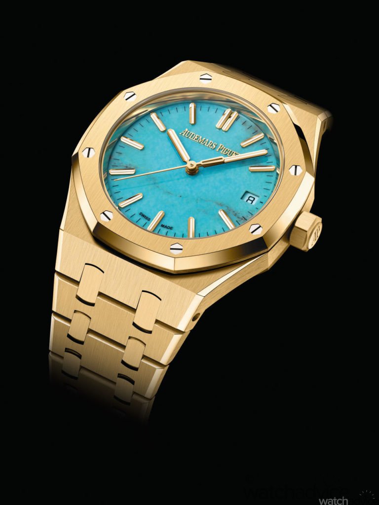 Audemars Piguet has unveiled a first-off for the brand with the release of a new Royal Oak Selfwinding yellow gold with a stunning natural turquoise dial. This combination of precious metal and stones gives this timepiece a radiant aesthetic look. Helped further by Audemars Piguet’s fine craftsmanship and finishing. Turquoise has been used in jewellery for the past 3000 years, and while being a rare stone, it also represents a wealth of positive attributes, making it a perfect fit for the Royal Oak collection.