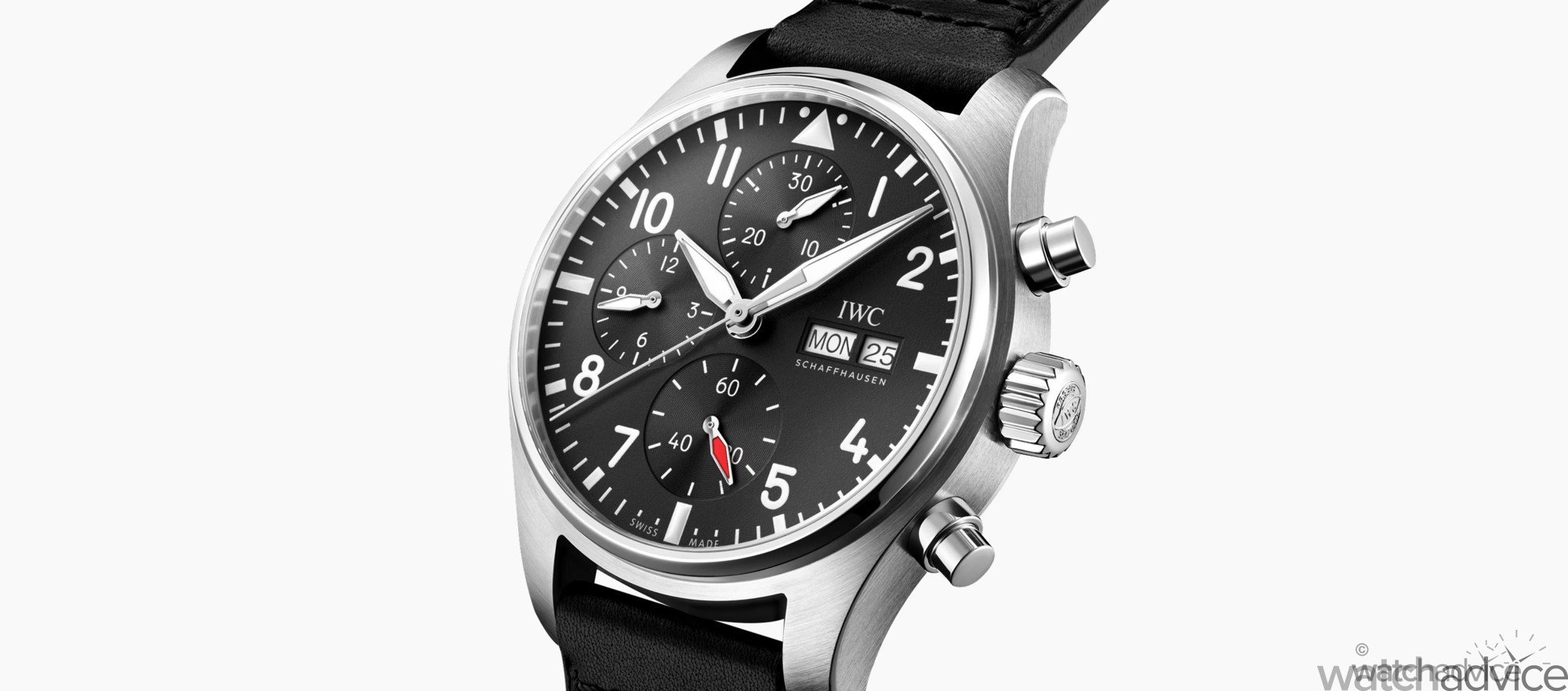 Just like the other variants, the dial features the iconic design in the style of an easy-to-read cockpit instrument design that has become the hallmark of IWC’s Pilot’s Watches. The stopped minutes are displayed at 12 o’clock and the minutes at 9 o’clock. In addition, the chronograph also features a day and date aperture at 3 o’clock and a small seconds display at 6 o’clock.
