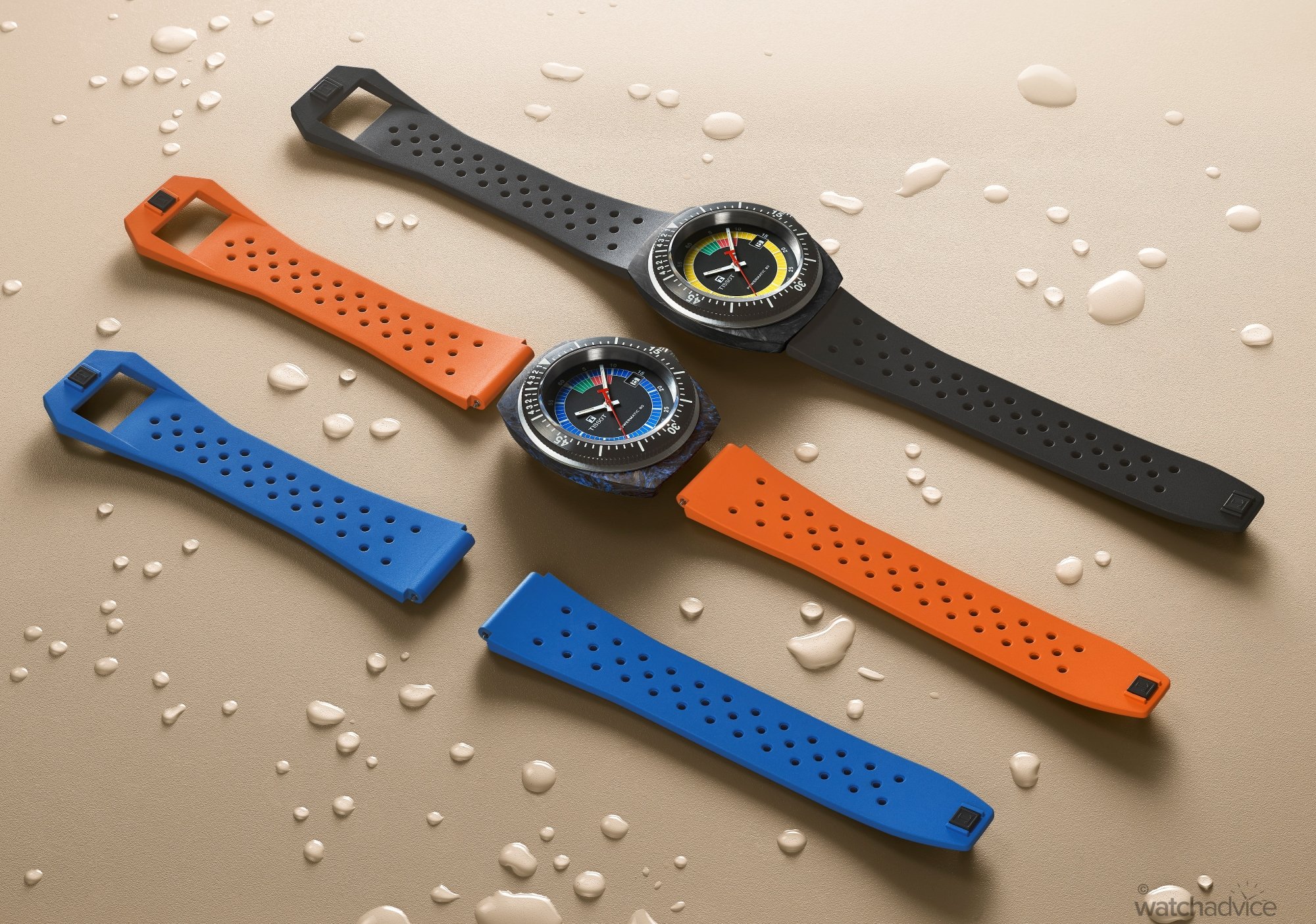 The original case was made from fibreglass, a robust and lightweight material for it’s time. The 2023 version now is made from forged carbon with black PVD unidirectional bezel, an equally tough and lightweight material that gives the watch a unique sporty and rugged look. The dial showcases a multi-coloured luminescent animation and a regatta countdown gauge design in green and red, capturing the retro 70s aesthetic.