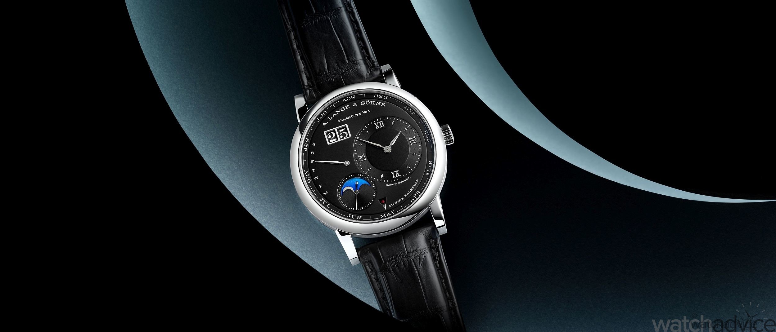 A. Lange & Söhne first launched their Lange 1 Perpetual Calendar in April 2021 with 2 variants. A White-gold model version with a solid pink-gold dial, limited to 150 pieces, and a pink-gold version featuring a grey solid-silver dial. These two pieces are now joined by a platinum model with a black dial, and provides for an elegant contrast for the moon-phase display and its integrated day/night indicator.