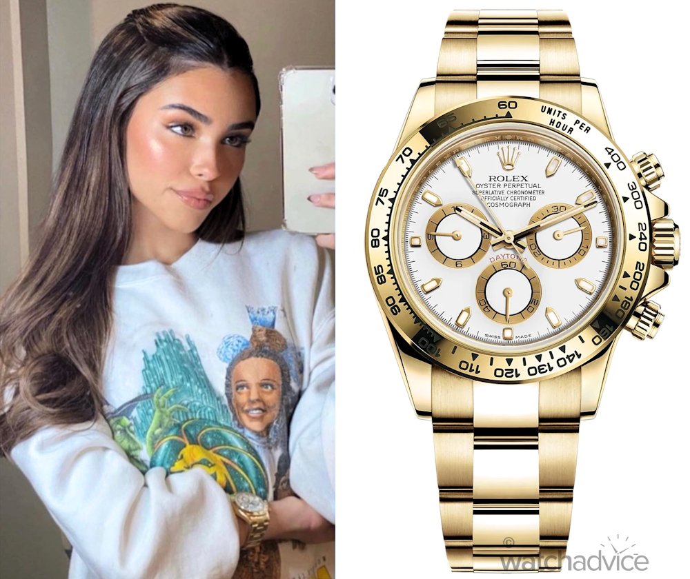 Most of Madison Beer’s watch collection features timepieces in precious metals and ranges between Rolex and Cartier. Her favourite piece seems to be the Rolex Daytona ref. 116528 yellow gold with white dial, as she has been spotted on numerous occasions with this model. Her collection is a testament to timepieces not being gender restricted, as she wears some of the “larger” men’s models quite comfortably on her wrist. Read through below to see what other models make up Madison Beer’s watch collection!