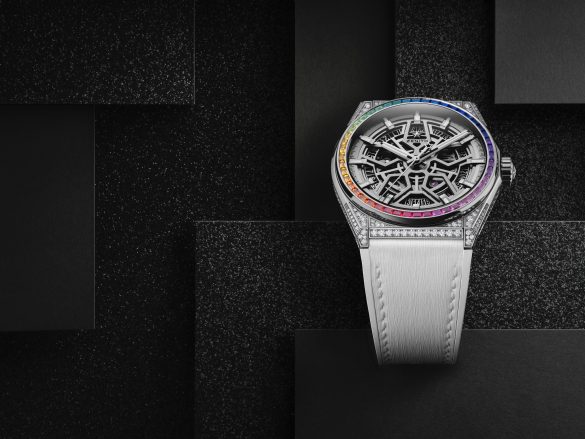 The second variation of the Defy Classic High Jewellery follows the same path as the Defy El Primero 21 in which it has been given a rainbow effect with the sapphires. The case has brilliant white diamonds finished in the same layout as the first Defy Classic High Jewellery edition. The bezel is where the watch really comes to life with colour, as it gets given 48 unique baguette cut sapphires arranged by colour graduation. To make the bezel the centrepiece of this Defy Classic High Jewellery edition, the dial has been given a white backdrop. The star shaped pattern has a white finish, with the minute track also given a more Grey look rather than the blue from the original. The effect of this is that the snow flake style dial has been given a brilliant colour finish with the rainbow sapphire bezel.