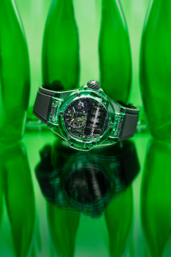 Hublot’s innovative curiosity allowed them to make large investments in the industrialisation of the sapphire. Being one of the most challenging materials to manufacture, Hublot was able to produce sapphire in a variety of colours which included transparent, black, yellow, blue and red. A road-block they faced, however, was offering an emerald green in the sapphire material due to the complexities involved in its creation. It’s safe to say this didn’t stop the brand from trying, with Hublot exploring many different avenues to be able to come up with a solution.