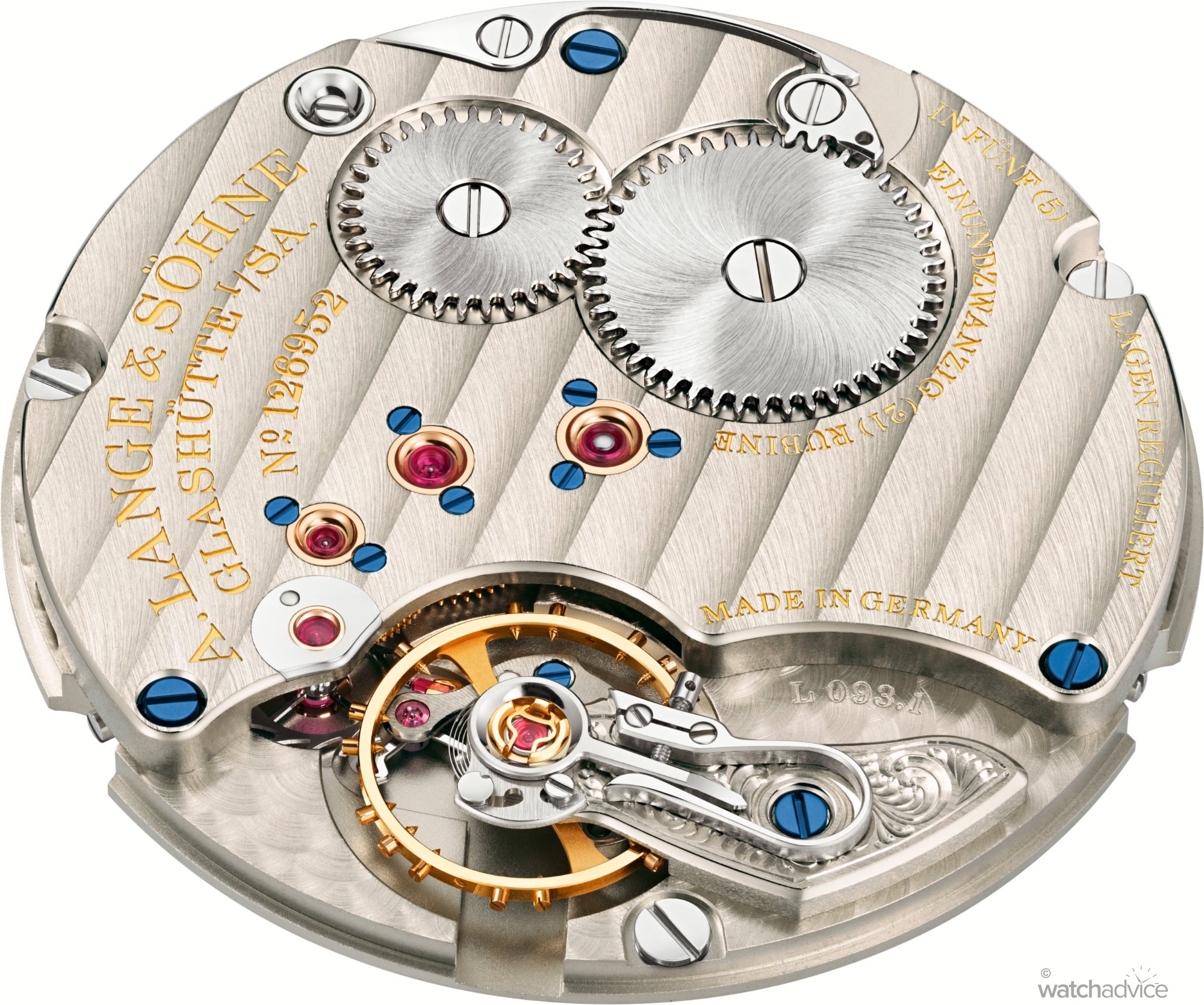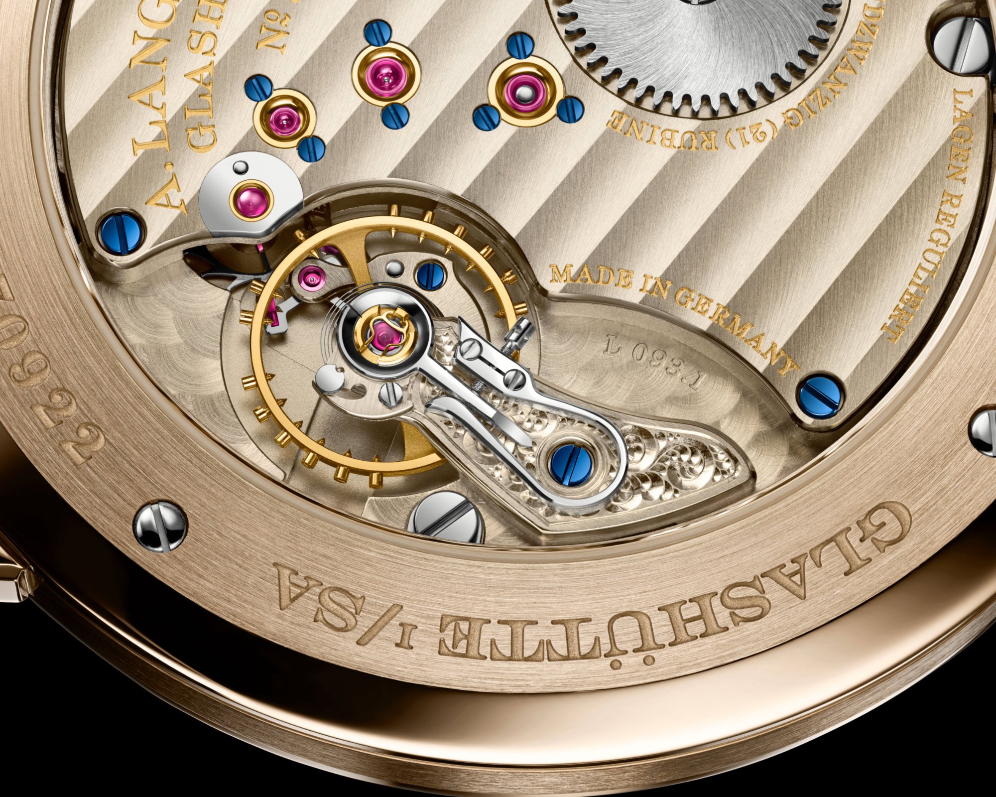 The L093.1 is a manual winding calibre, adjusted in five positions and with a 72-hour power reserve. it beats away at 3Hz / 21,600 VpH and is set on 21 jewels with 167 components. The balance cock is shock-resistant thanks to the screwed down design, and the balance spring is, unlike many brands, manufactured in-house by A. Lange & Söhne.
