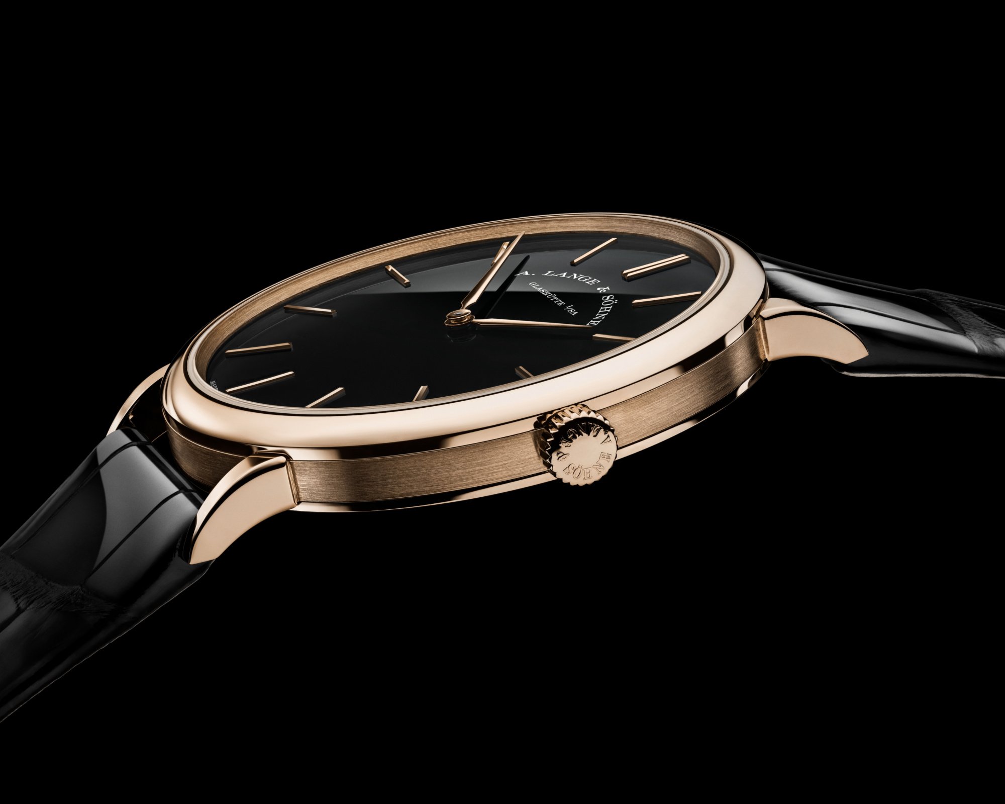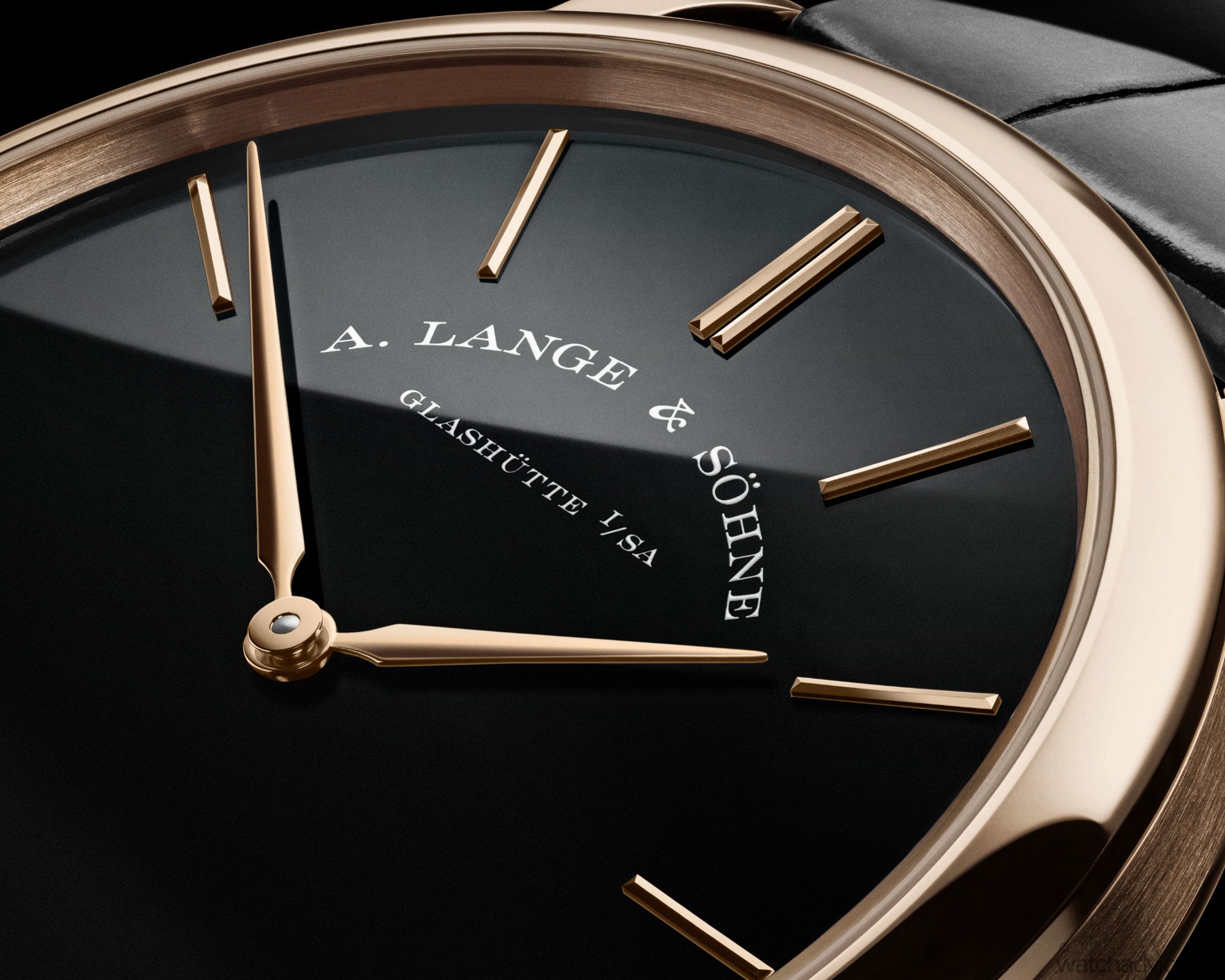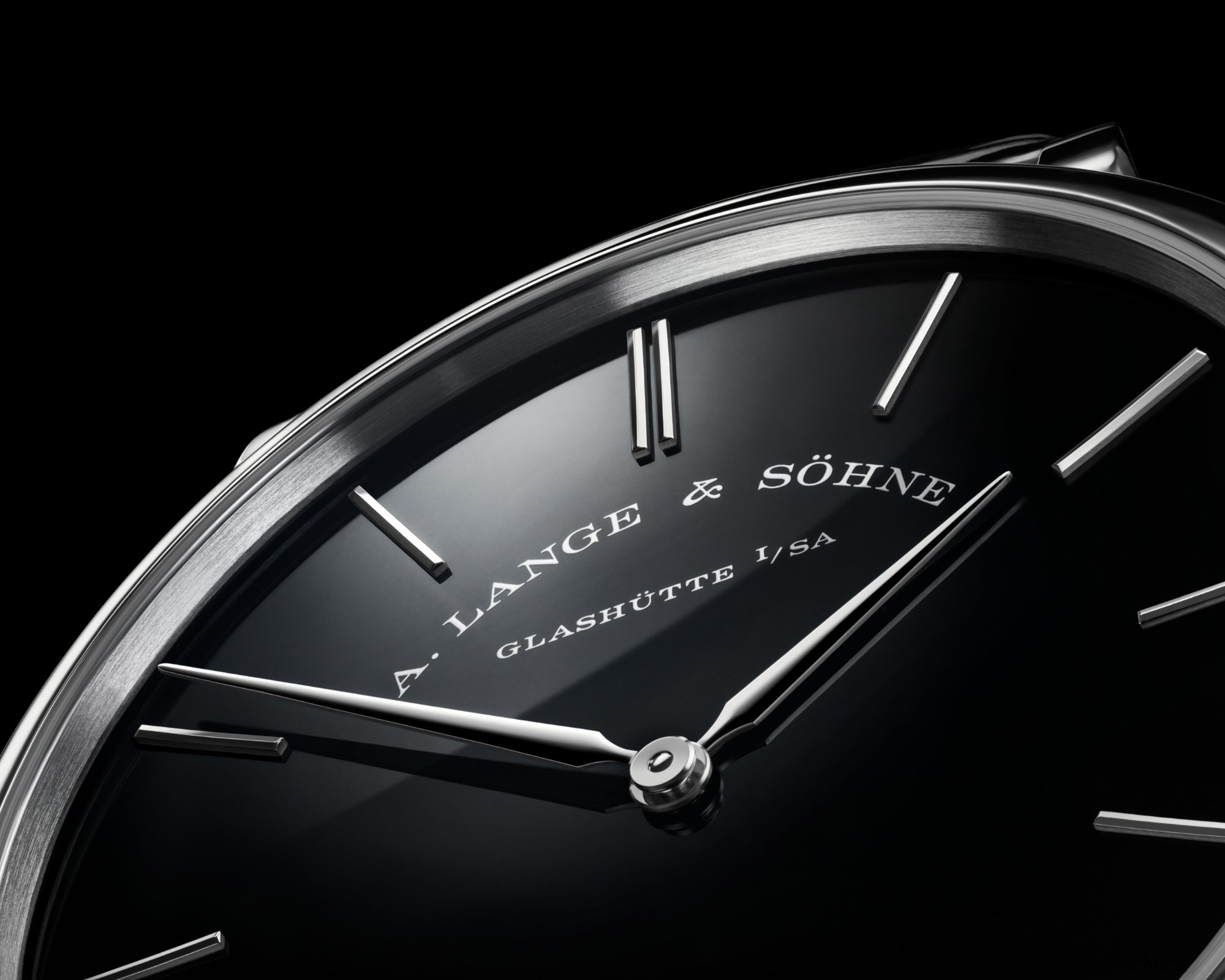 What sets these models apart from the current lineup, aside from the HONEYGOLD® and Platinum, is the dark gloss black dials made from silver and onyx. 925 Silver is used as the base of the dial, which is then faced with black onyx, giving each watch a jet-black, glossy finish. Contrasting the dial are applied indices in 18k Gold (red and white), which are Rhodium-plated, as are the hands of each Saxonia Thin.