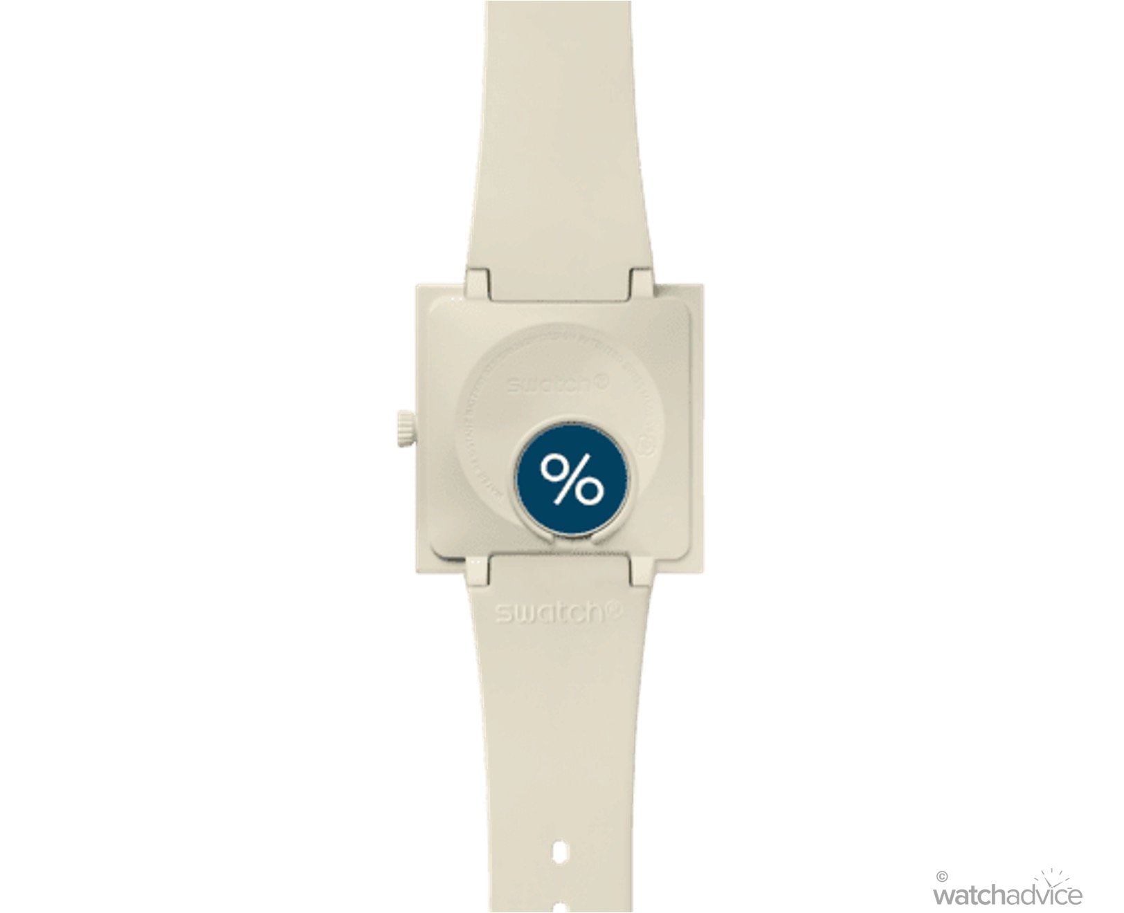 The 39% takes that political context and distils it into satire. Measuring 41.8mm wide, 33.25mm long, and 10.5mm thick, its sharp square case is made from off-white Bioceramic paired with a matching silicone strap. The material, now familiar to Swatch fans, combines two-thirds zirconium oxide ceramic powder with one-third biosourced material from castor oil. First showcased in collaborations with Omega and Blancpain, Bioceramic delivers surprising strength, smoothness, and colour versatility — making it the perfect medium for playful statements like this.