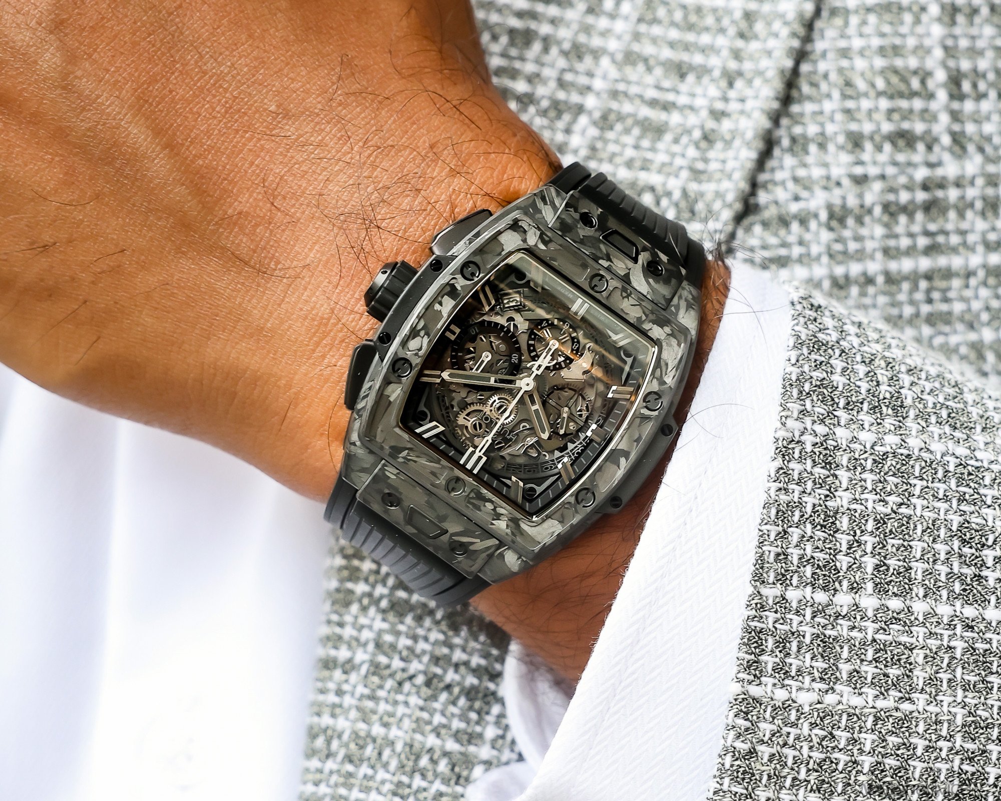 Frosted Carbon first made its appearance in the Spirit of Big Bang Tourbillon in 2019. Unlike the regular Spirit of Big Bang, the Tourbillon came with a 5-day manual winding calibre, made in-house, and with it, a unique look that both somehow stands out and flies under the radar at the same time. And while it hasn’t made its way into the collection (other than the special Veuve Cliquot Polo Edition of 30 pieces last year), it now has graced the Spirit of Big Bang Chronograph core collection.