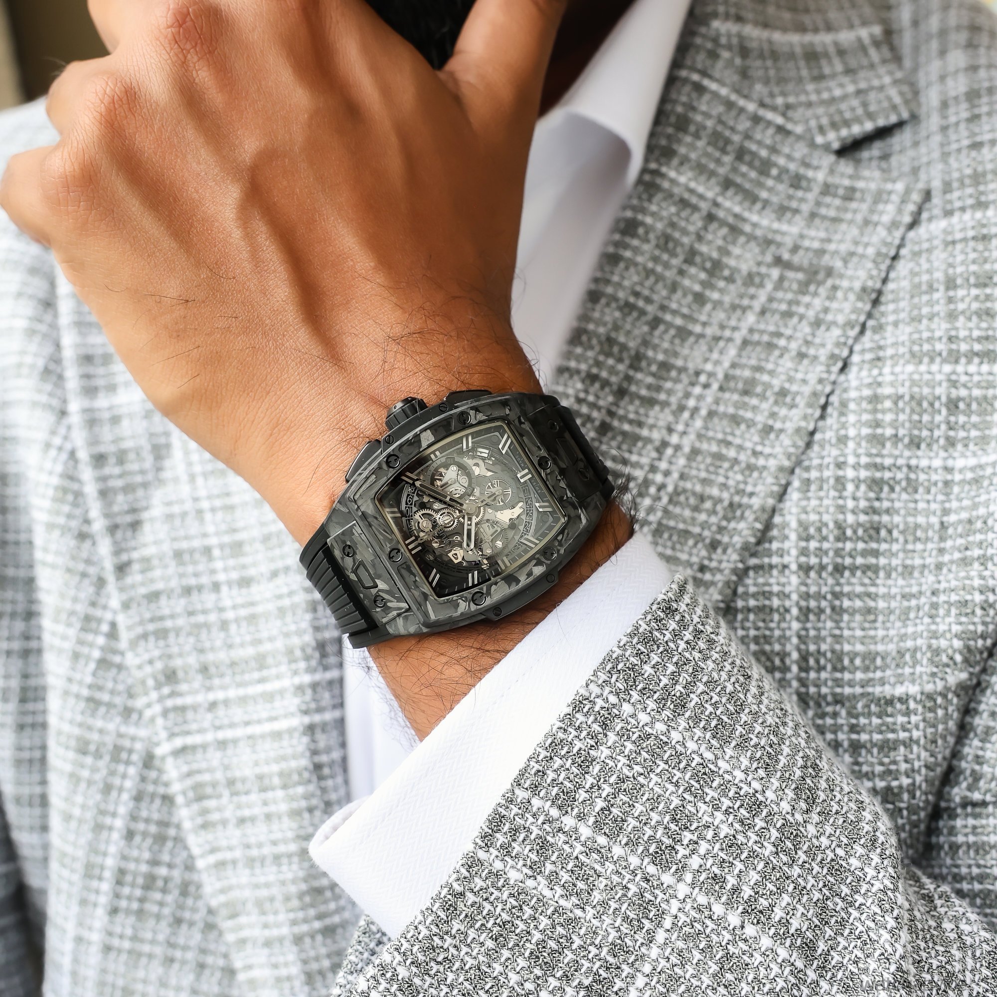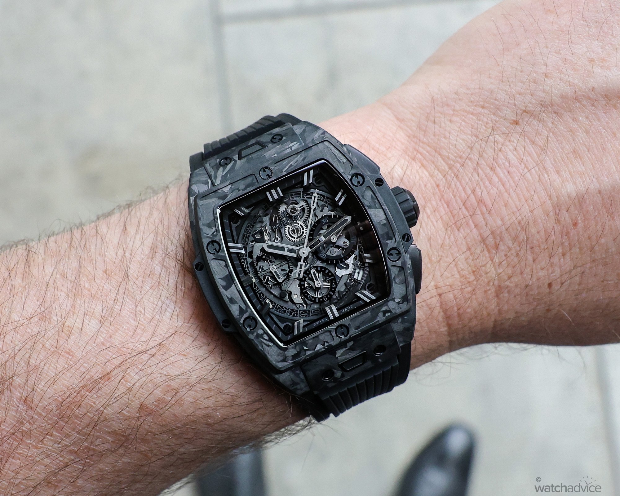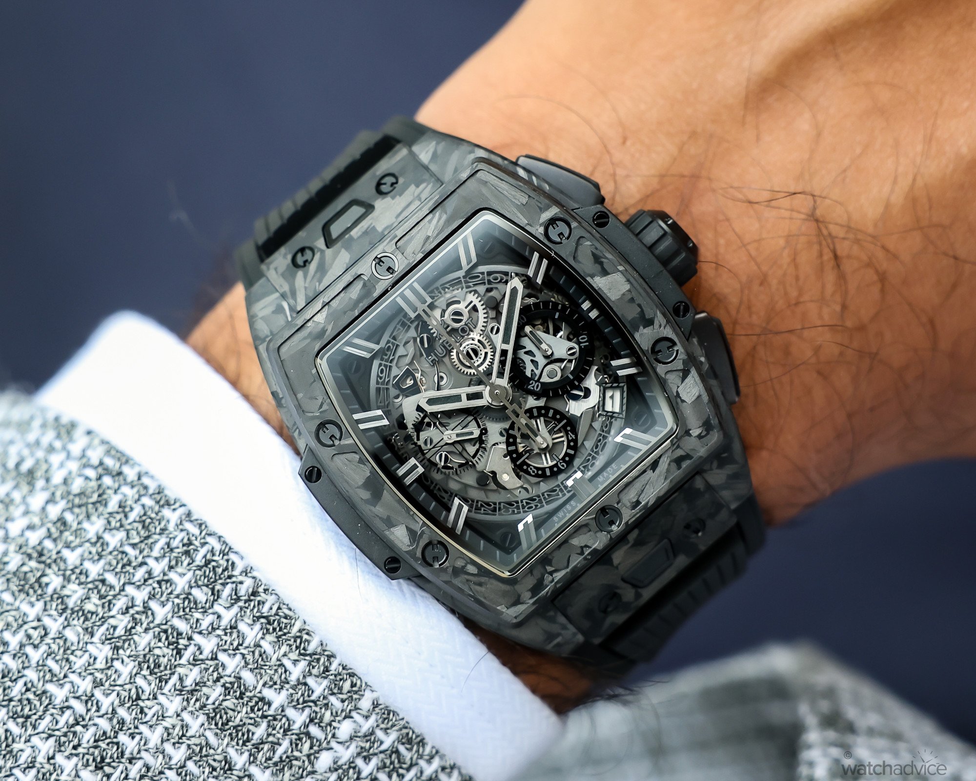 For those wondering, Hublot’s Frosted Carbon is a carbon-fibre composite made by combining carbon fibre with an epoxy resin matrix and micro-glass inclusions. That mix is pressed and cured into blocks or sheets (a process close to “forged carbon”), then CNC-machined into case components and finished to produce the frosted look you see here. Because of the way the carbon-fibre and micro-glass inclusions form, no pattern is ever the same, so it effectively makes each watch “unique” in that sense. It is also lightweight and tough, so it makes a great material for watch cases in terms of durability.