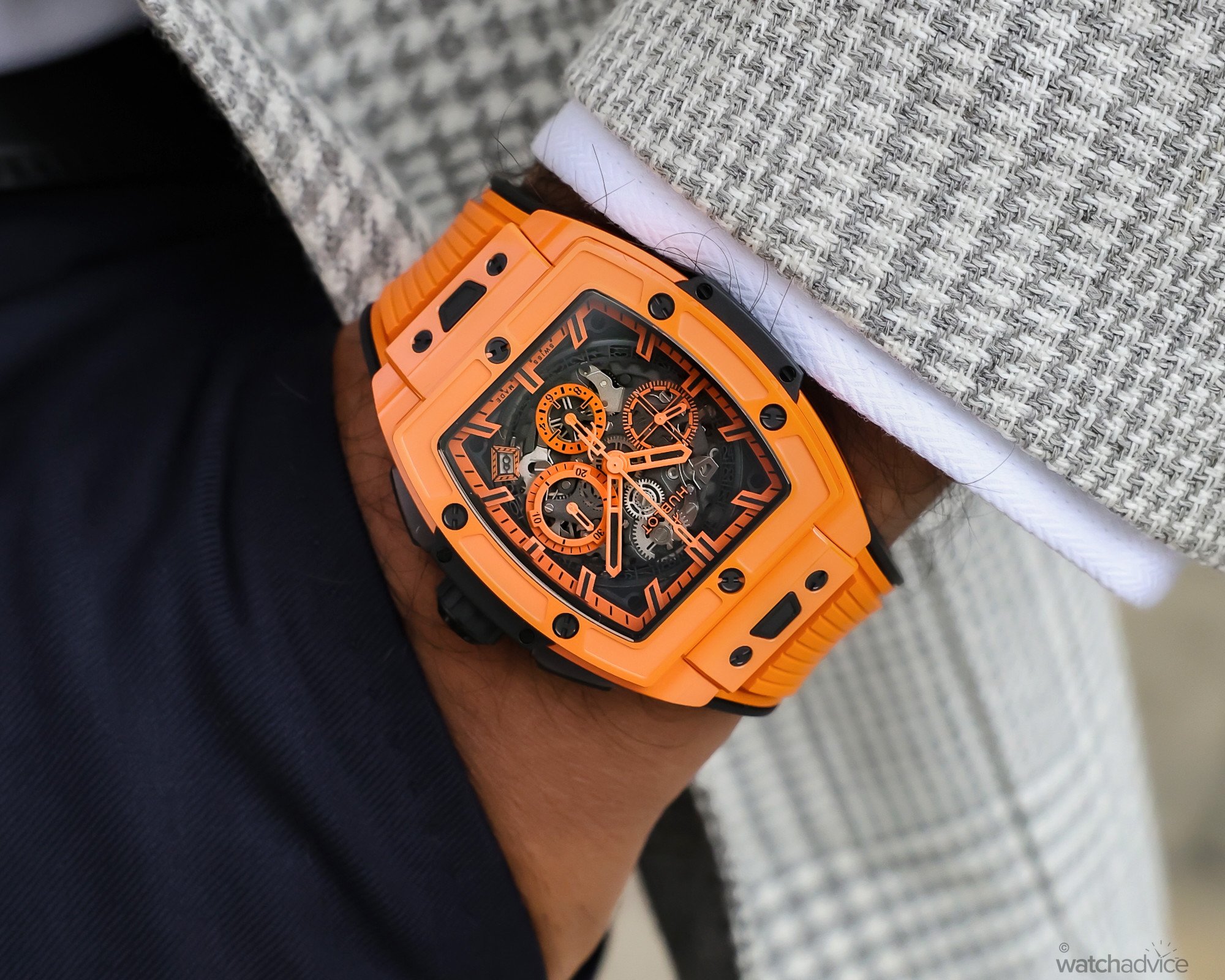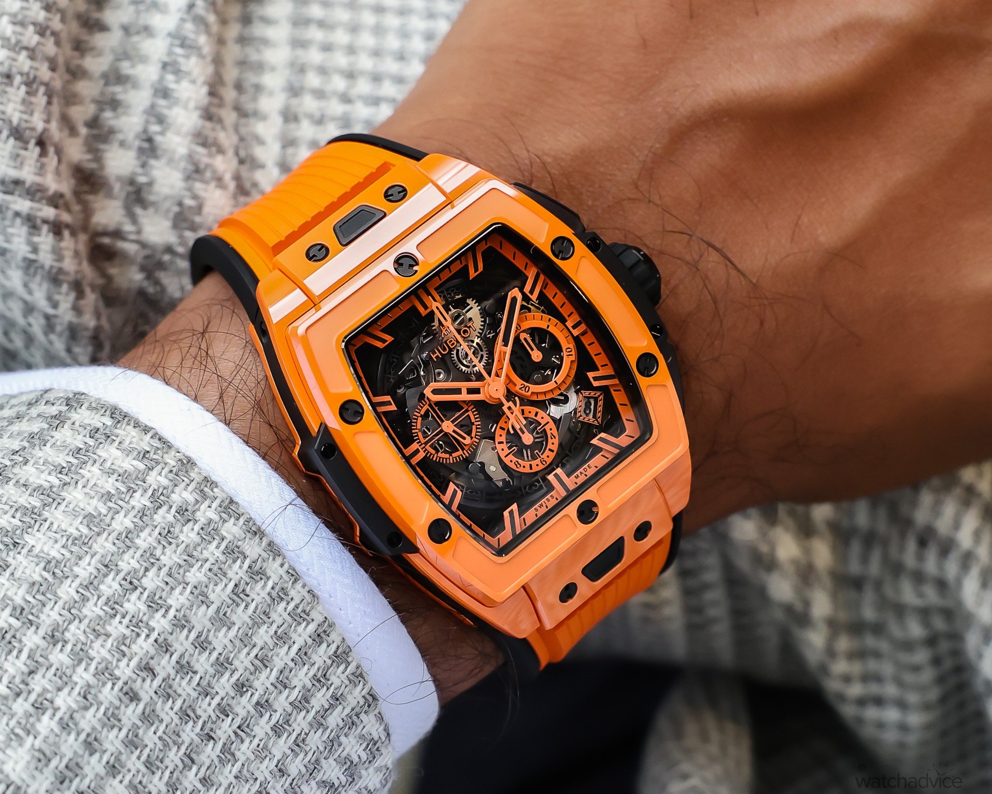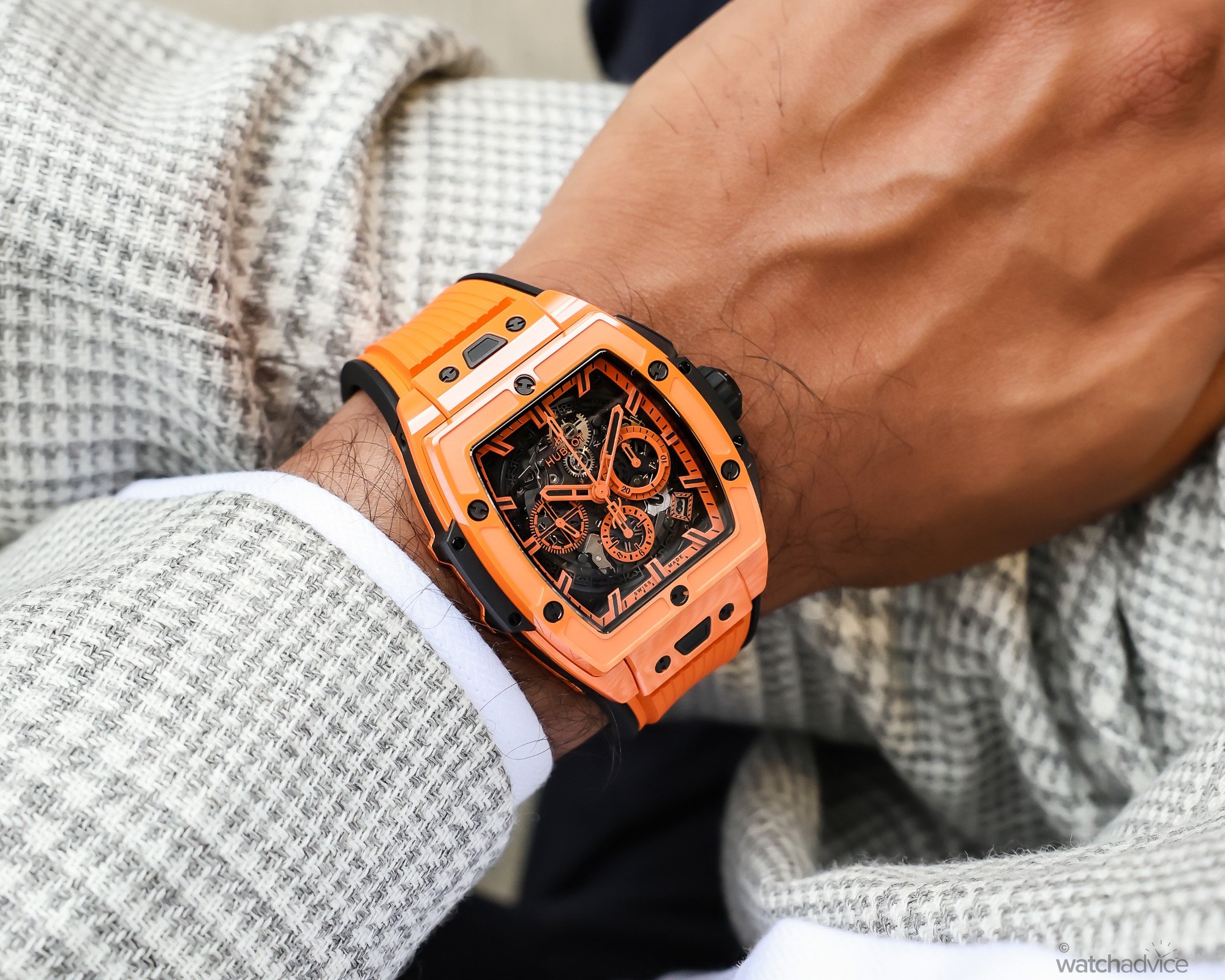 The Hublot Spirit of Big Bang collection has quickly grown on me. I’m not sure if it is the way they fit the wrist with the curved caseback and integrated rubber strap, or the way they look with the tonneau case shape, and openworked or skeleton dials, and movements, depending on the model. In any event, when I put one on the wrist, I can’t help but feel happy. The Spirit of Big Bang is a collection that makes me smile for whatever reason, and let’s face it, shouldn’t this be what watch collecting is all about? So, a few weeks ago, when in Geneva, Watch Advice had the chance to get a first-hand preview of the new collections coming out thanks to our friends at Hublot, and we’ve been waiting since to share them. And, here they are. Two new, and very different-looking Spirit of Big Bangs: One in a vibrant orange ceramic, a first for the collection, and one in a much more stealthy (and my favourite) Frosted Carbon.
