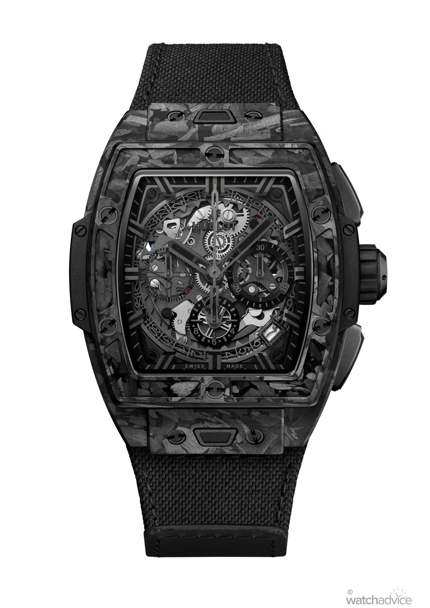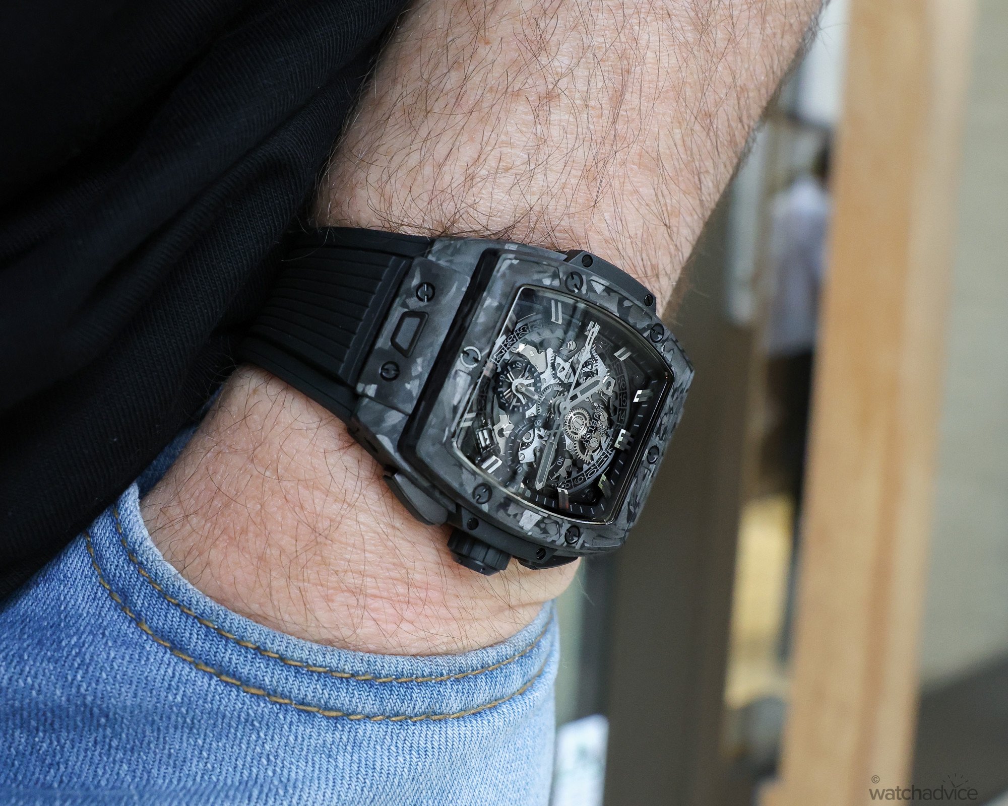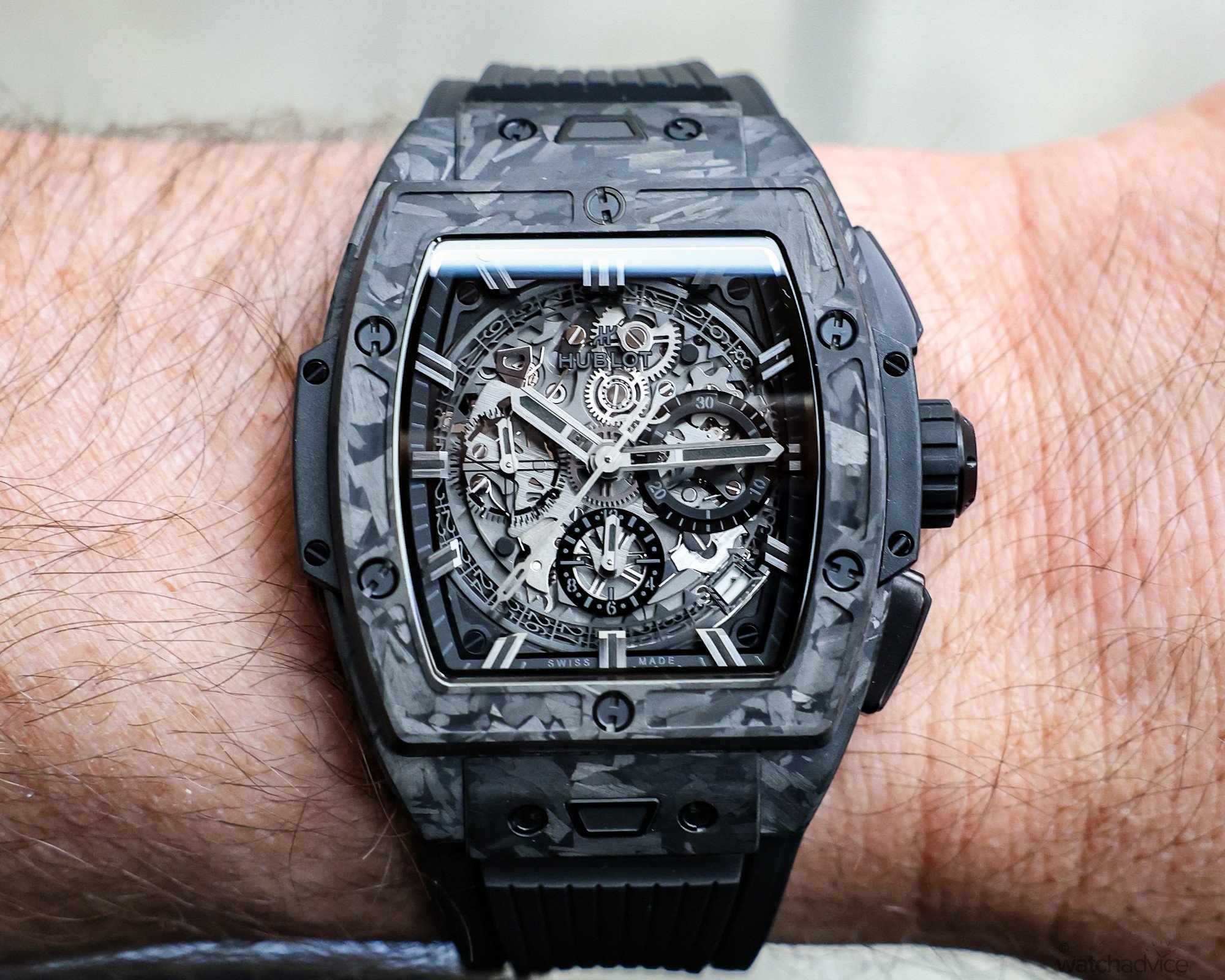 The Hublot Spirit of Big Bang collection has quickly grown on me. I’m not sure if it is the way they fit the wrist with the curved caseback and integrated rubber strap, or the way they look with the tonneau case shape, and openworked or skeleton dials, and movements, depending on the model. In any event, when I put one on the wrist, I can’t help but feel happy. The Spirit of Big Bang is a collection that makes me smile for whatever reason, and let’s face it, shouldn’t this be what watch collecting is all about? So, a few weeks ago, when in Geneva, Watch Advice had the chance to get a first-hand preview of the new collections coming out thanks to our friends at Hublot, and we’ve been waiting since to share them. And, here they are. Two new, and very different-looking Spirit of Big Bangs: One in a vibrant orange ceramic, a first for the collection, and one in a much more stealthy (and my favourite) Frosted Carbon.