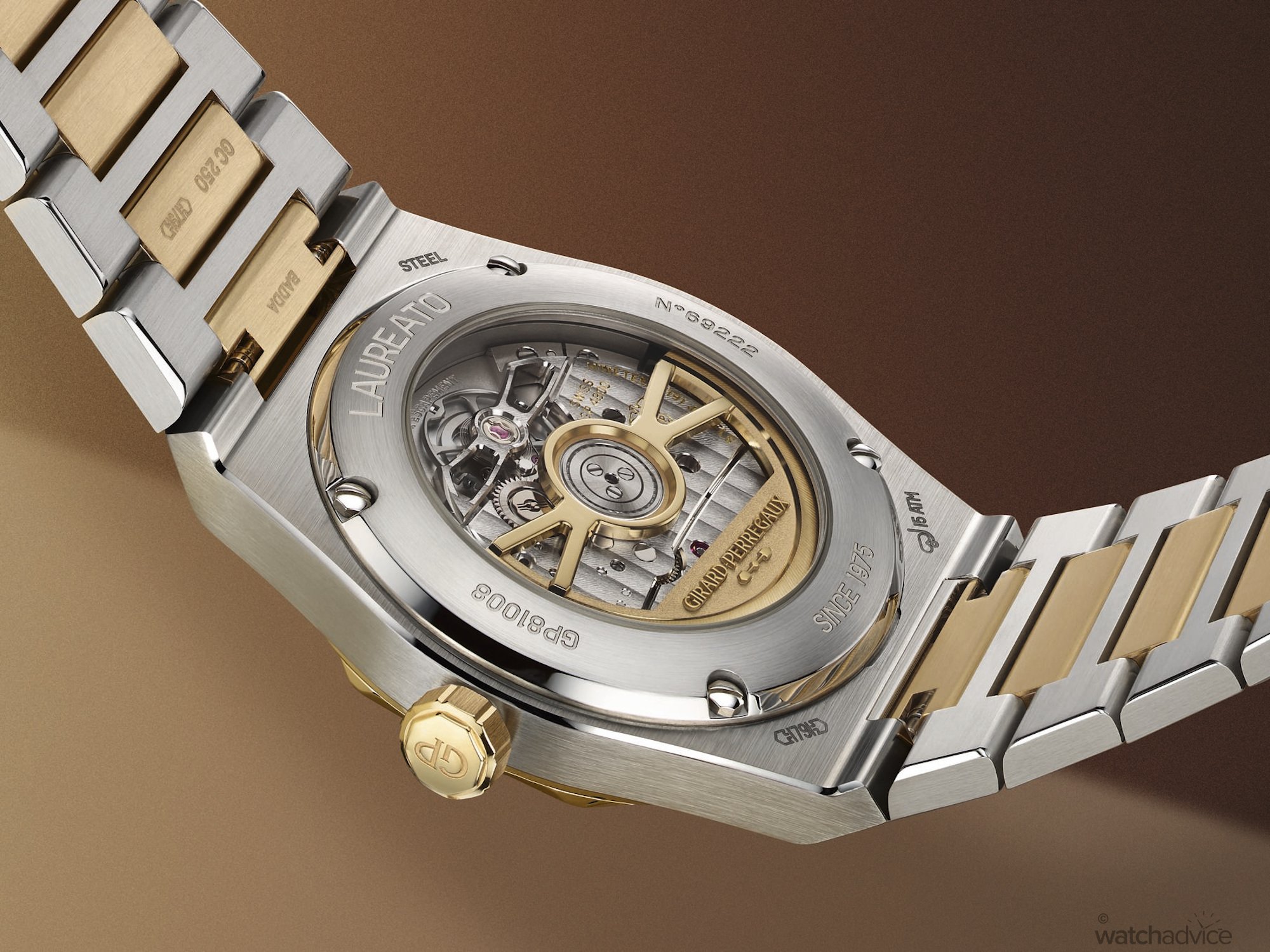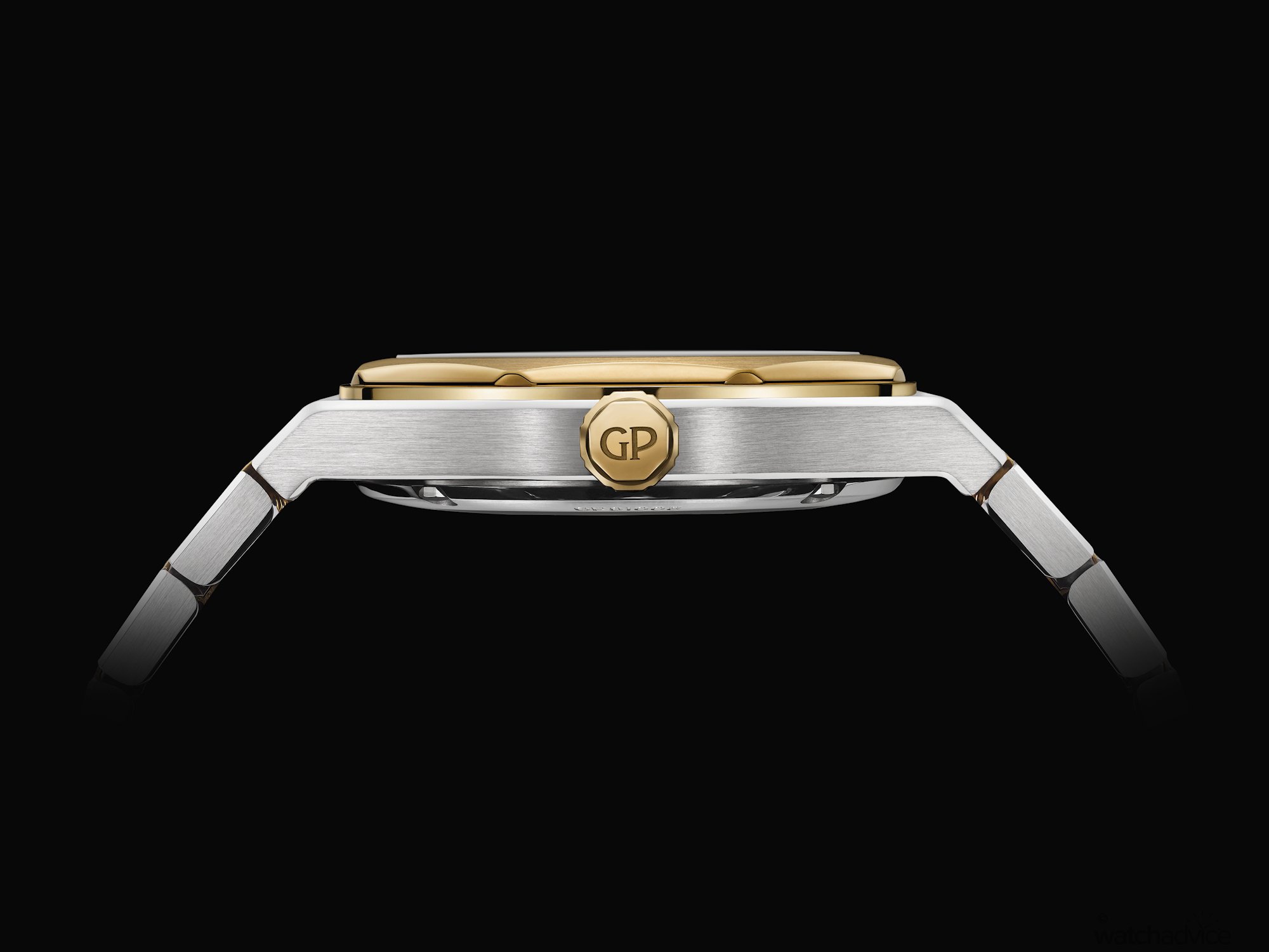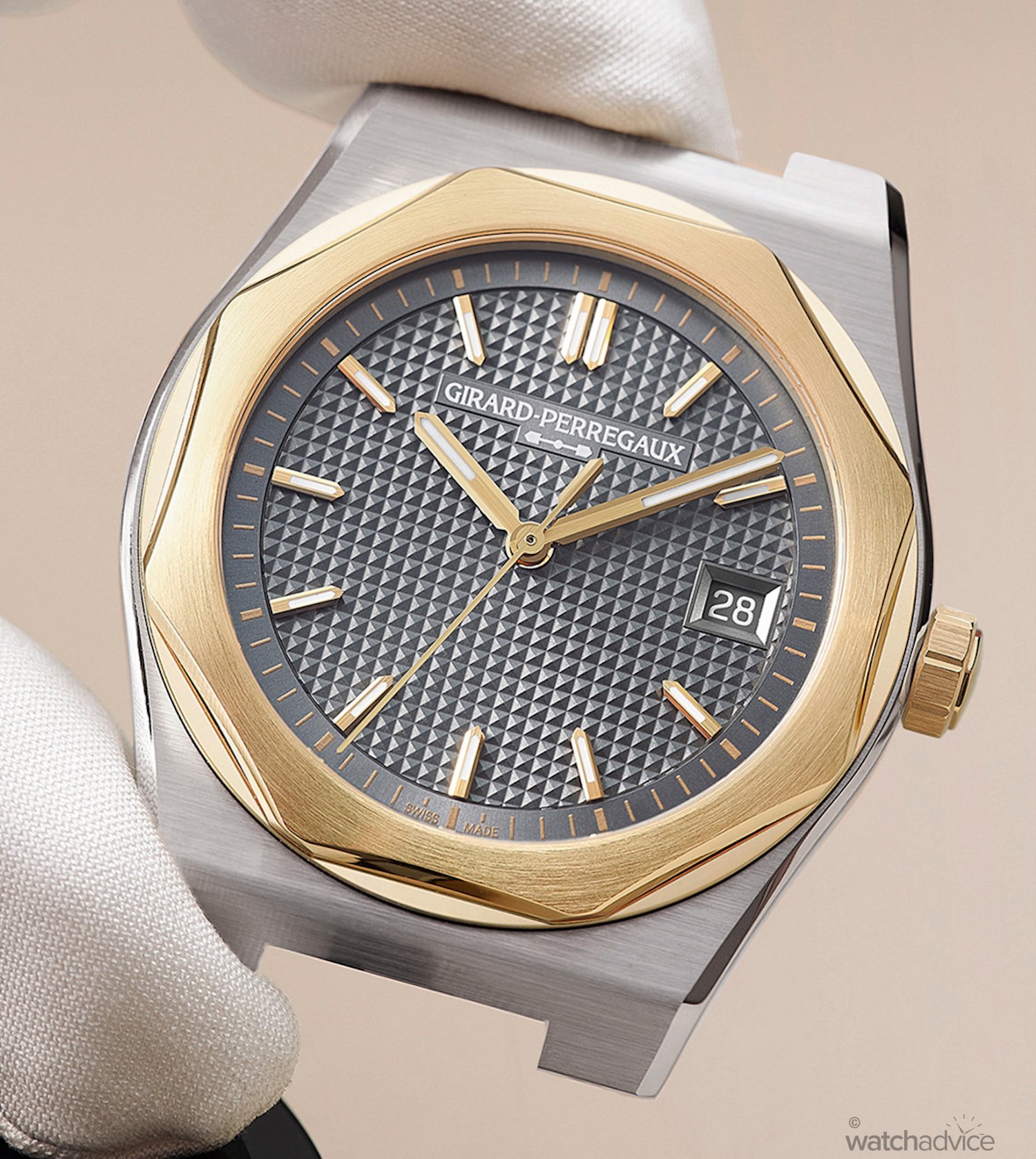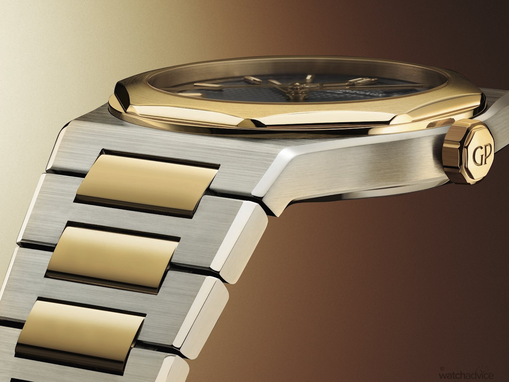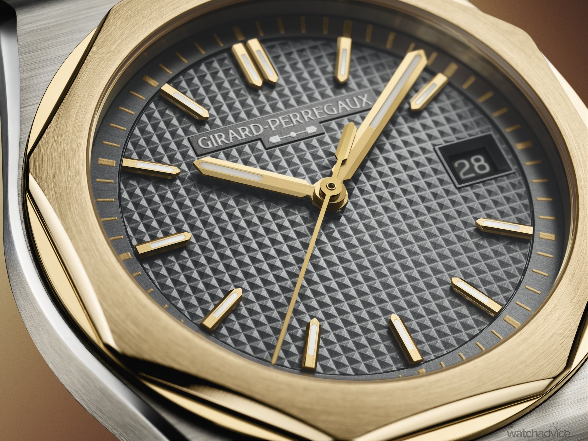 The refined case design of the Laureato FIFTY measures 39mm in diameter x 9.8mm thick, making this model sit in the middle of the current existing line-up of 38mm and 42mm editions. Where it does offer an advantage over the 38mm is that it’s slimmer in design. This will also be the first two-tone offering for Girard-Perregaux’s current catalogue, making it quite a special offering for the 50th anniversary celebrations. For those who may be wondering why tow-tone, the combination of steel with 3N yellow gold, is also a reference to the first bicolour Laureato from 1975.
