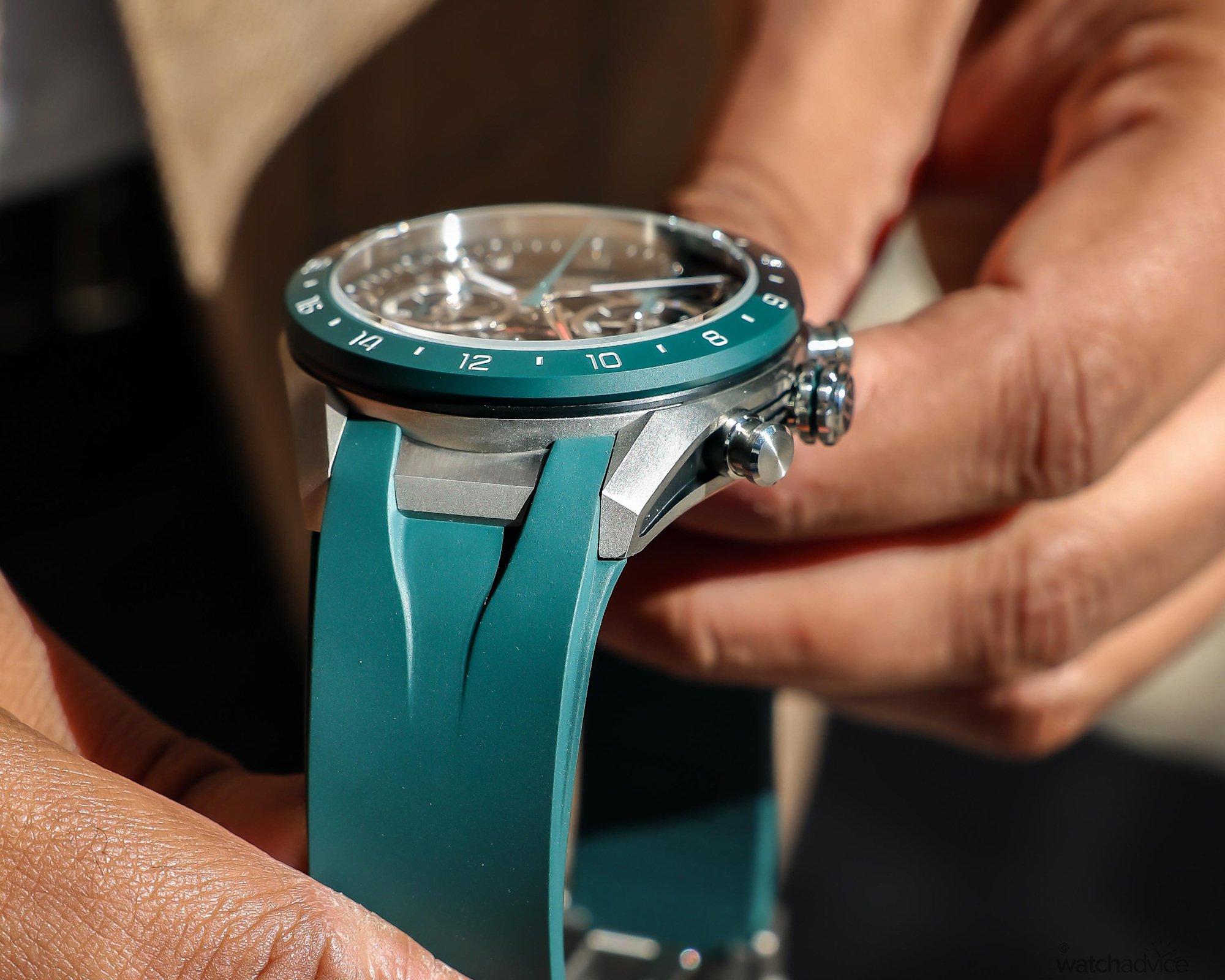 While this unique skeletonsied architecture of the dial remains the same as the other models in the Carrera Extreme Sport collection, what has changed is the use of the teal colour and the addition of GMT functionality. The teal colour has been used for the chronograph seconds hand as well as the date wheel that sits underneath the skeletonised framework. This date wheel has been well thought-out. While it’s hard to see it around the dial as the teal colour somewhat blends in with the movement, the actual date window at 6 o’clock has a white background, which presents a nice contrast against the teal colour. I say this is a well-thought-out design, as there have been skeletonised dials from various manufacturers where the date window and wheel are mismatched, making it hard to see the date.
