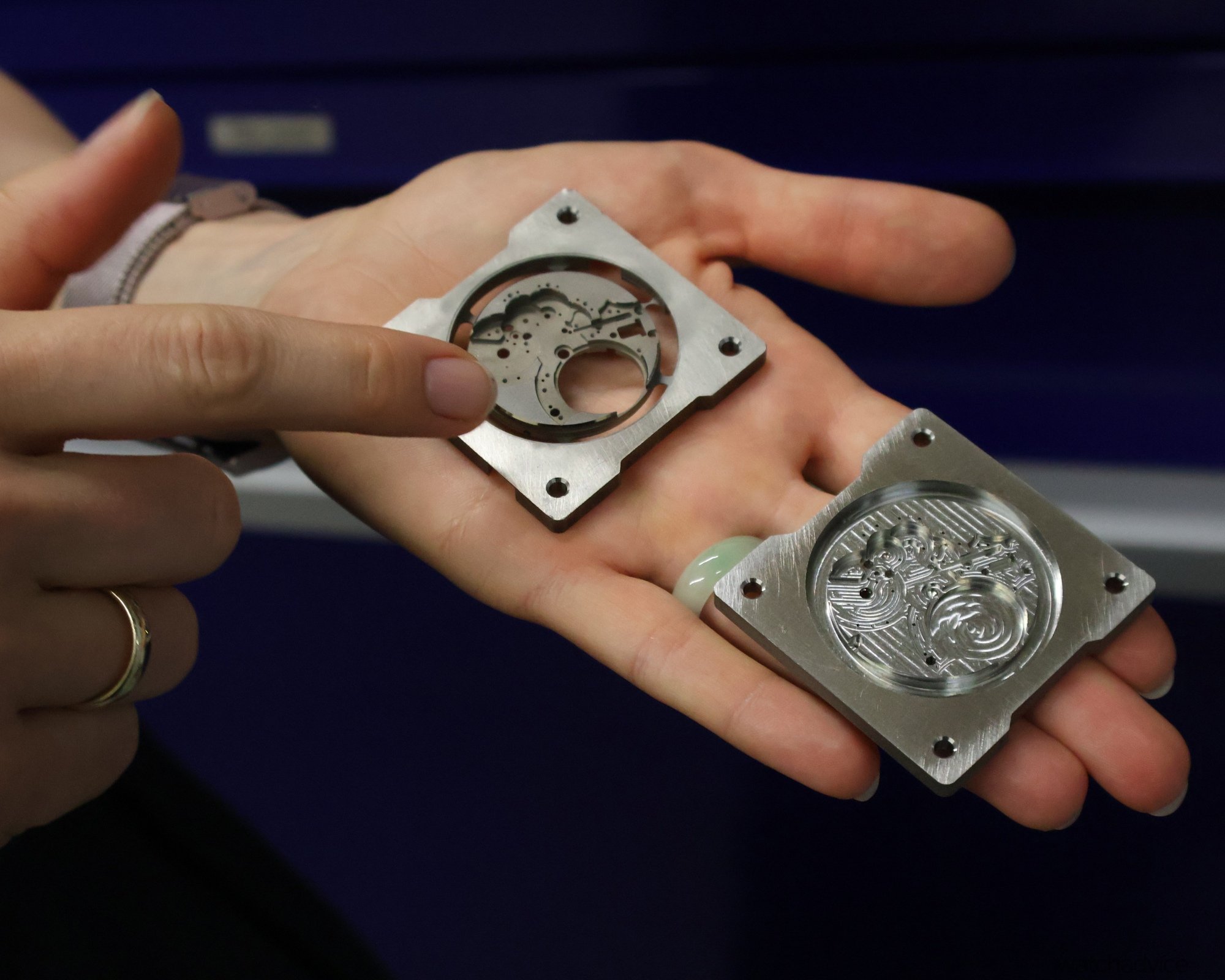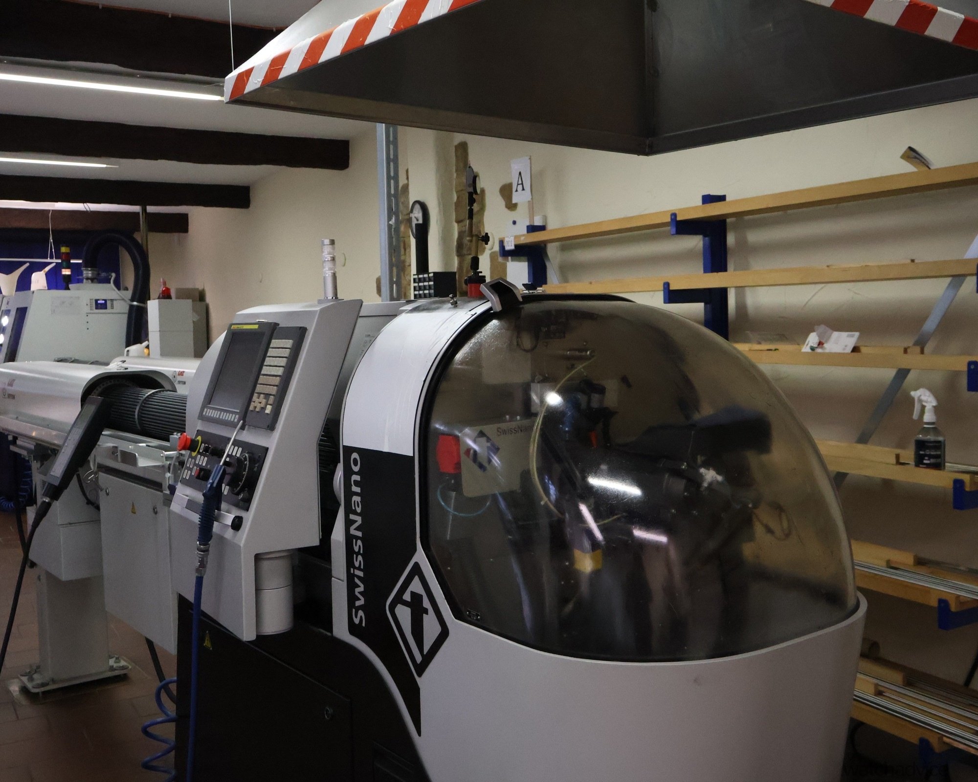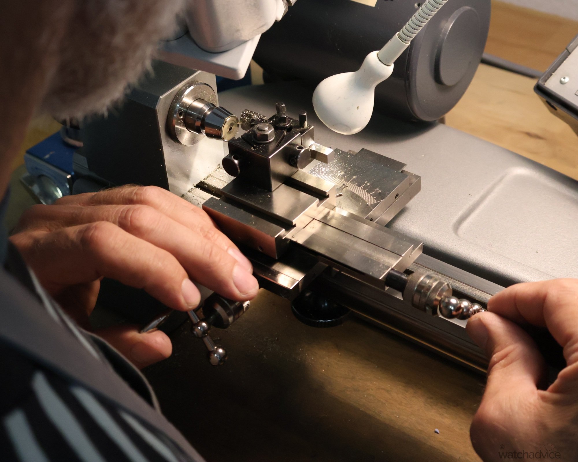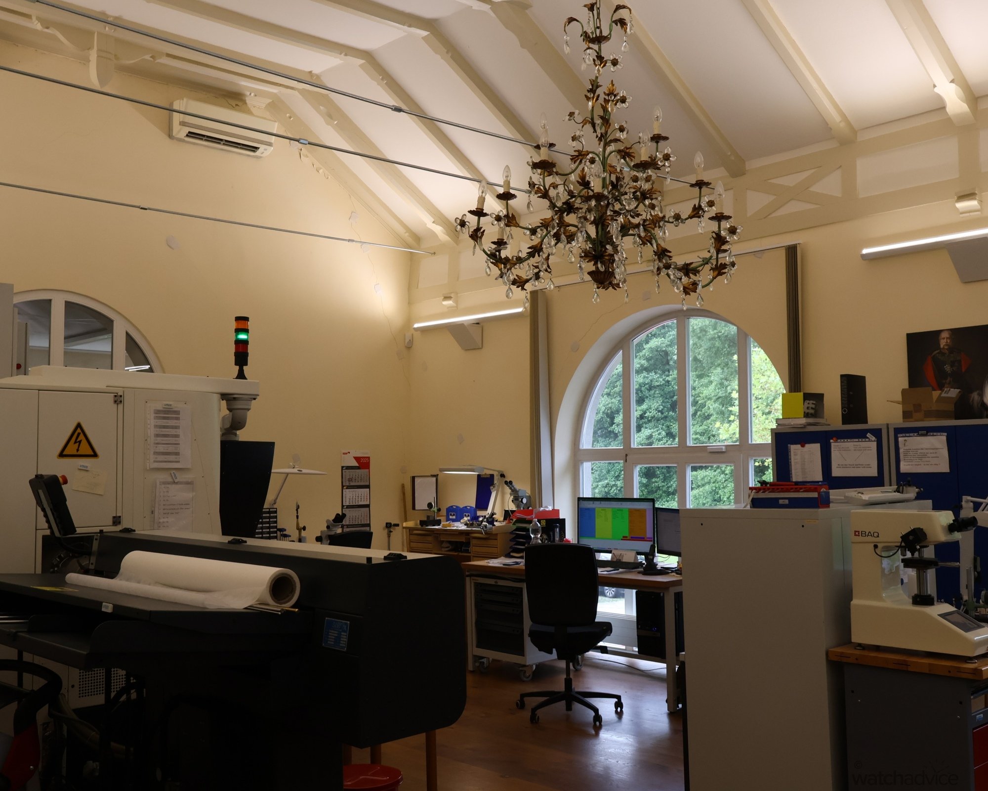 The manufacturing continues on the first floor, where Dominique guided us into what was once the ballroom. The dancing is long gone, replaced by an art form just as vibrant, though far more deliberate: watchmaking. A large CNC mill takes centre stage, while workbenches lined with traditional tools fill the rest of the room.