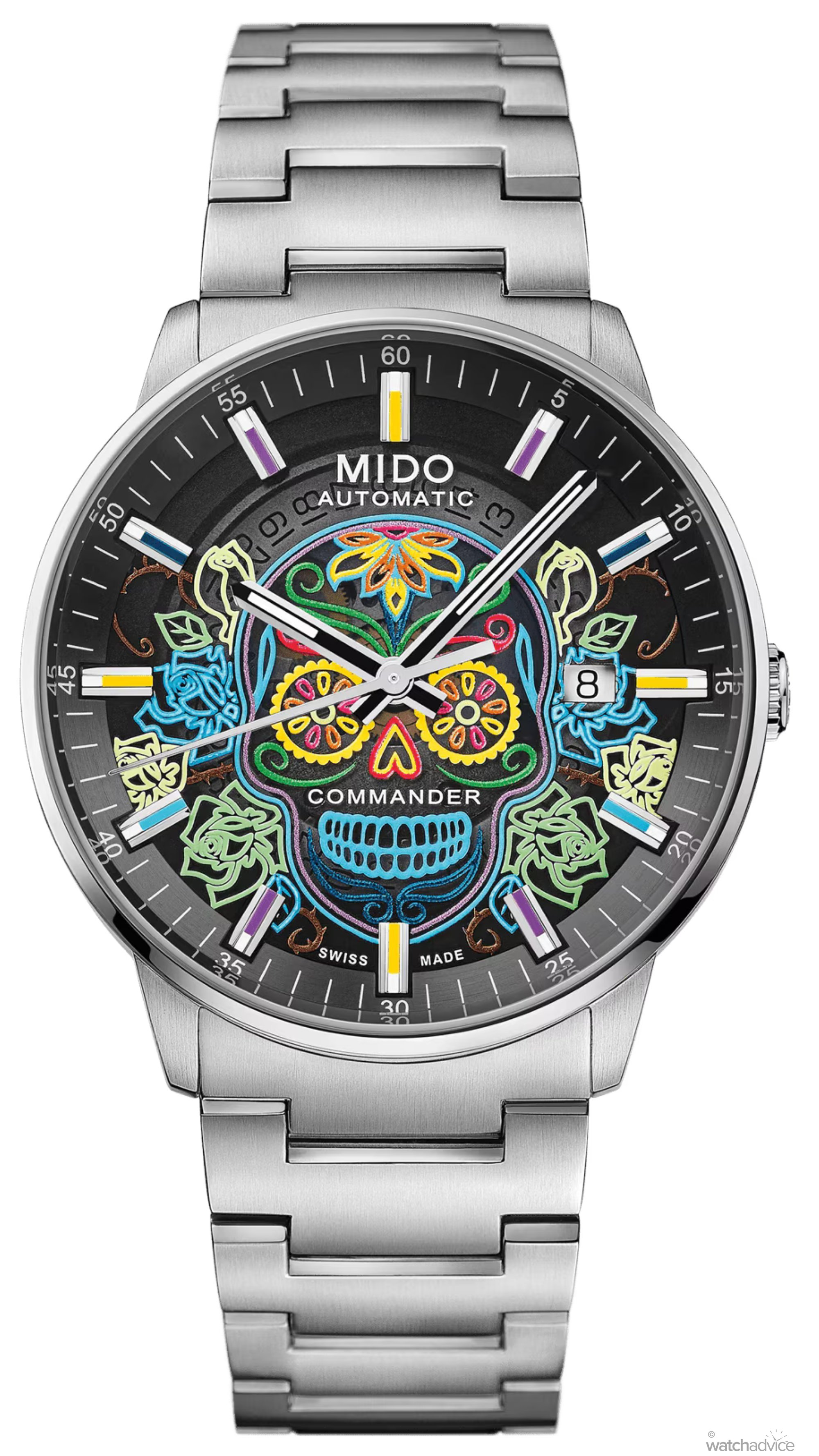 Paying tribute to this distinctive holiday, MIDO’s Commander Gradient Catrines proudly sports a brightly-coloured Cavalera, or sugar skull, atop the dial. Representing the souls of the departed, they are often used as a reminder of death as much as life, and are often decorated in a similar fashion is depicted by MIDO.