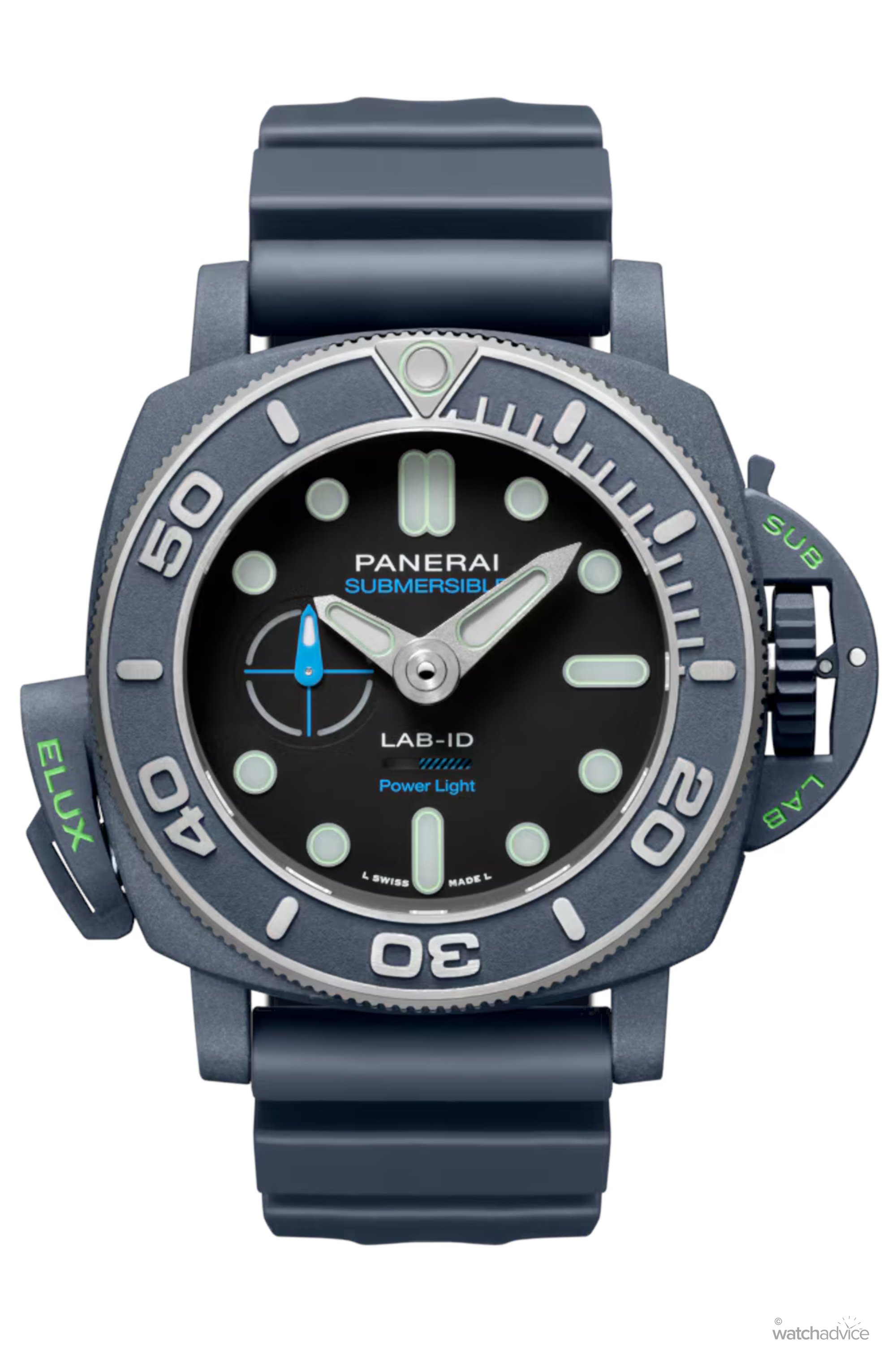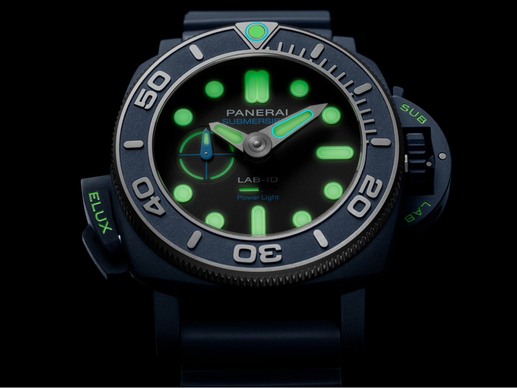 You read that correctly, by the way; Not only does the Panerai’s Submersible Elux Lab-ID sport three days’ worth of power reserve, but it’s also able to generate 30 minutes of on-demand illumination beyond its lume capabilities. As a tribute to their 1966 discovery of the Elux material – short for elettroluminescenza, or electroluminescence – the Elux system uses a switch at 7 o’clock to convert mechanical energy to electricity, powering in-built LEDs.