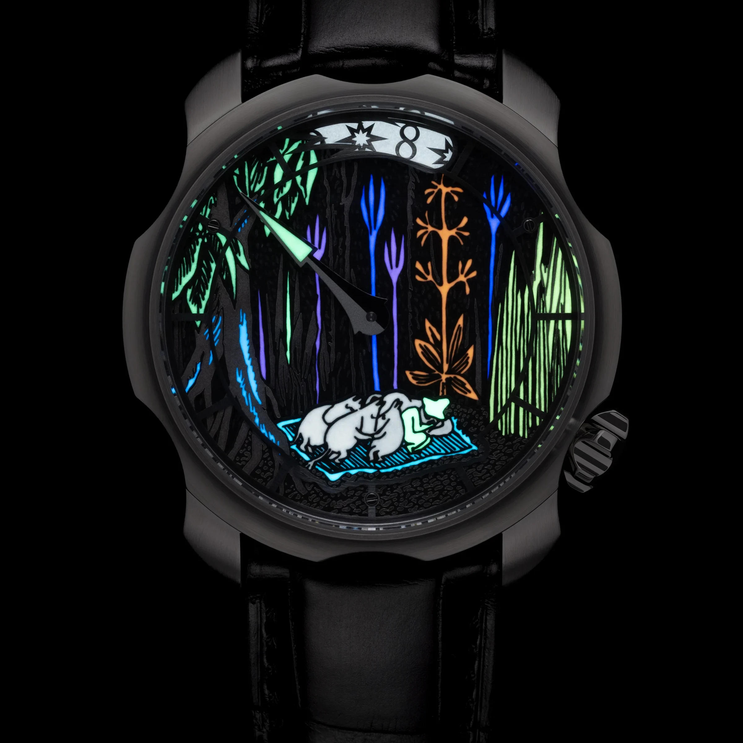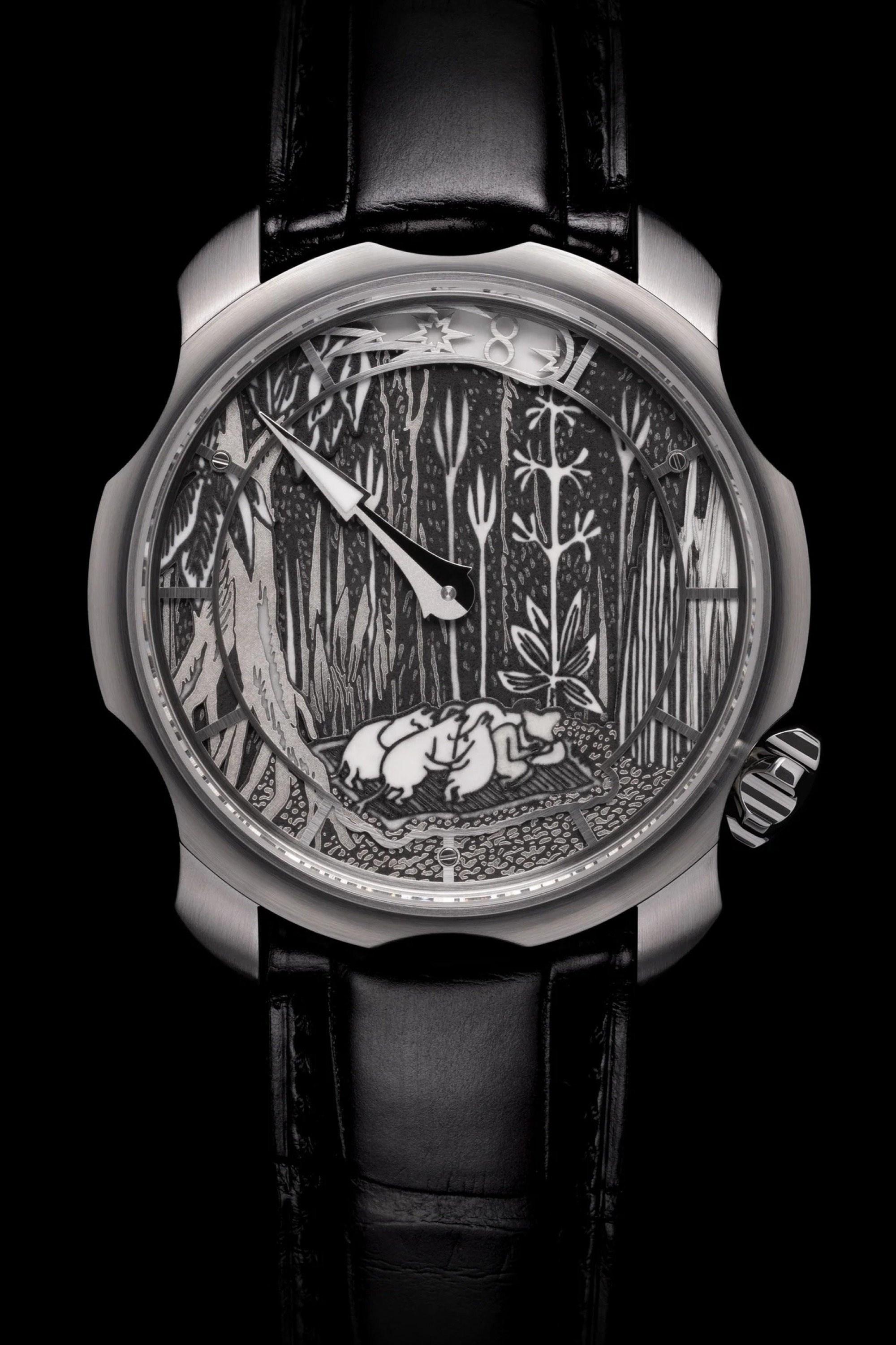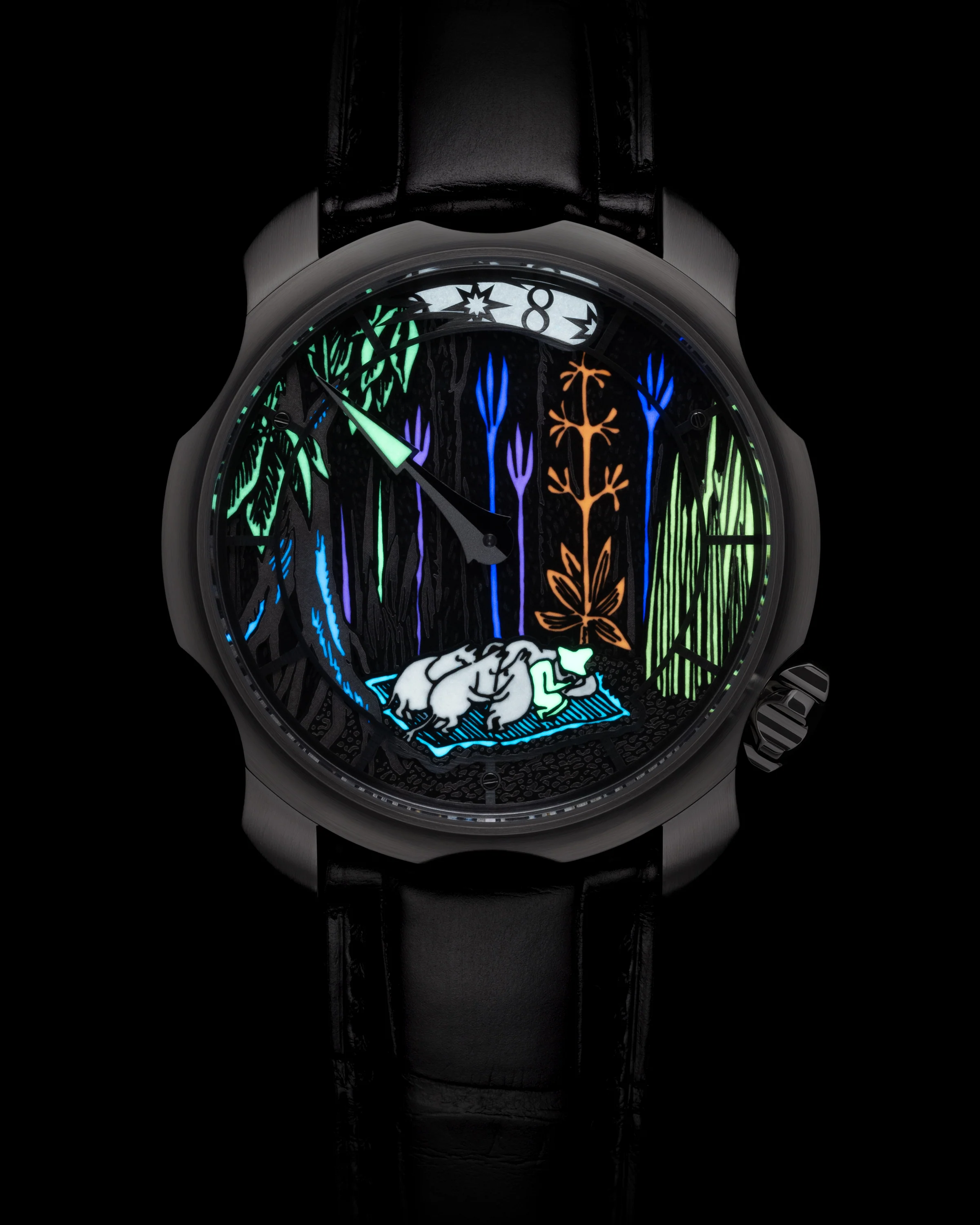 Taking directly from a still in Jansson’s Comet in Moominland, the new duo of Sarpaneva watches depicts the Moomin trolls fast asleep in the forest, as the hours fly overhead alongside the stars. At night, the forest comes to life around the sleeping creatures, revealing a breathtaking application of ten different colours of lume. These limited edition watches are an adorable, distinctively Finnish addition to the Sarpaneva roster, but be warned: the display case back still sports Sarpaneva’s signature moon face. It’s always watching you.