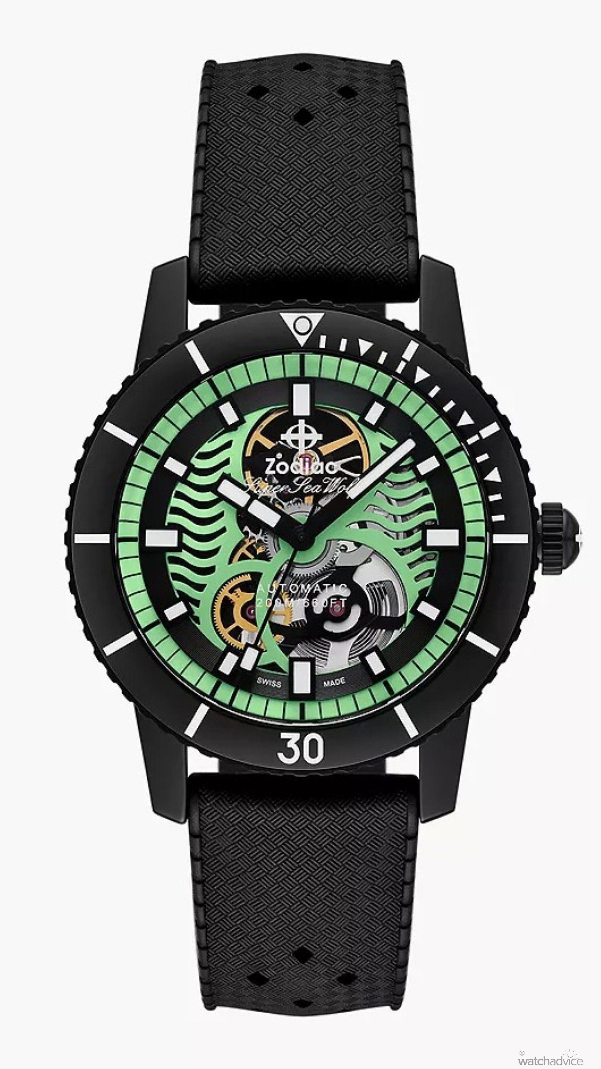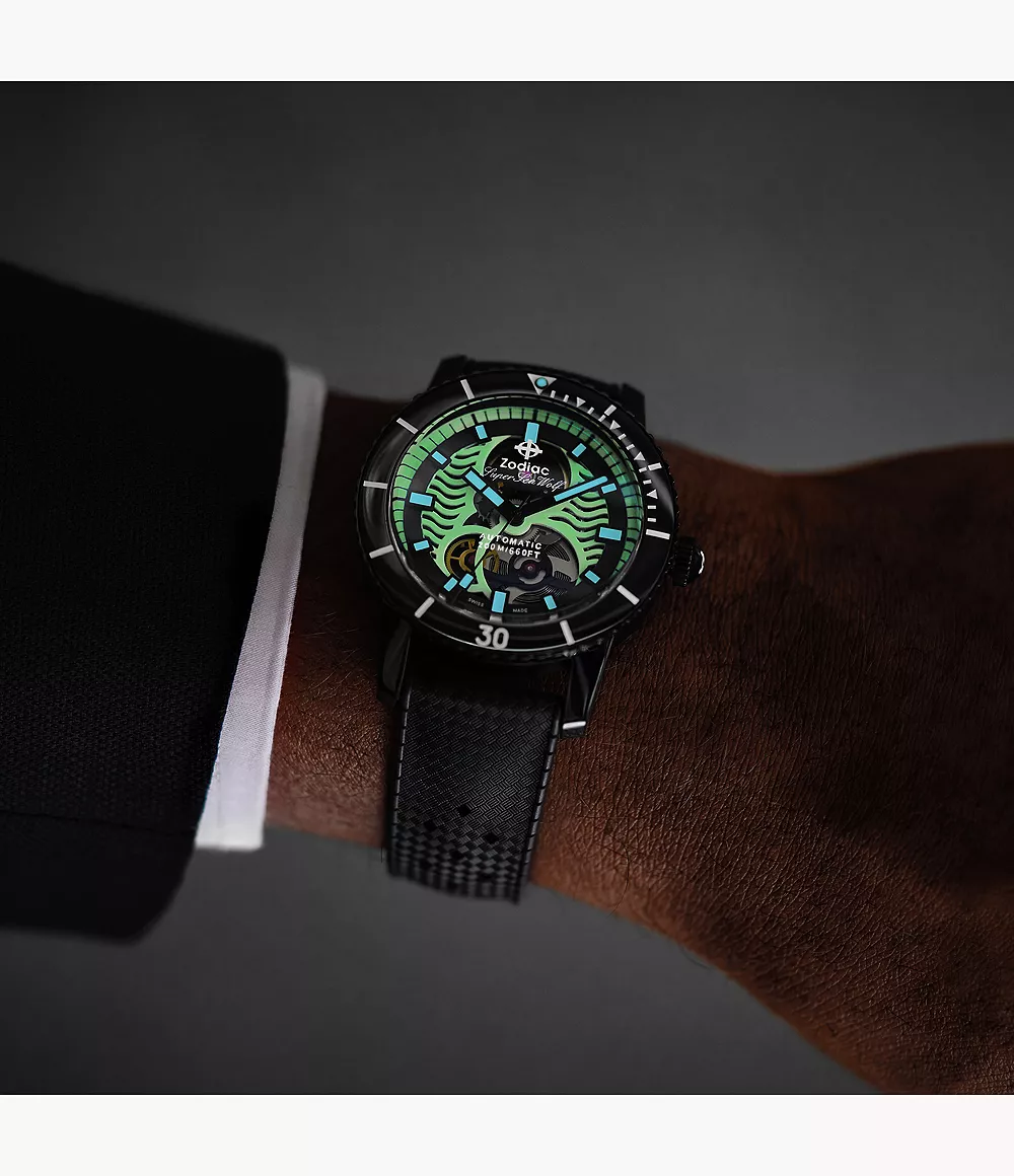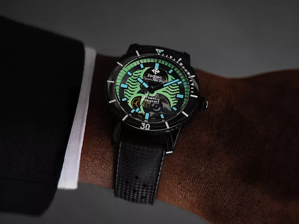 While parts of the dial are cut away, what remains are clean, unbroken lines of green lume. This effect is enhanced by the existing luminous elements of the original design, which glow a contrasting, brilliant blue. Powered by the STP6-21 movement, made exclusively for Zodiac, this version of the Super Sea Wolf is far more than just a glowing face.