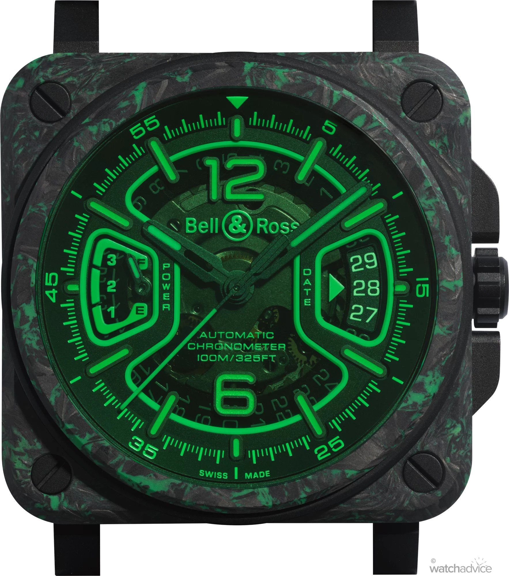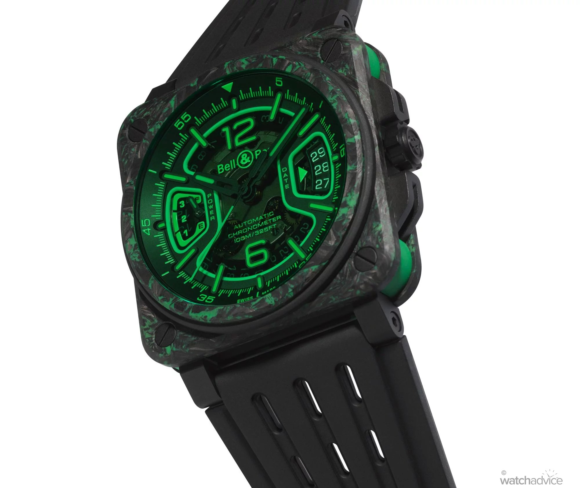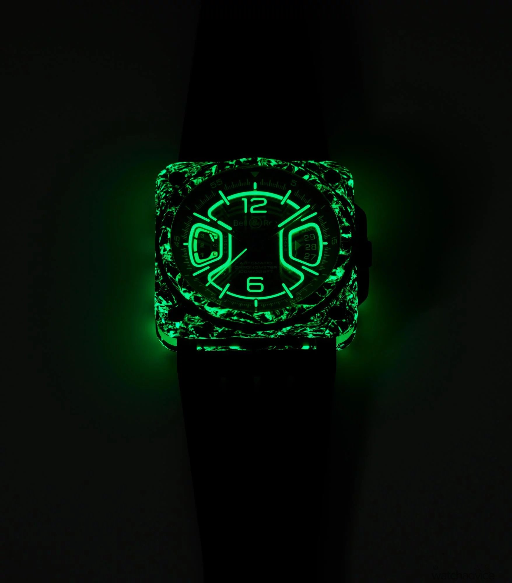 Bell & Ross states, “The two main plates on the BR-X3 Night Vision, are crafted in LUM-CAMO, an exceptional high-tech composite combining carbon fiber with a blend of SLN resin. The plates are fastened with four through-screws housed in protective cylinders. For this special edition, the cylinders are made of green rubber, also photoluminescent.” As we know, with carbon fibre, the structure of the material gives a unique appearance, which differs from timepiece to timepiece. Combining it with SLN resin gives this structure a stunning green glow that, at night time will transform the watch into a luminous beacon. An aesthetic and functional homage to cockpit instrumentation.