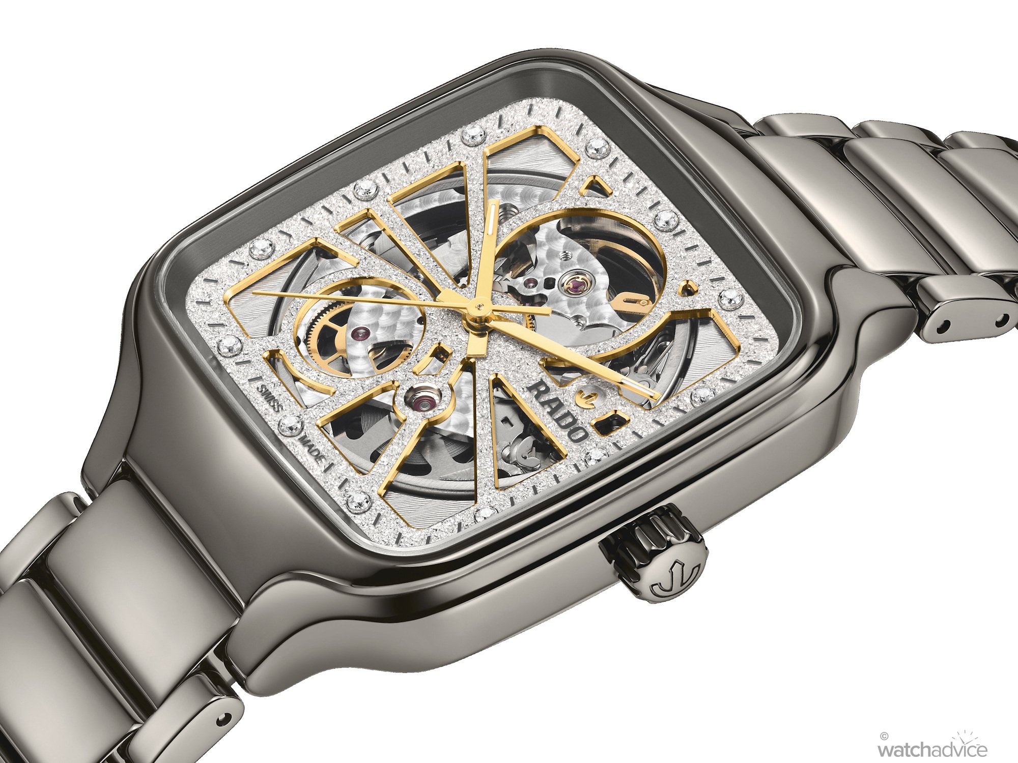 Rado is offering two different high-tech ceramic case materials for this mini collection, with the first being the polished white high-tech ceramic with a titanium case back (Ref. R27073722), and the second being a polished plasma high-tech ceramic with a titanium case back (Ref. R27083722). The two colours offered highlight different aspects of the timepiece, with the polished white high-tech ceramic case drawing more attention to the overall timepiece, adding to the glamour and glitz of the shimmering dial. The plasma high-tech ceramic case, on the other hand, is a bit more subtle, and allows the dial to take the spotlight, and reveal its intricate textures and play of light. The shimmering diamonds will also stand out more against the darkened plasma case, creating a refined contrast that gives this version a more understated yet sophisticated presence on the wrist.