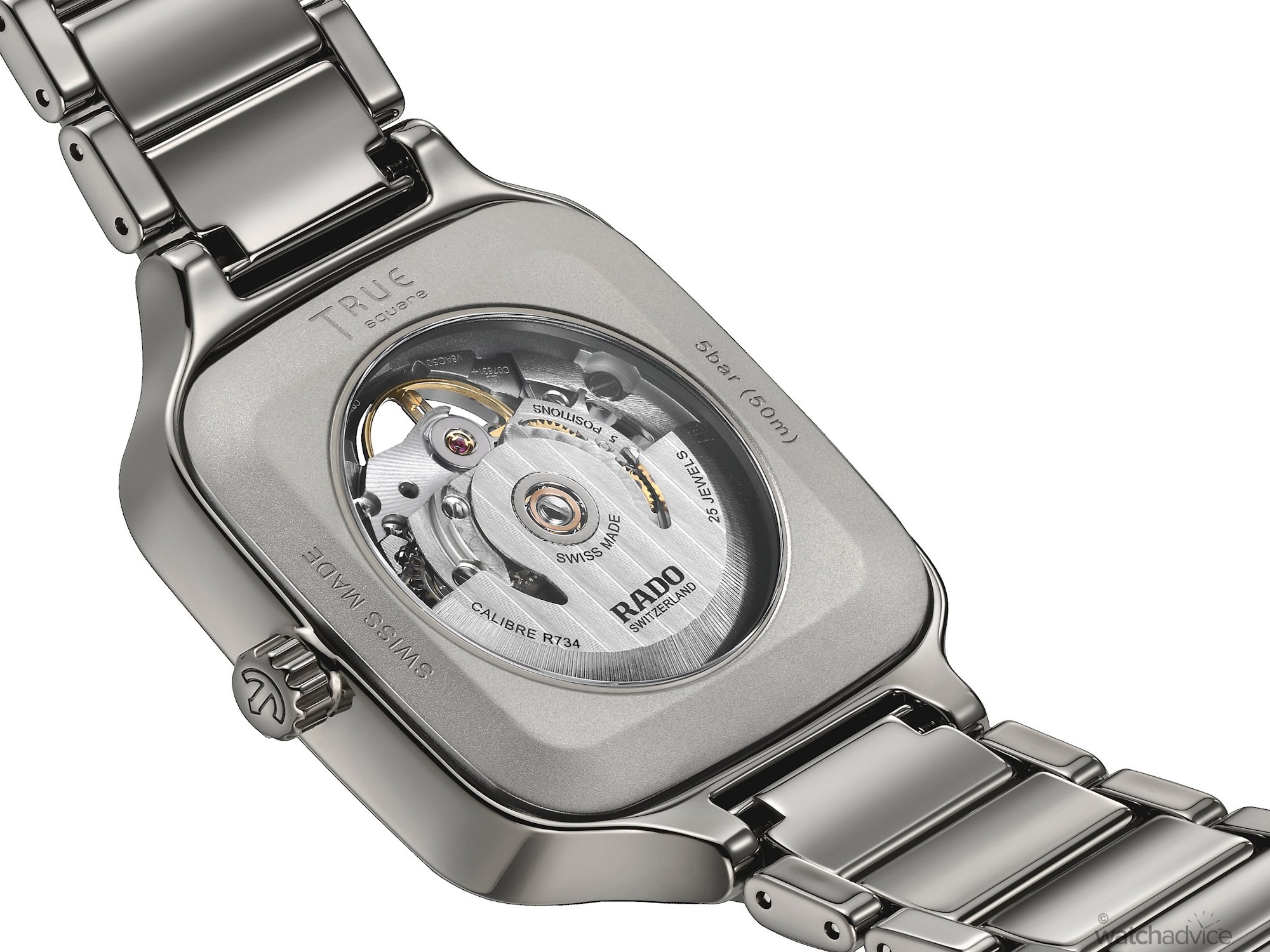 Powering the two Rado True Square Open Heart Sparkling editions is the same Calibre R734 movement. Visible through the skeletonised dial is the gear train and balance wheel, showcasing the beating heart of the movement. Turn the watch over, and you are treated to delicate circular-grained decoration and a Côtes de Genève-finishing, adding a layer of aesthetic finishing to the overall design. Beyond its appearance, the Calibre R734 movement offers an impressive 80-hour power reserve and features an antimagnetic Nivachron™ hairspring for superior reliability in everyday conditions.
