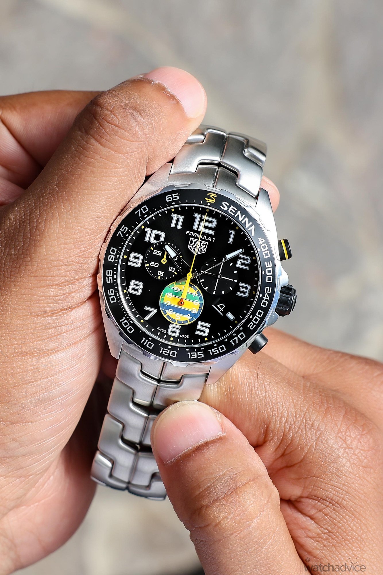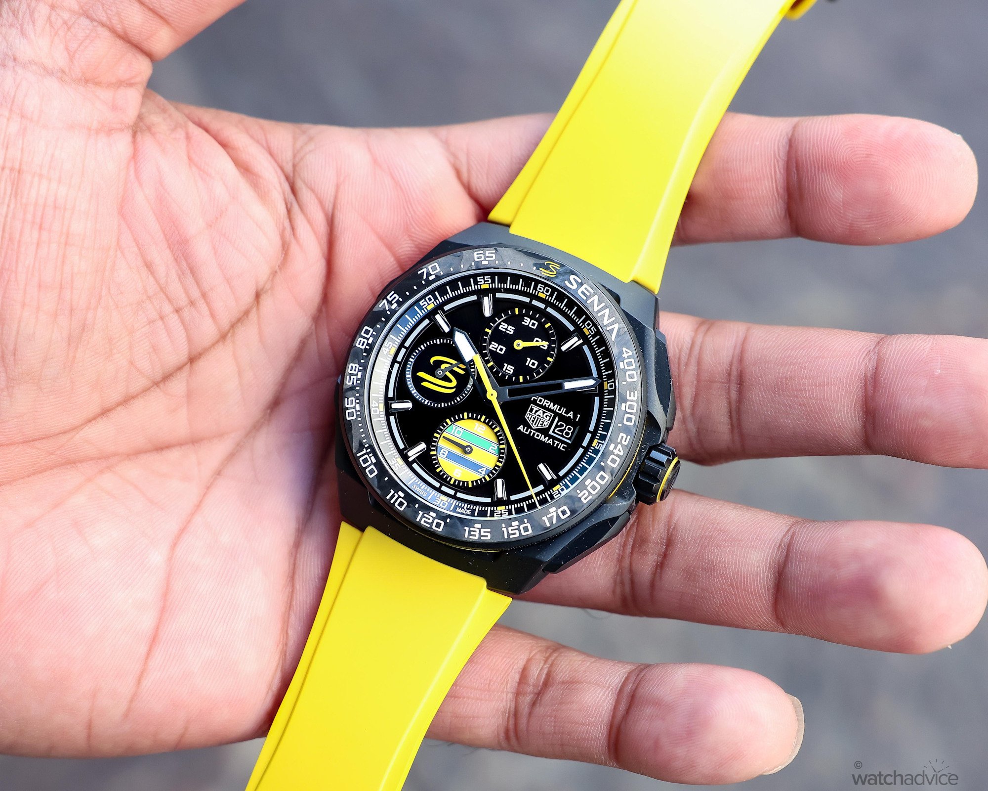 The engine sitting inside this latest Formula 1 Chronograph x Senna 44mm model is TAG Heuer’s automatic chronograph Calibre 16 movement. Over the years, the Calibre 16 movement has proven to be reliable and robust, operating at a high frequency of 4Hz (28,800 VpH) and delivering 42 hours of power reserve, keeping the chronograph running with precision and ease. It’s the kind of movement that embodies the same spirit as Senna himself, built for performance, endurance, and absolute precision under pressure!