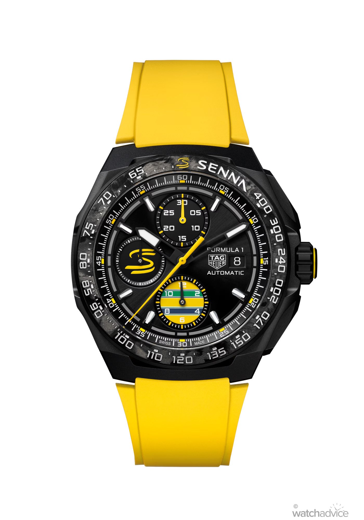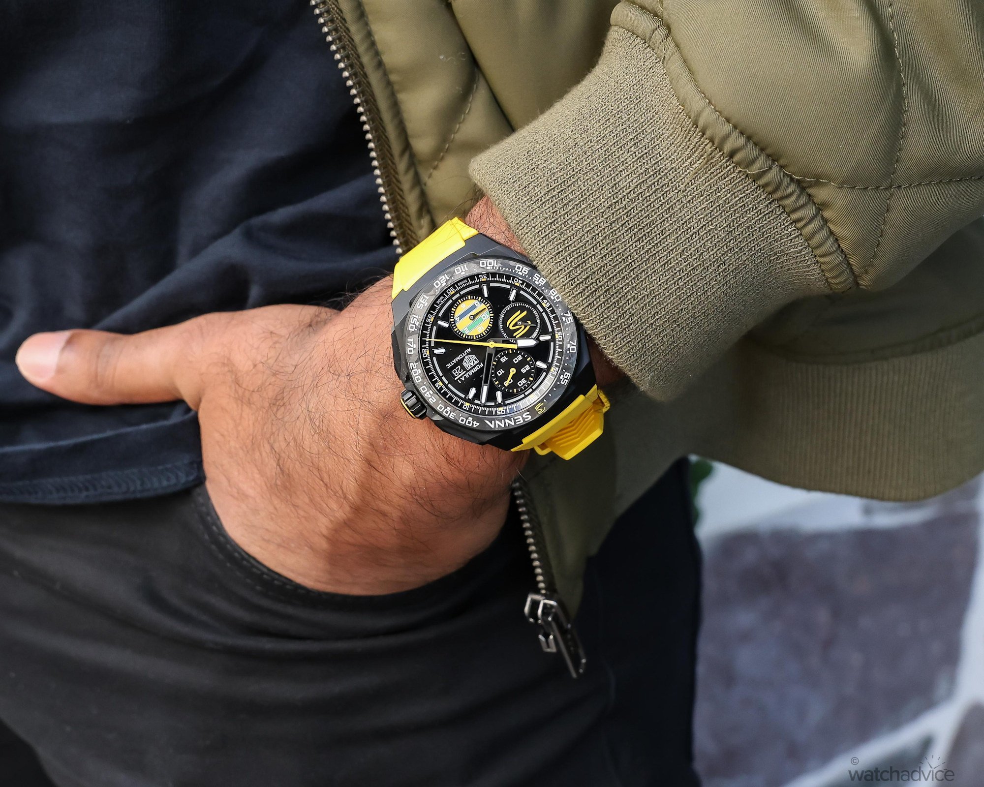 The two timepieces are quite different from each other, embodying their own personality and looks while honouring the legacy of Aryton Senna. Both timepieces share similarities; however, they feature yellow accents throughout as a reference to the legendary driver’s home country. The first timepiece is a high-end expression of the partnership between the Senna brand and TAG Heuer. The watch’s design draws inspiration from Senna’s helmet and his Brazilian identity.