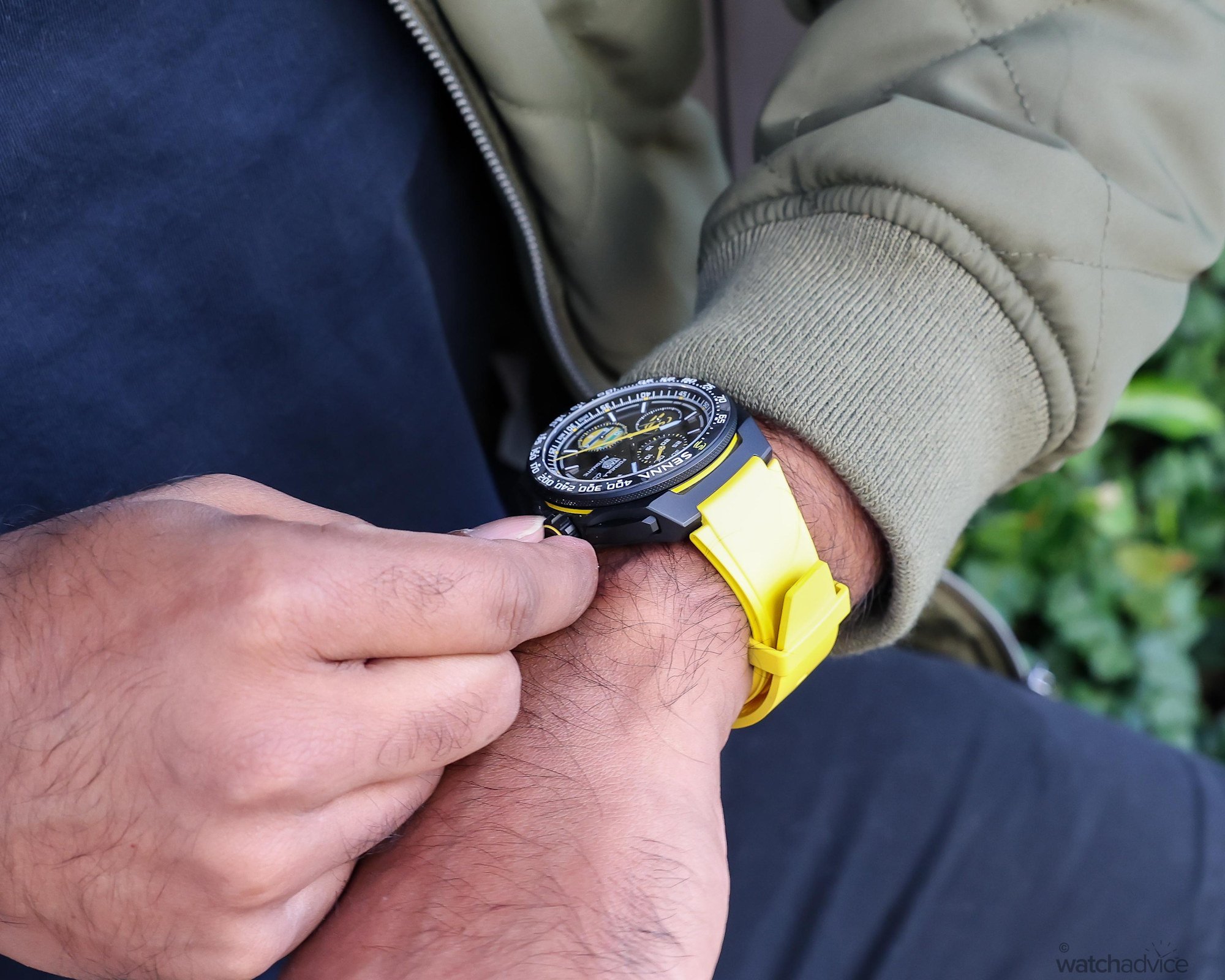 - Bracelet/Strap: Yellow rubber strap with black DLC steel pin buckle; TAG Heuer engraving