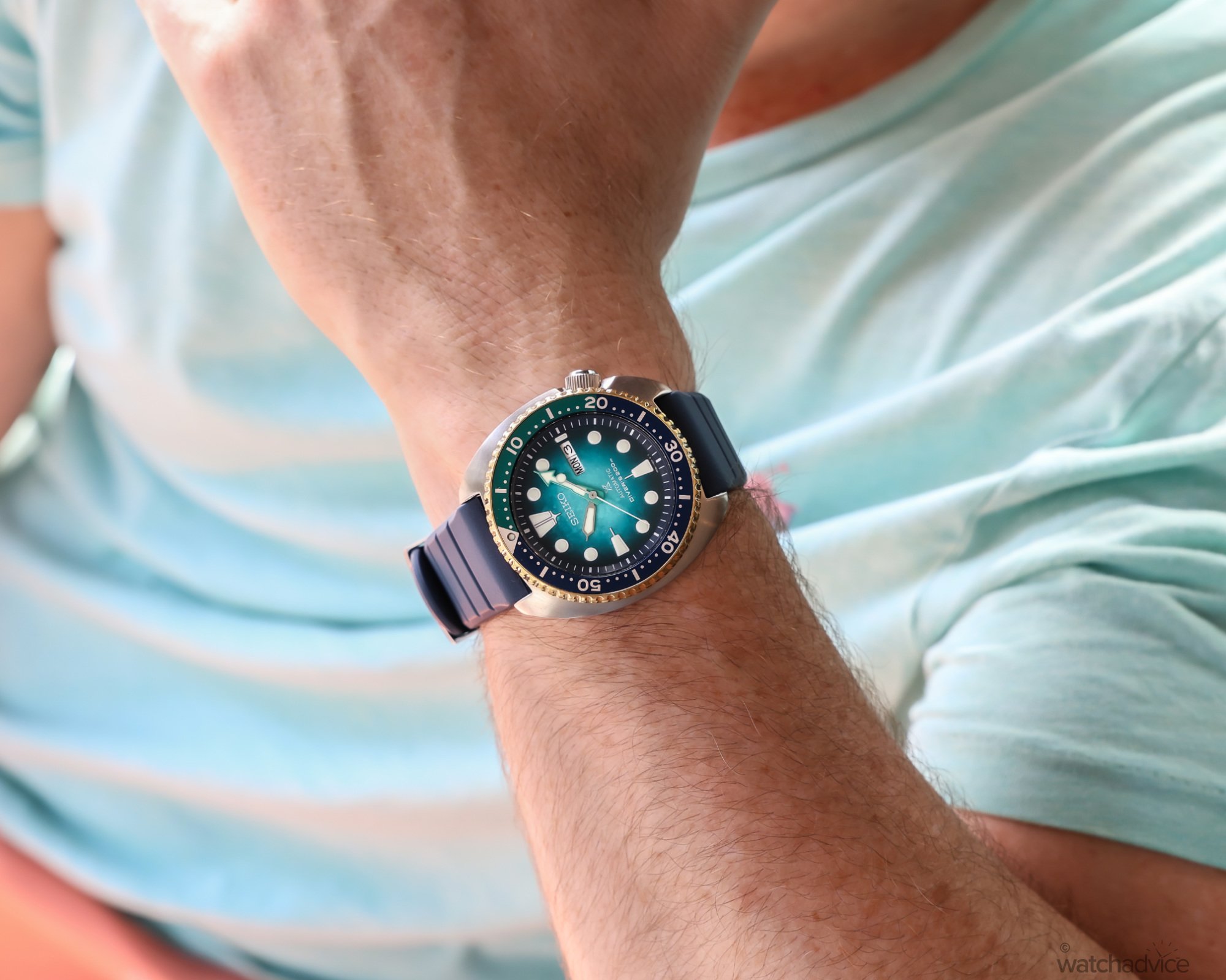 I haven’t worn a Seiko in quite a while, and for me, the size and dimensions of the turtle case actually felt quite good on the wrist. When combined with the colour-matched silicon rubber strap, I think I was sold at that point. The other addition that I liked was the gold around the bezel, which just gave it a little something else and elevated it from just a standard dive watch. The texturing on the dial was also a standout for me, as I loved the effect that Seiko has created, mimicking the waters and sand patterns of the coastal waters of Queensland.