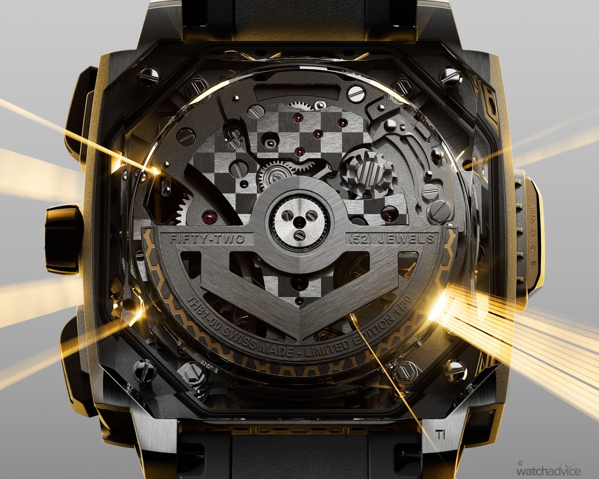 • Case Material: Sandblasted & brushed grade 5 titanium with 18k yellow gold & titanium lattice