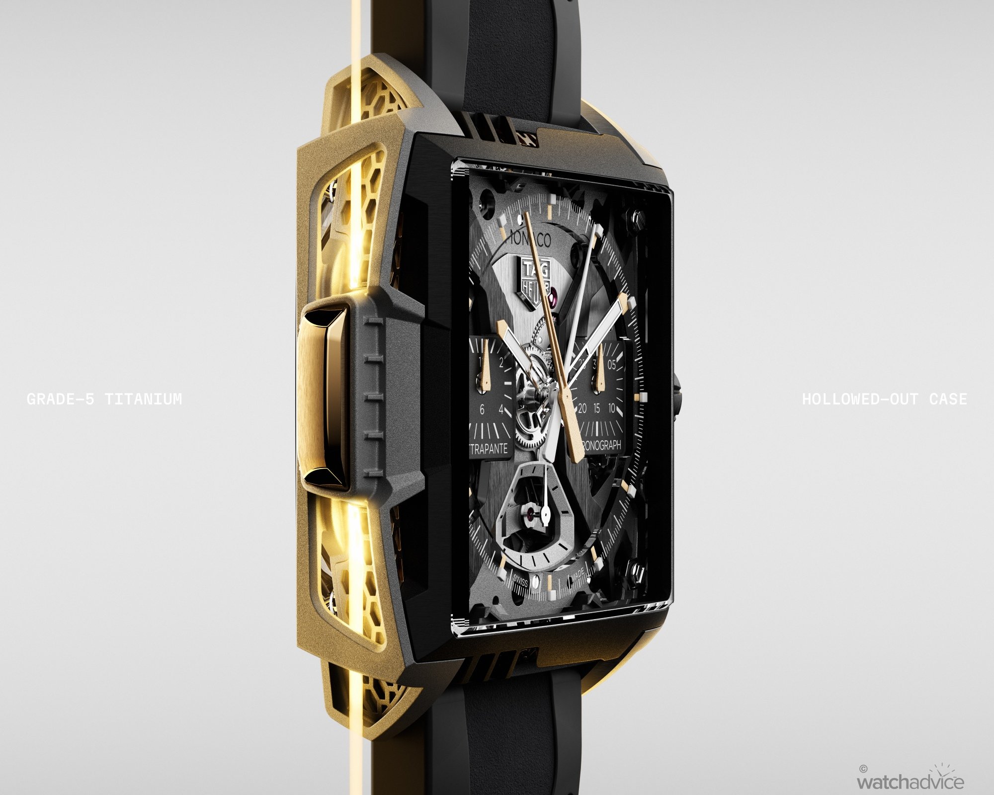 The TAG Heuer Monaco Split-Seconds Chronograph Air 1 looks almost hollowed out, as if it were conceived in the same wind tunnel as the Formula One cars it sponsors. The case is carefully constructed from sandblasted grade 5 titanium and 18k yellow gold, which, despite the latter’s weight, results in a watch that comes in at a mere 85 grams.