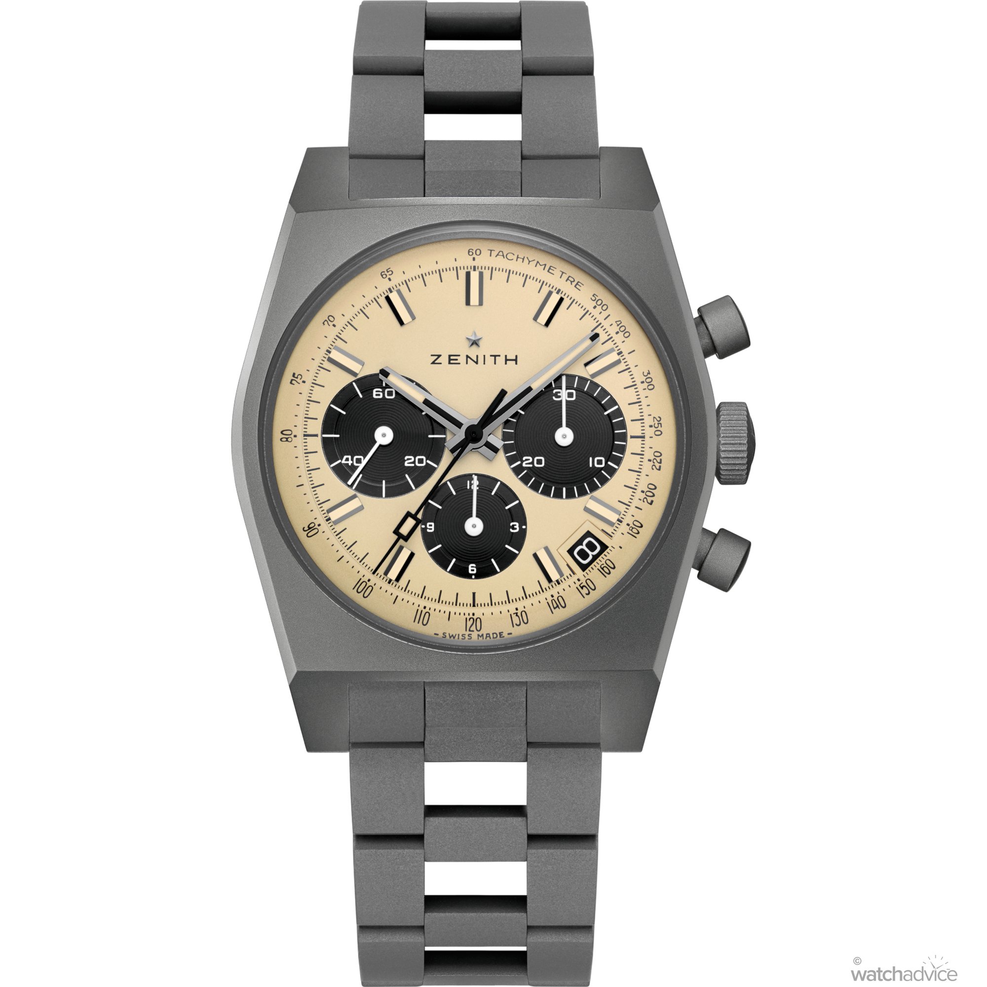 Instead, it uses a sandblasted Grade 2 titanium case, bringing it closer in spirit to the Zenith Chronomaster Revival Shadow. In a historically faithful yet surprisingly ergonomic package, the watch is paired with Zenith’s iconic ladder bracelet, originally designed in 1969 by the famed Gay Frères. Delightfully retro while offering improved durability and breathability, the ladder bracelet has become a staple within the Revival lineup.