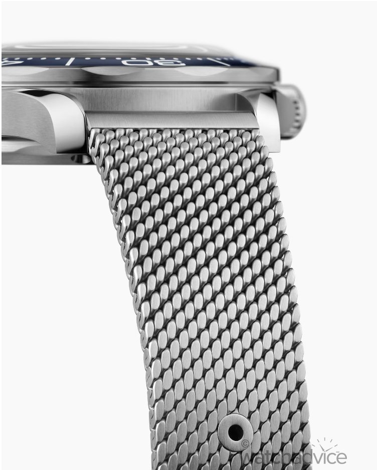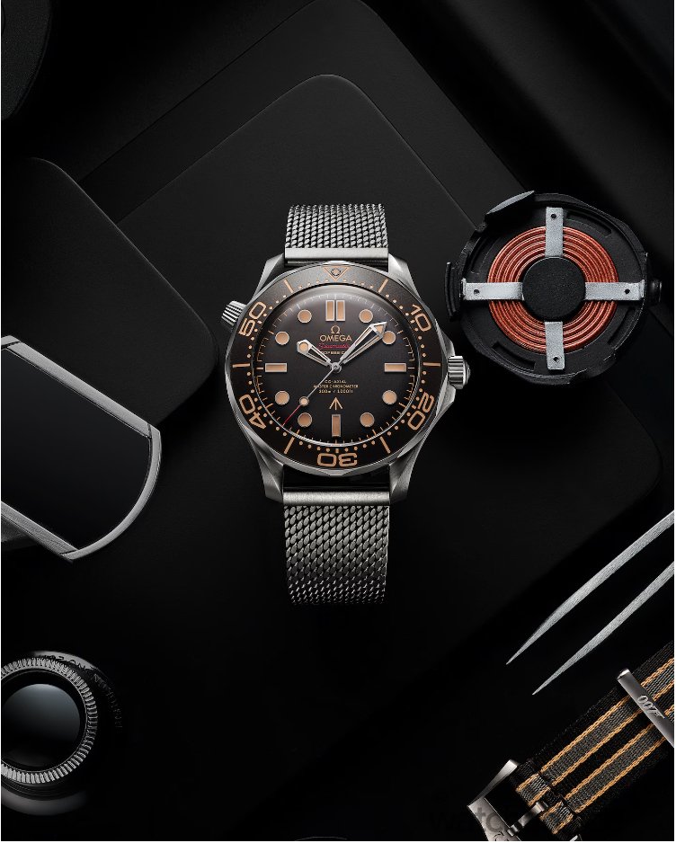 The ‘NTTD’ Seamaster marked a serious departure from the Diver 300m formula of the past 26 years. It combined a vintage-inspired domed sapphire crystal and beige lume with an extremely modern titanium Milanese mesh bracelet. The date window was replaced with the Broad Arrow insignia, a historic British MOD symbol used to mark military-issued equipment. It is still seen today on some Australian Defence Force property and serves as a nod to OMEGA’s real service watches once supplied to British forces. This symbol is present on the titanium case back, accompanied by military designation codes.