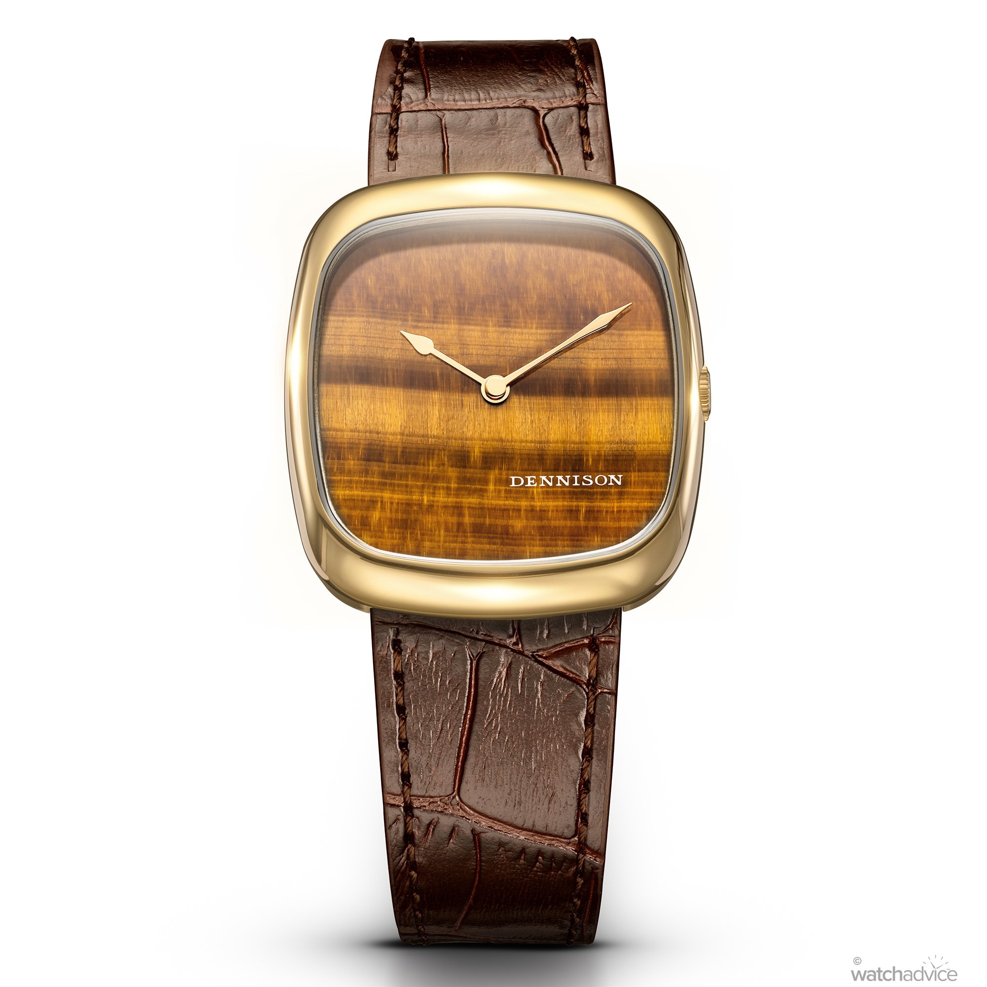 Dennison has been making some noise of late, with its retro styling and affordable price point. Stone dials are also making a comeback, as we’ve seen this year with many brands introducing them to their core collections. Dennison has decided to join the fray and release this Tiger Eye dial in the Dennison vintage-style cushion case with gold PVD.