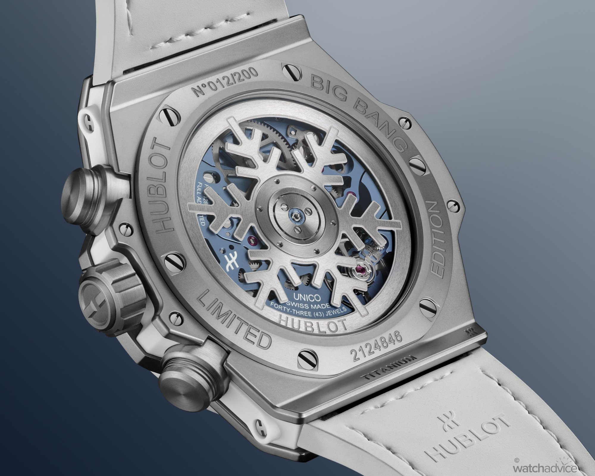 Ok, so there are a few elements that have been done that make these winter editions outside of the frosted blue dials and white ceramic bezel on the titanium model. The caseback has been adorned by a snowflake rotor in each, which is a nice touch. It does hide the HUB1280 Flyback Chronograph movement, however, but does give it that wintery feel Hubot is going for here.