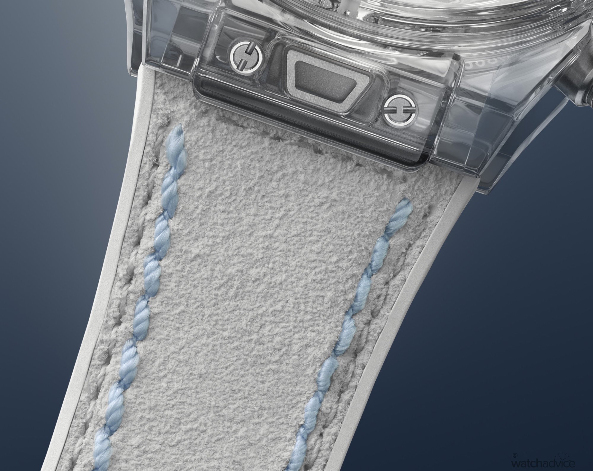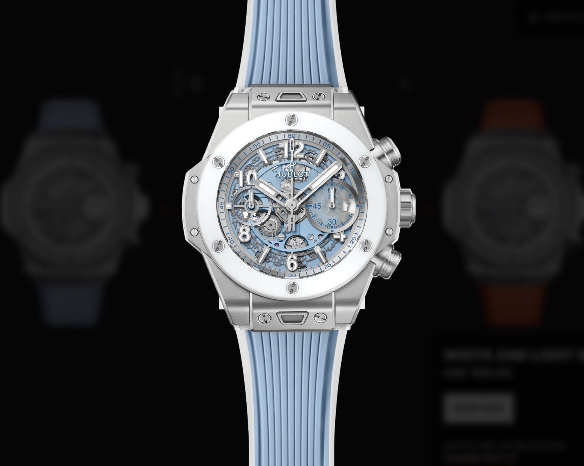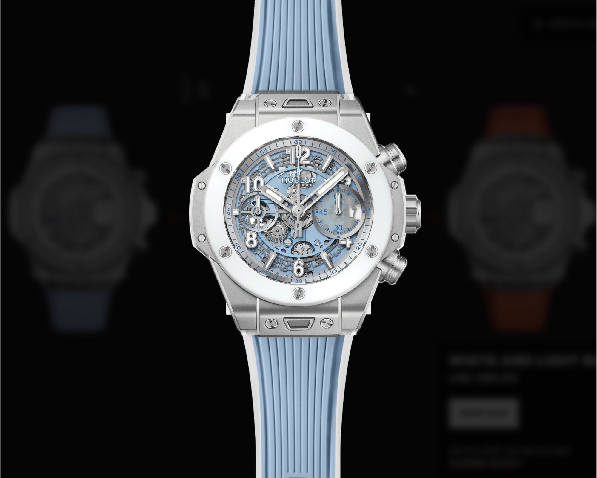 - Bracelet/Strap: White rubber and calfskin strap with blue stitching, with additional white rubber and blue calfskin strap.