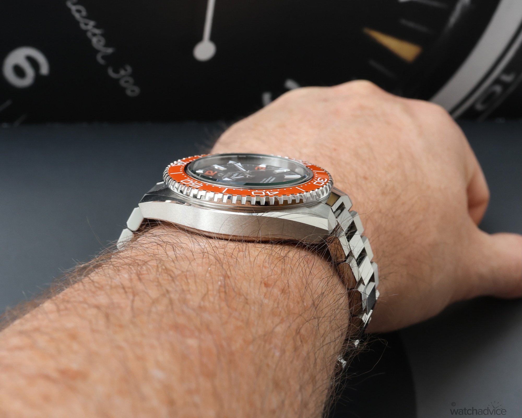 - Bracelet/Strap: Stainless steel three-link bracelet with folding clasp, diver extension and micro adjust / black or orange rubber strap with folding clasp.