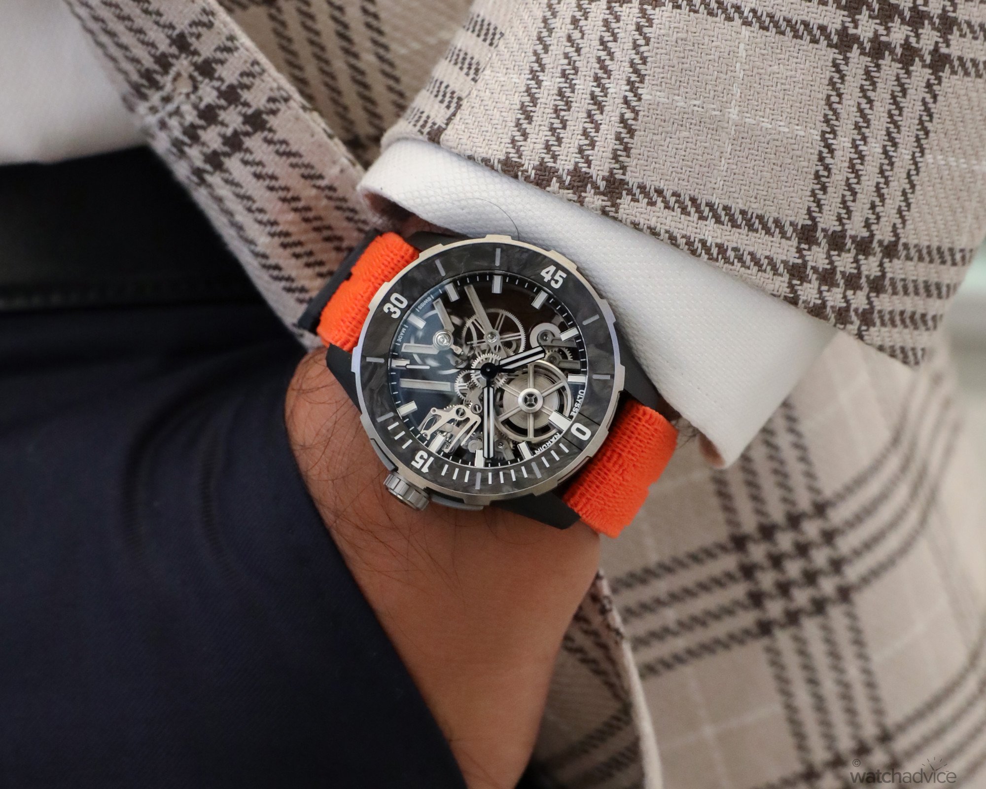 While it’s not exactly the watch you’d take swimming, it fits the summer vibe perfectly. Paired with the black fabric Velcro strap, it’s comfortable for the heat thanks to its breathable material and lightweight feel. The tourbillon complication and skeletonised dial make it a mechanical marvel, while the vibrant yellow ceramic dial demands attention everywhere you go, elevating any summer outfit with a flash of bold luxury.