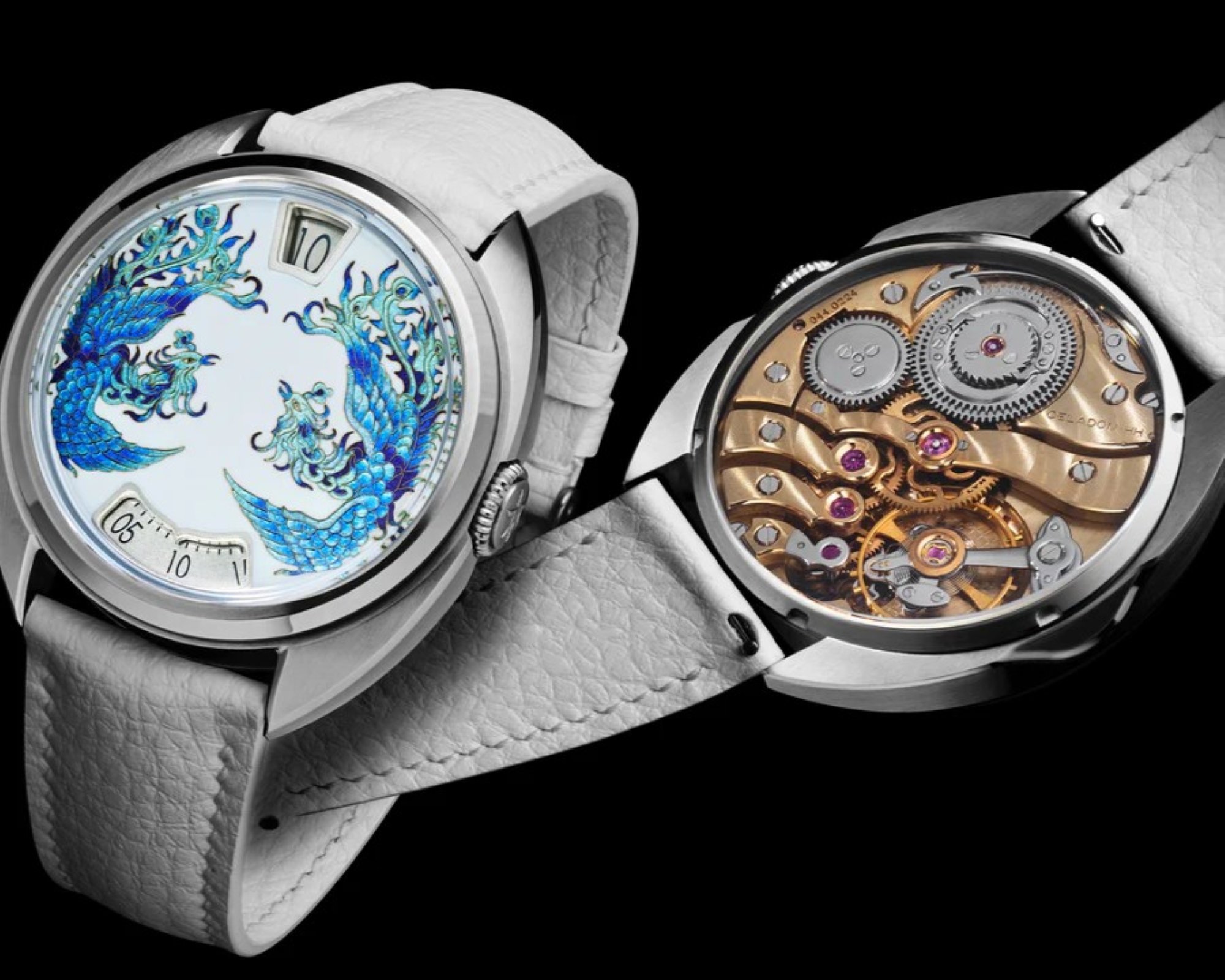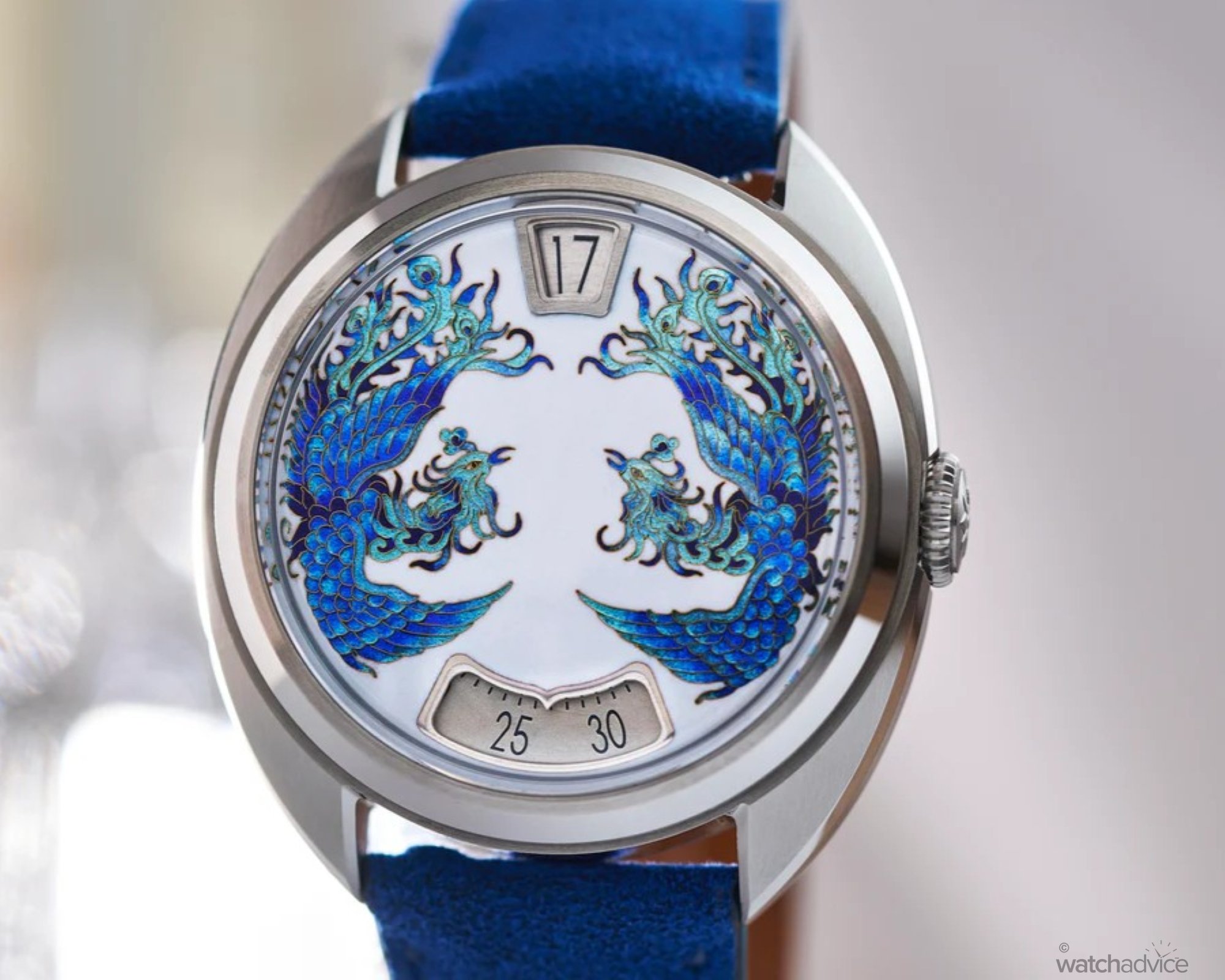 And champion it, they have. The dial of this remarkable jump hour watch is made from cloisonné enamel, an extraordinarily difficult technique that Sam has addressed before. It depicts two blue phoenixes, outlined in gold, set against a white backdrop, with two cut-outs for the minutes and hours. The 24-hour jumping hour is powered by the in-house CH5, developed by master watchmaker Lin Yong Hua exclusively for Celadon HH.