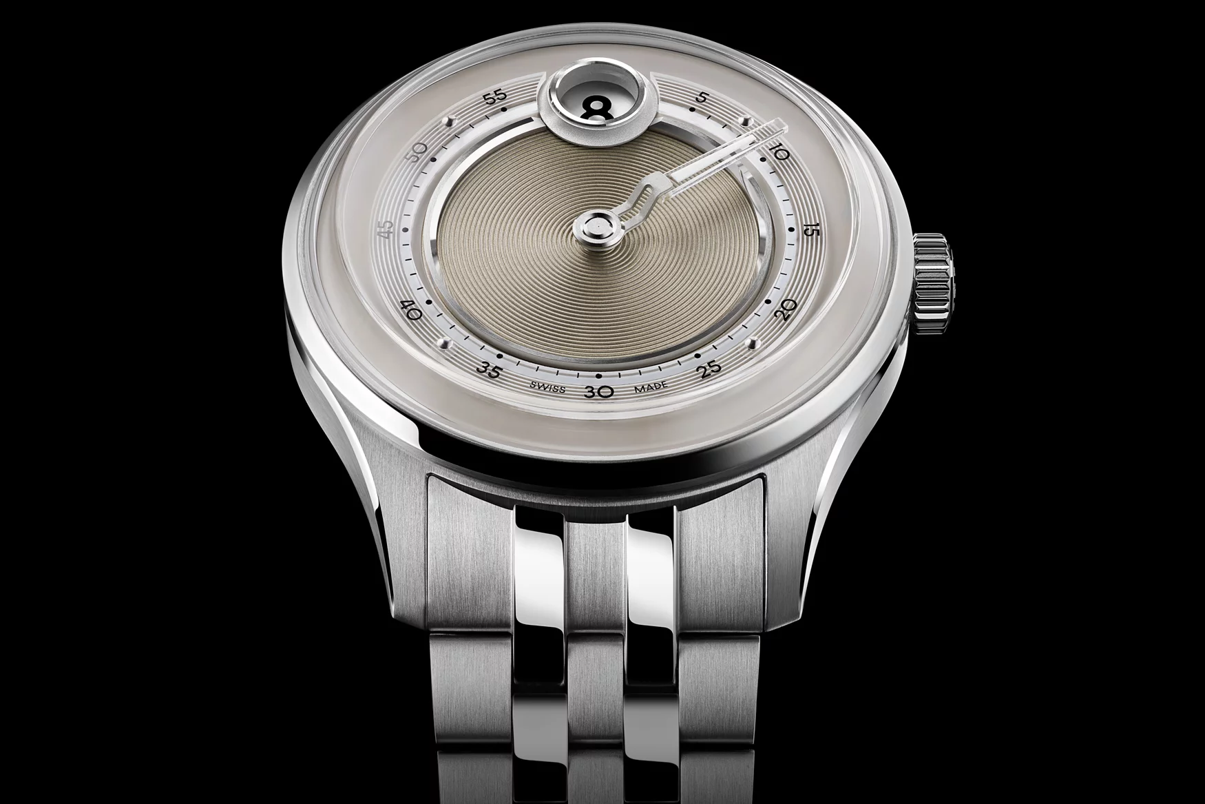 The jump hour mechanism is showcased prominently at 12 o’clock, with the surrounding display acting as the minute indicator. The design inspiration behind the dial takes cues from mid-century British industrial and automotive design, blending retro-futurism with contemporary minimalism.