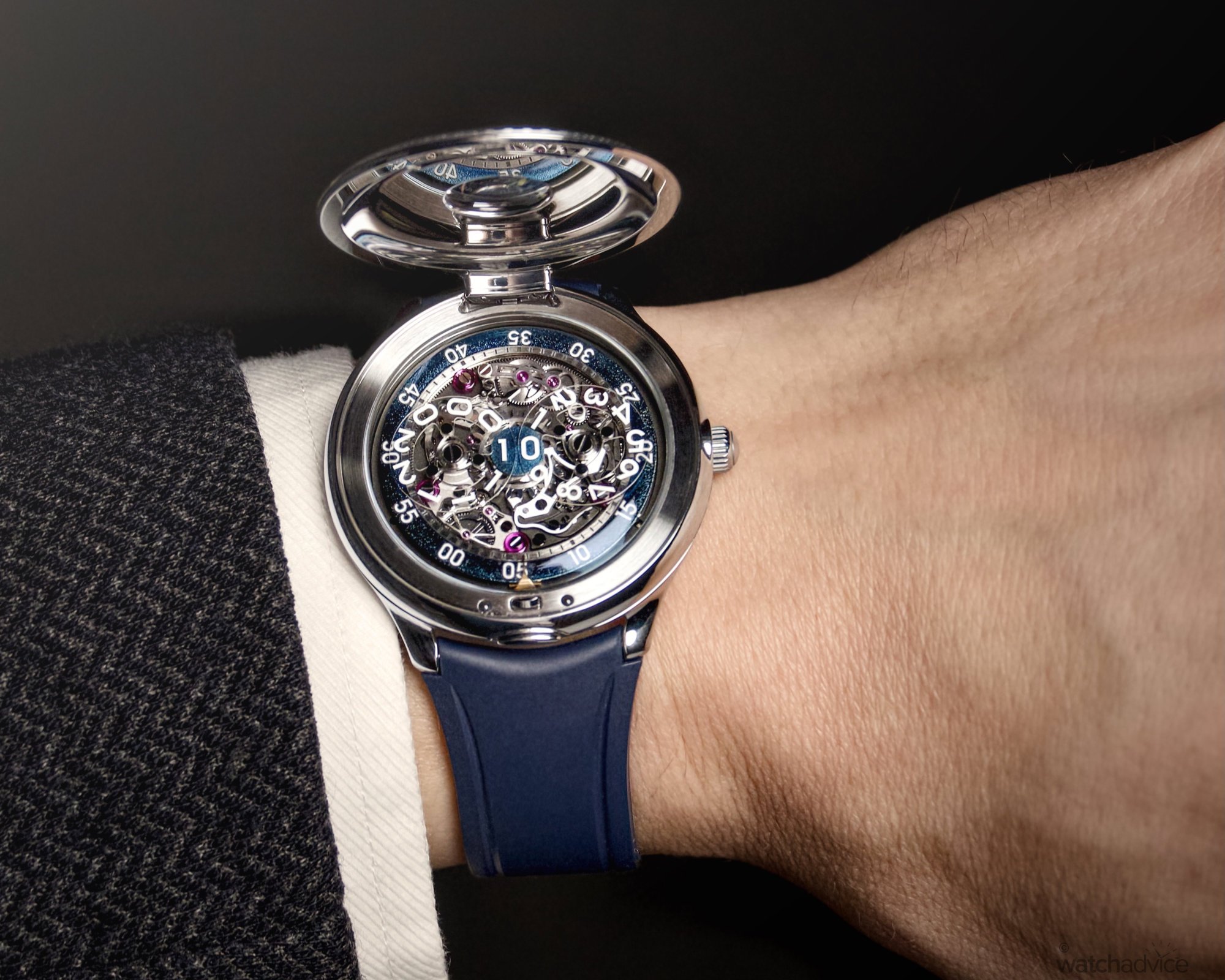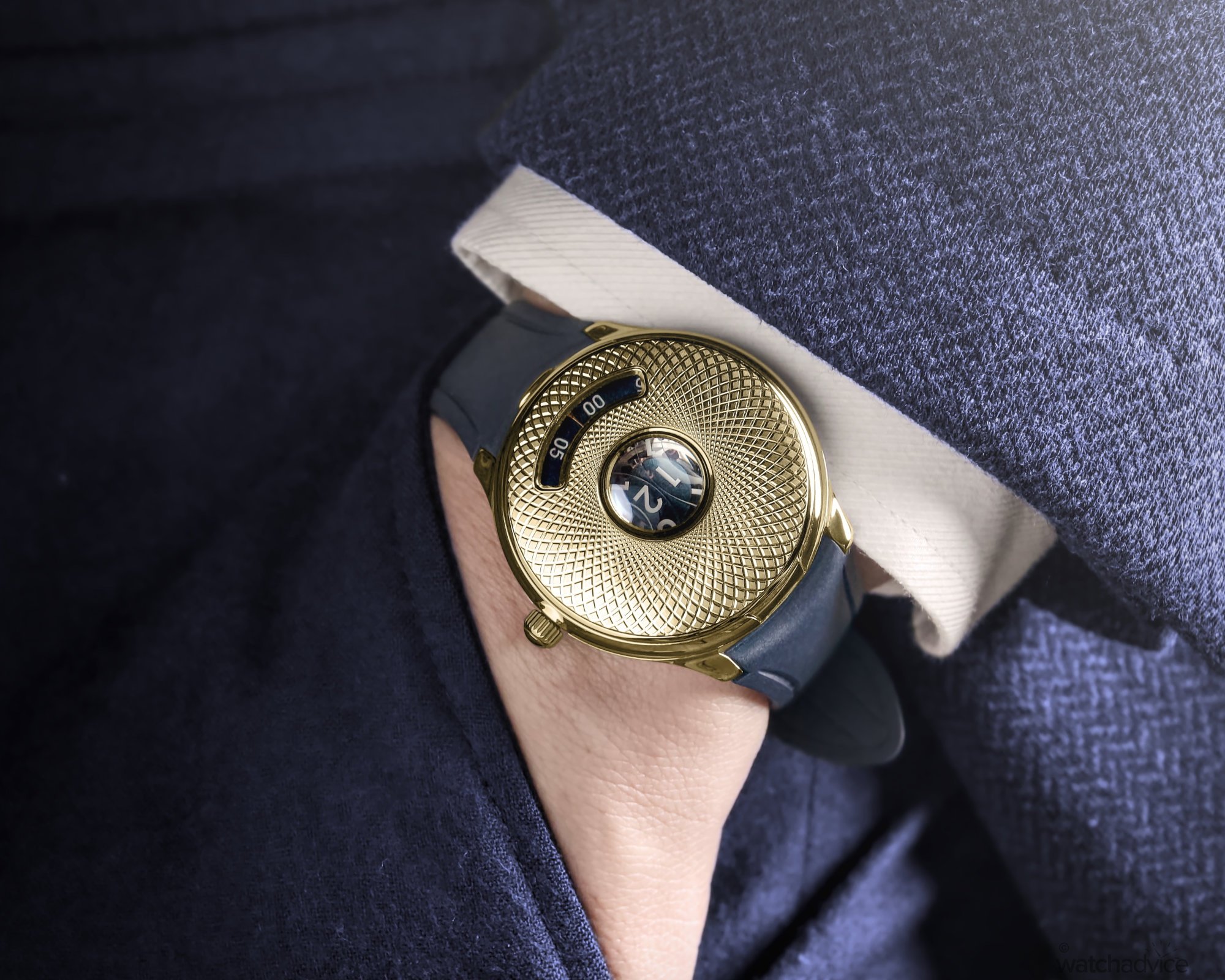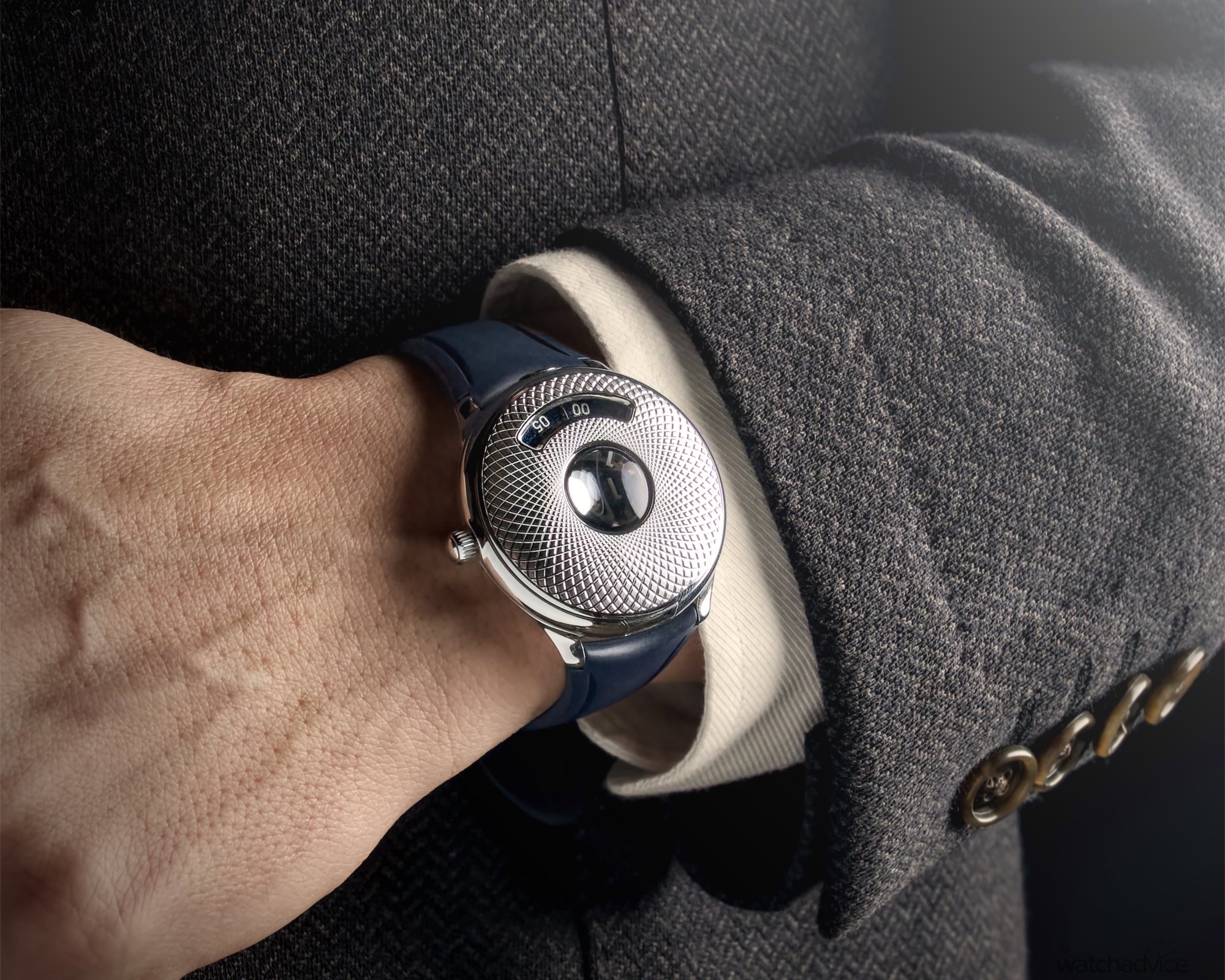 The jump-hour mechanism itself is displayed through a fisheye lens, enhancing the visual impact, while the minutes sub-dial is shown through a window that resembles a gauge instrument. To non-watch enthusiasts, this looks more like a functional instrument on the wrist rather than a luxury watch, which is exactly the brand’s intent and appeal.