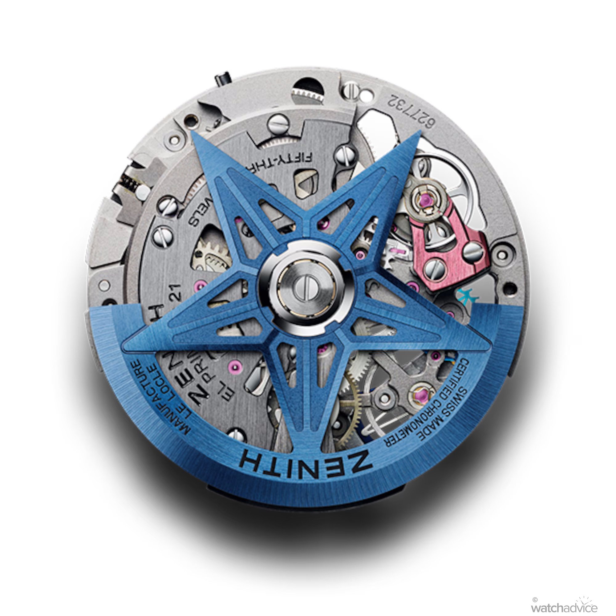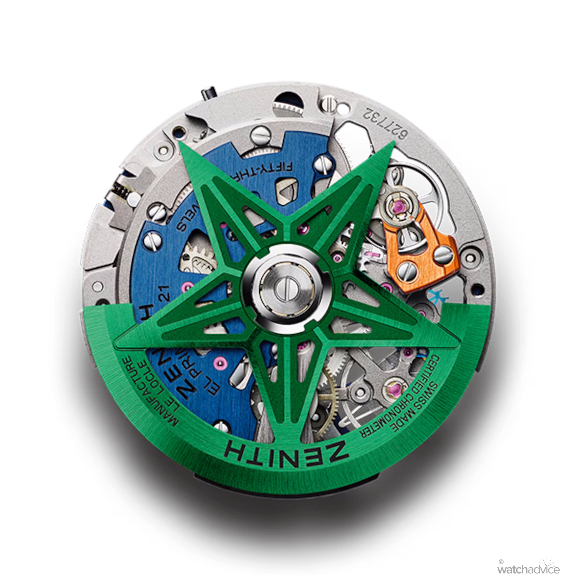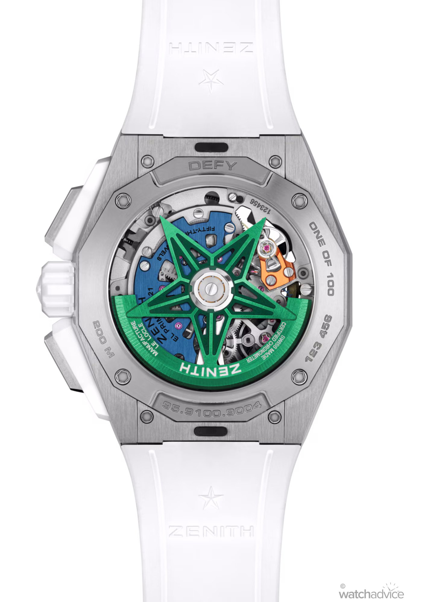 If you thought that was impressive, turn the watch over to be delighted by one of the most colourful casebacks in Swiss watchmaking. Firstly, the movement bridge is coloured blue for the white ceramic model, while the chronograph escapement is bright orange (white ceramic model) or a light pink/purple colour for the black ceramic timepiece. The skeletonised rotor, shaped into Zenith’s iconic five-pointed star, continues this chromatic expression with a striking green finish (white ceramic) or a bold electric blue (black ceramic). Together, these elements create a dynamic, multi-layered burst of colour that transforms the El Primero 9004 into a true “mechanical rainbow” on the wrist.