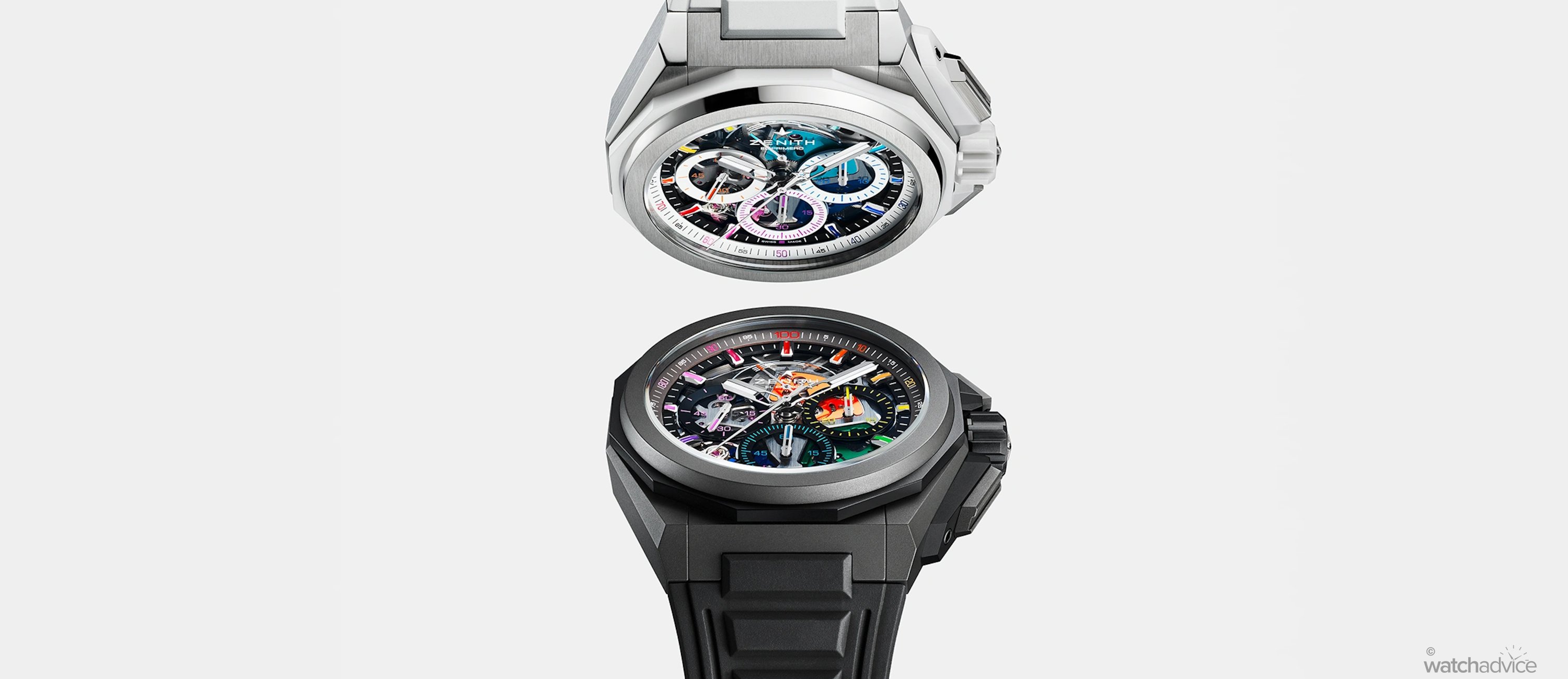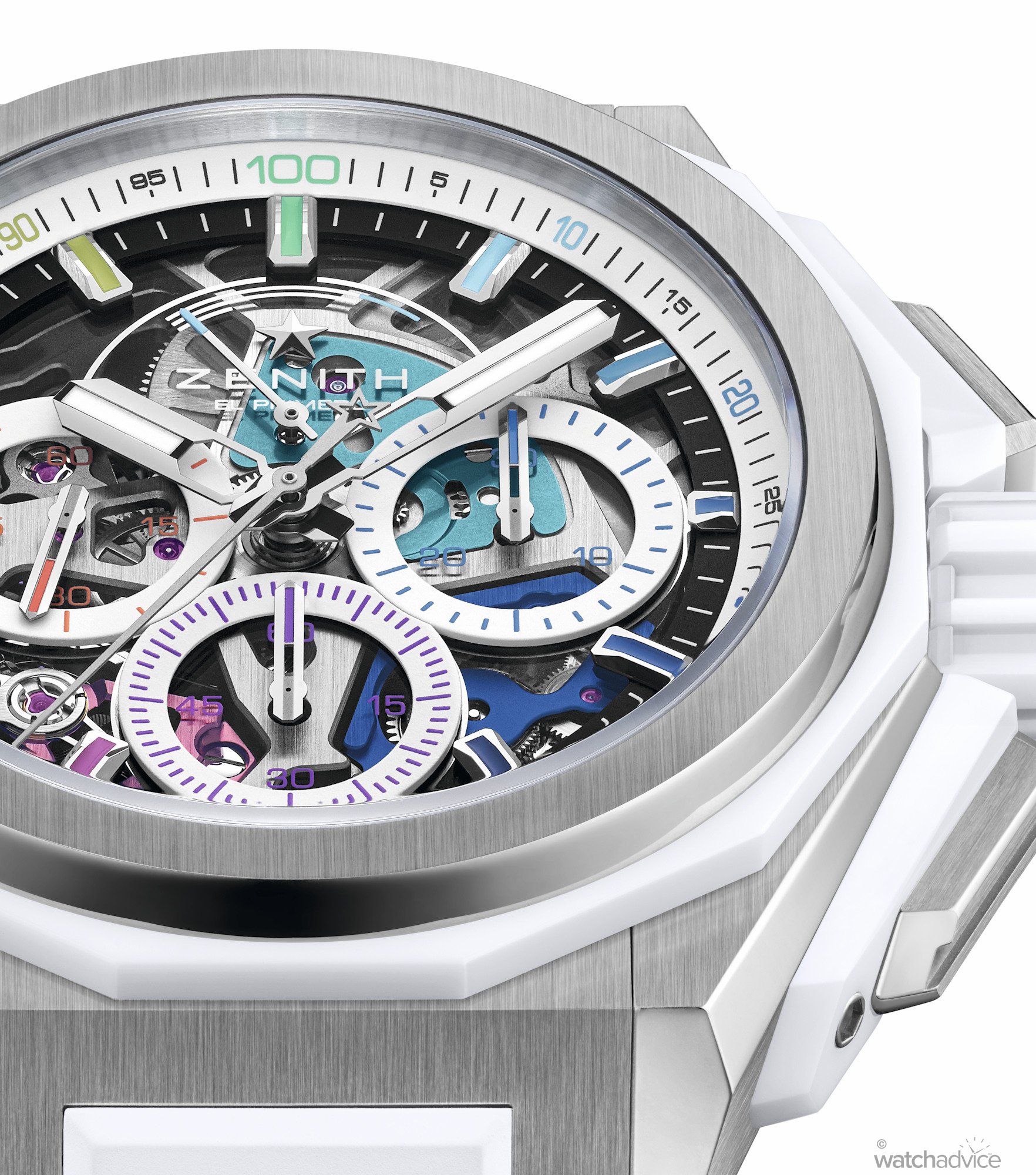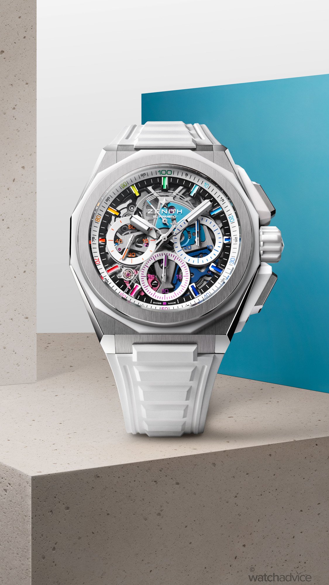The dodecacognal bezel, crown, and pusher protectors are created in the colour ceramic material, offering an overall different contrasting aesthetics. The microblasted case with black ceramic elements has a subtle appearance, which is countered by the vibrant and colourful dial display. The white ceramic version, however, takes the complete opposite approach and amplifies the watch’s coloured aesthetic, enhancing the watch’s expressive, full-spectrum visual impact. The cases also offer real-world practicality, with 200m water resistance and include Zenith’s quick-change strap system, allowing you to instantly switch between the supplied rubber straps to the additional Velcro strap or titanium bracelet.