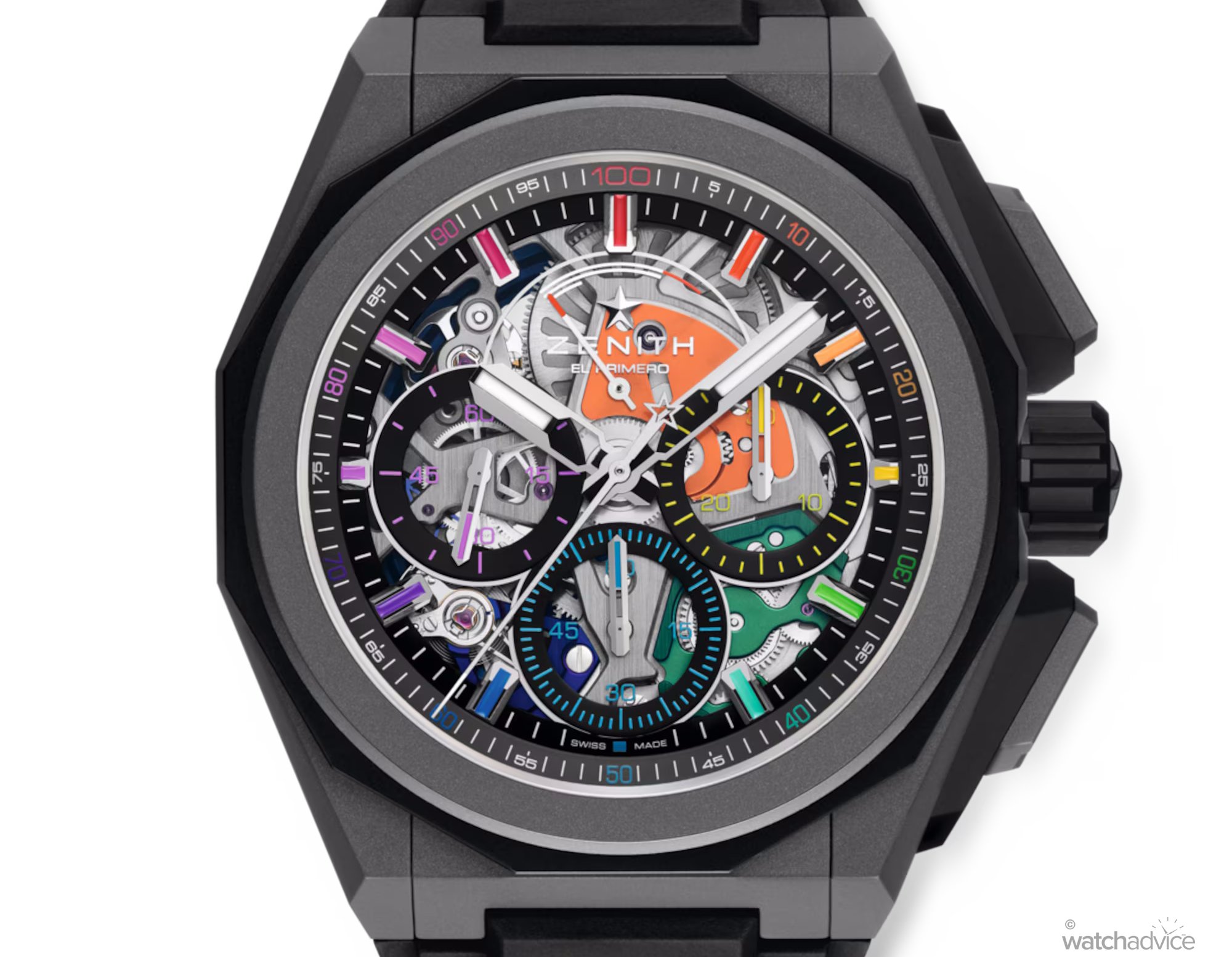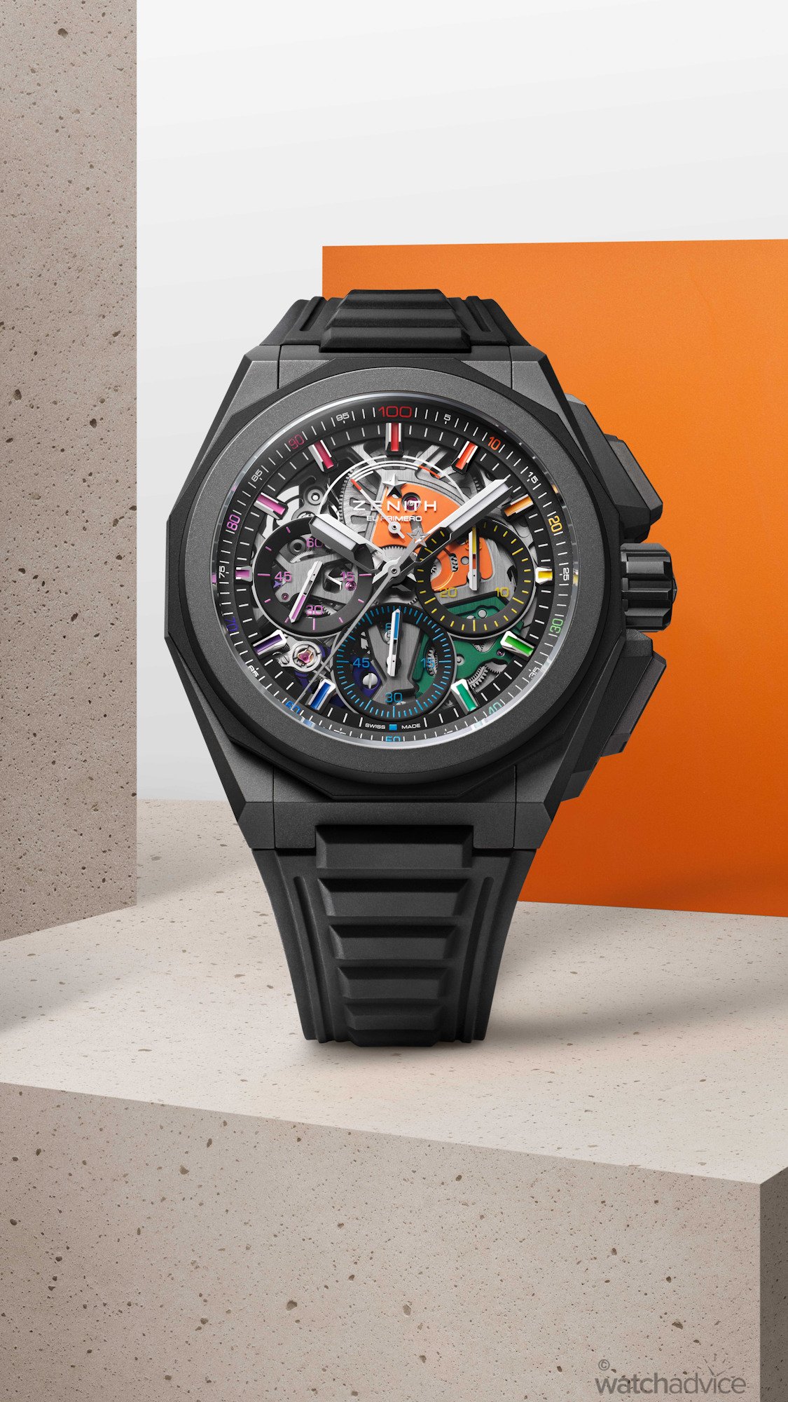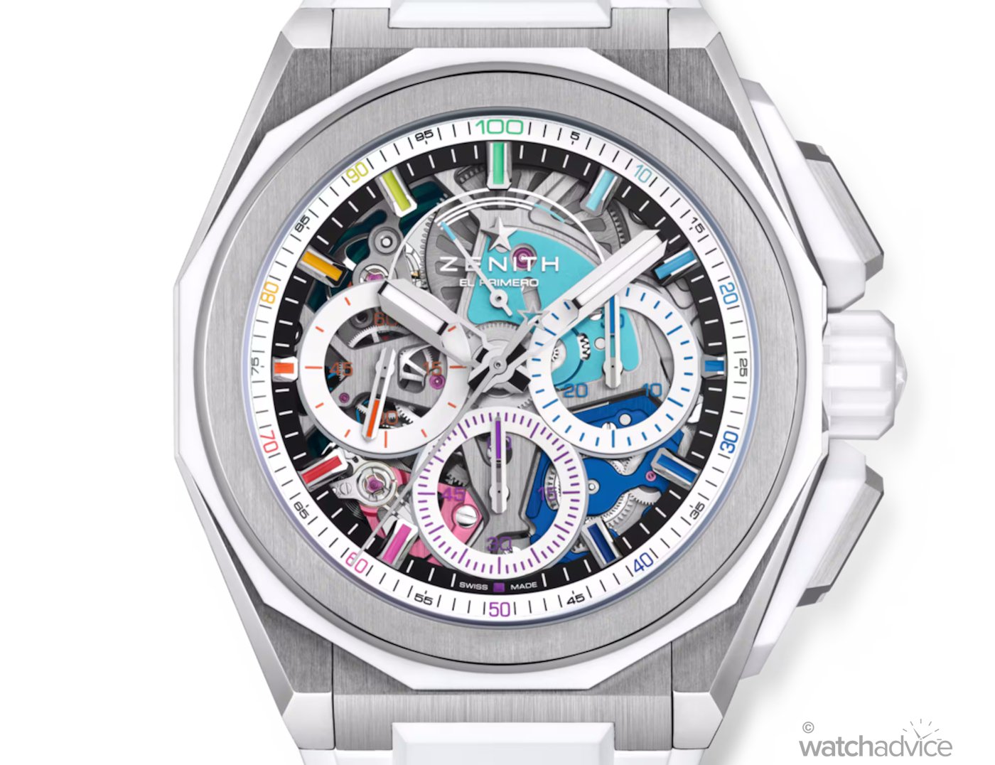 The dodecacognal bezel, crown, and pusher protectors are created in the colour ceramic material, offering an overall different contrasting aesthetics. The microblasted case with black ceramic elements has a subtle appearance, which is countered by the vibrant and colourful dial display. The white ceramic version, however, takes the complete opposite approach and amplifies the watch’s coloured aesthetic, enhancing the watch’s expressive, full-spectrum visual impact. The cases also offer real-world practicality, with 200m water resistance and include Zenith’s quick-change strap system, allowing you to instantly switch between the supplied rubber straps to the additional Velcro strap or titanium bracelet.