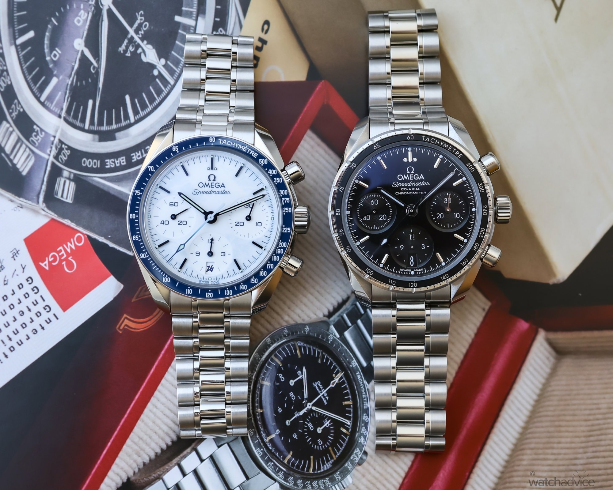 The new Omega Speedmaster 38 Winter 2026 Olympics edition (left) alongside the Speedmaster 42mm “Silver Snoopy Award” 50th anniversary edition.