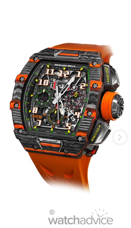 Introduced in 2018, the Richard Mille 11-03 Automatic Flyback Chronograph McLaren edition was the first jointly commissioned timepiece between the two powerhouses. It was created in close collaboration with McLaren, bringing together their mutual interests in unique design, new materials, and modern craftsmanship. Speaking of materials, the case of the RM 11-03 McLaren is made of “Carbon TPT® interlaced with Orange Quartz TPT®, resulting in an extremely resistant and lightweight case that pays tribute to an emblematic McLaren colour.” Being made from this material also makes the watch lightweight, a core concept of Richard Mille’s performance timepieces. Paired with a dynamic skeletonised dial, integrated chronograph pushers, and bright orange accents throughout, the RM 11-03 becomes the ideal symbol of the McLaren–Richard Mille partnership: bold, technical, and built for speed both on and off the track.