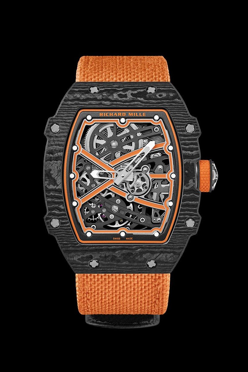 The second Richard Mille McLaren Edition on this list is the 67-02. Made specifically for McLaren and Norris, this Richard Mille 67-02 retains the signature skeletonised movement bridge design but is not coloured with a bright orange hue to match the racing team’s colours. The movement bridge uses a titanium plate that is only a 4/10th of a millimeter thin! The elements in the movement are finished manually, and include different finishing techniques like anglage and DLC coating to give it a unique character. The case is also made from Carbon TPT®, which keeps the timepiece lightweight but still tough enough to handle the extreme conditions of Formula 1. This is a watch built for performance and championship winners like Norris!