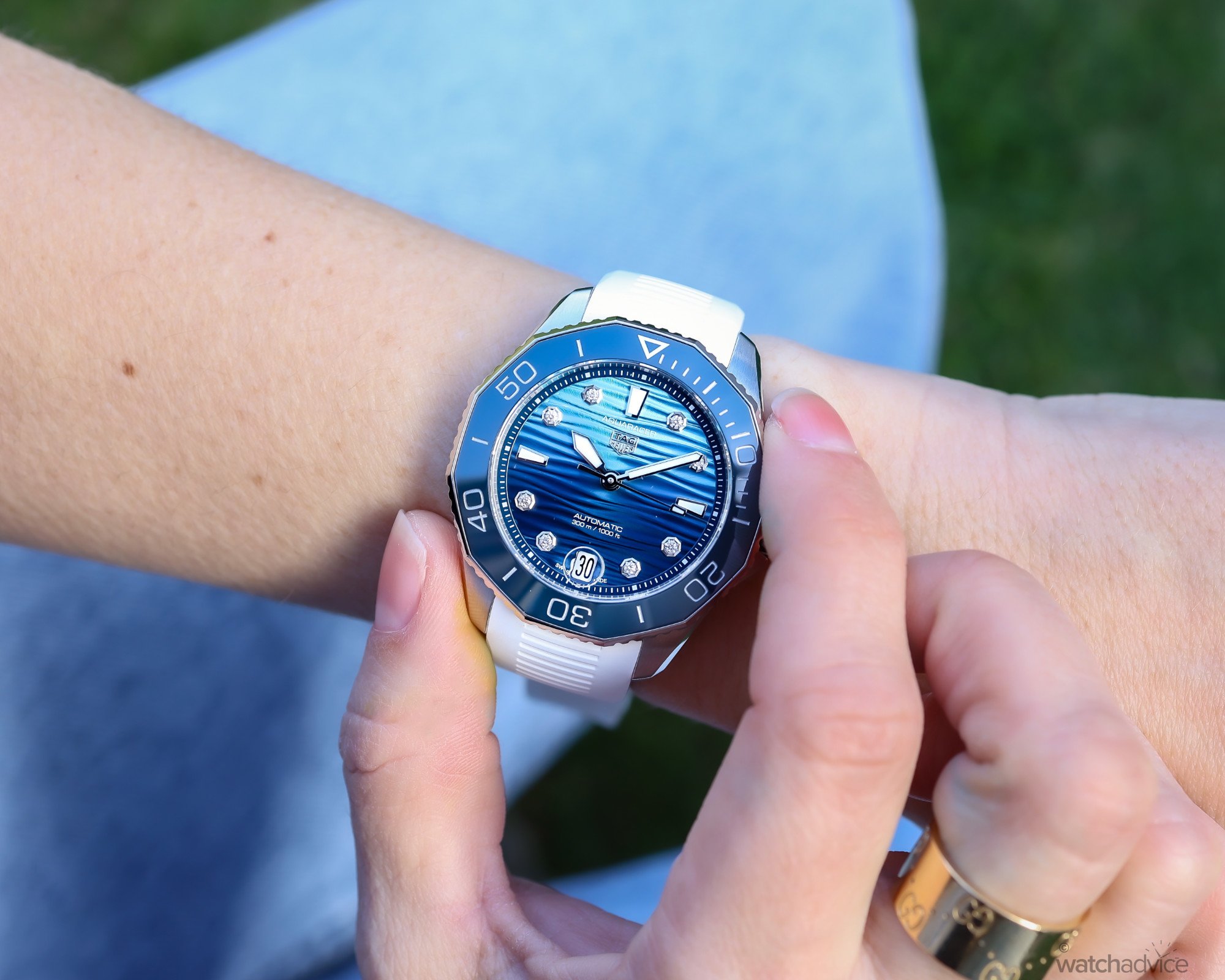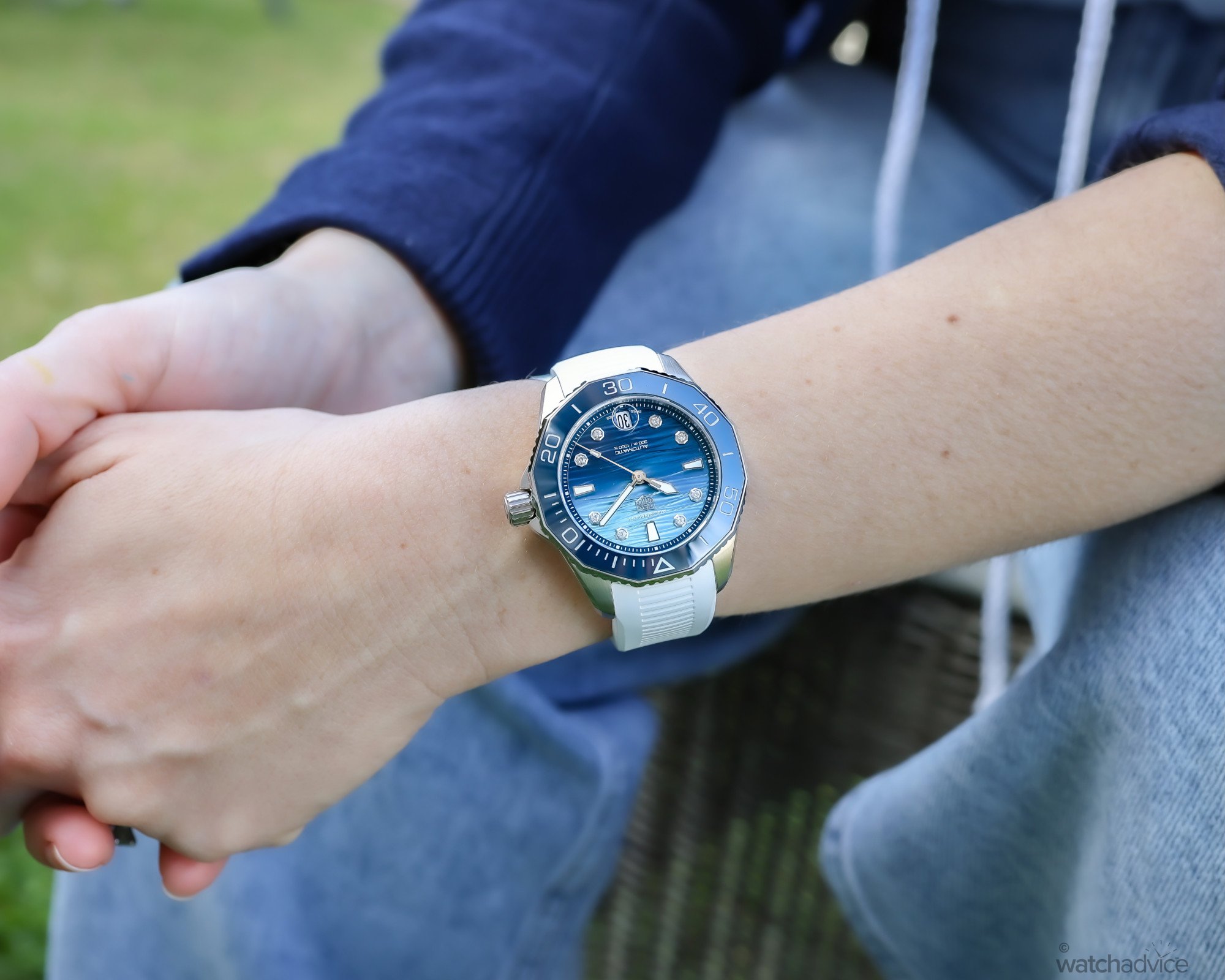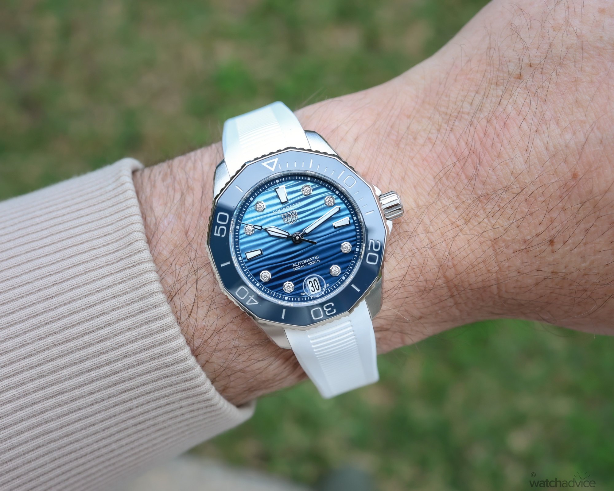 At 36mm, and 11.4mm thick, the Aquaracer Professional “Summer Diamonds” proportions are spot on, particularly for smaller wrists, but importantly, the watch never feels diminutive or underpowered. From Dominique’s perspective, this is probably as large as she would go based on her preferences. The 34mm pink dial Aquaracer Solargraph was probably better proportioned for her smaller wrists, but the rubber strap on this watch does take some of the extra 2mm out of the look and feel.