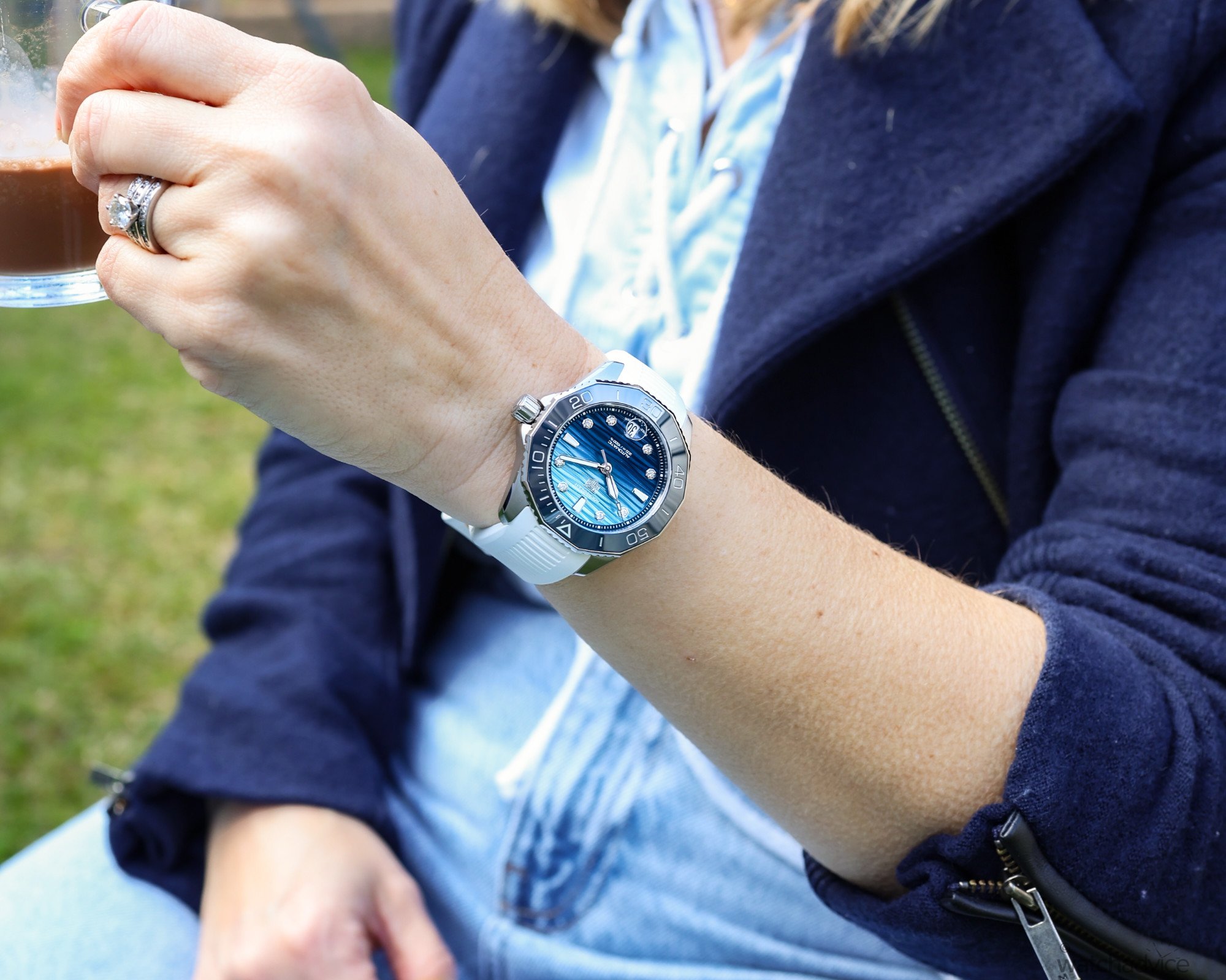 “It’s one of those watches that just feels good on my wrist,” she says. “I’m more of a classic watch type of girl, less so sporty, but in this case, the sporty case but doesn’t feel too big or clunky. The blue dial is beautiful; it changes with the light, but I would like to see it be a little more sublte. The diamonds do add just a subtle touch of elegance, however, without being over the top. The strap is soft and comfortable, so I barely notice I’m wearing it. Honestly, it’s easy to wear from a casual day out to something more dressed up, which for me is important as I don’t have watches for every occasion.”