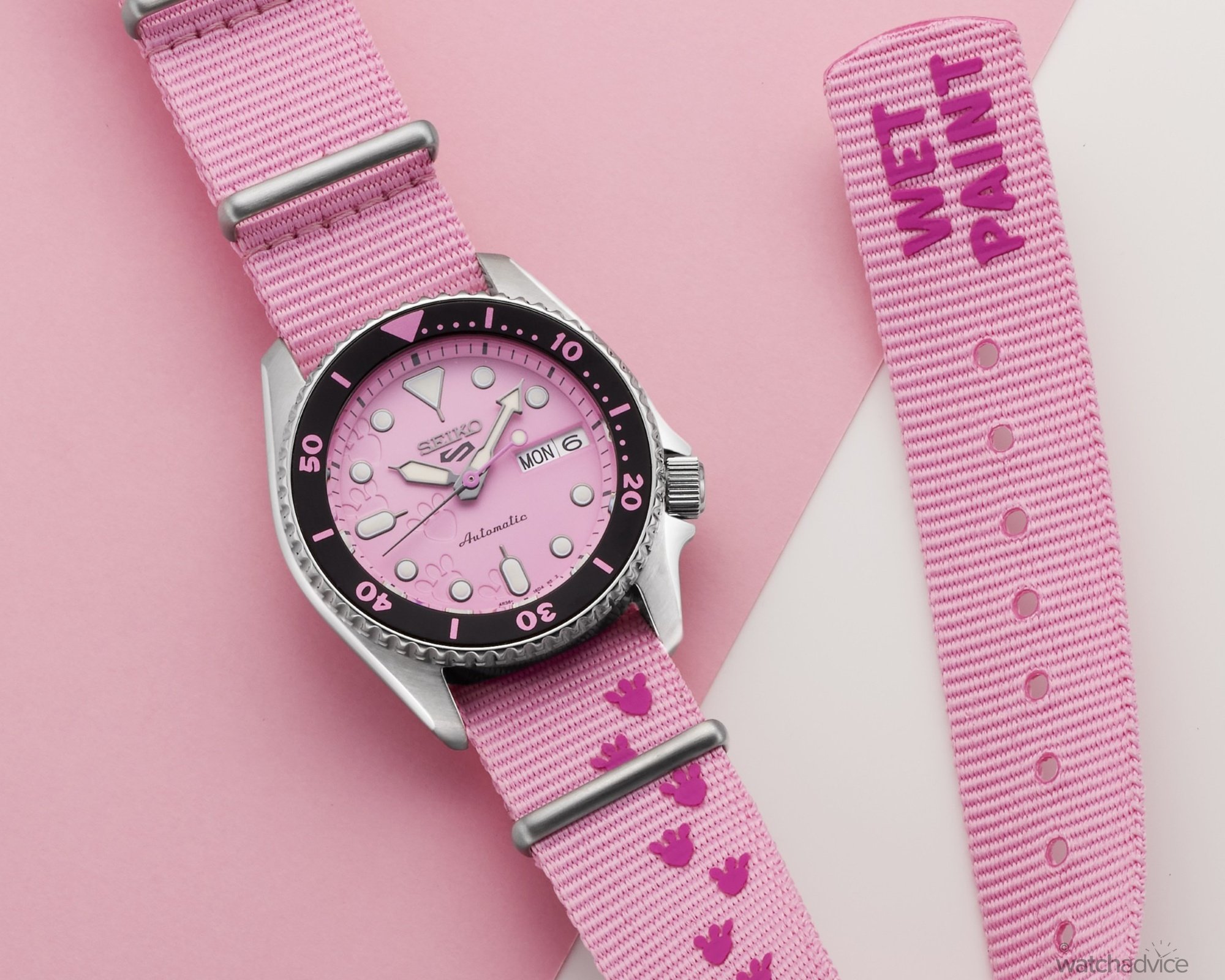 As a limited edition of 9,999 pieces, each watch carries its individual model number around the caseback edge. The package is rounded out with two strap options: a stainless steel bracelet or a bright pink nylon NATO strap, complete with additional panther footprints and a ‘WET PAINT’ text that once again references The Pink Phink.